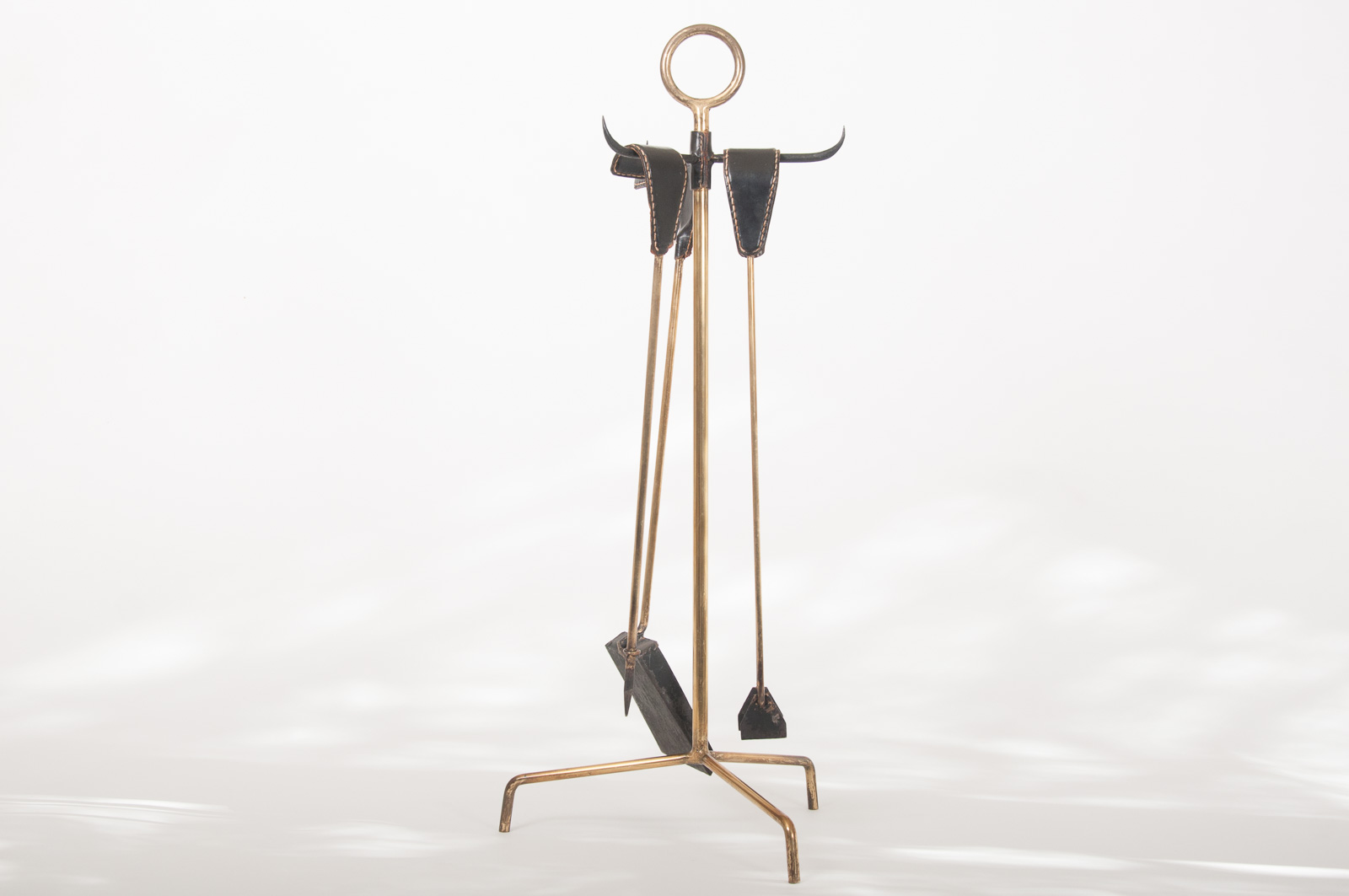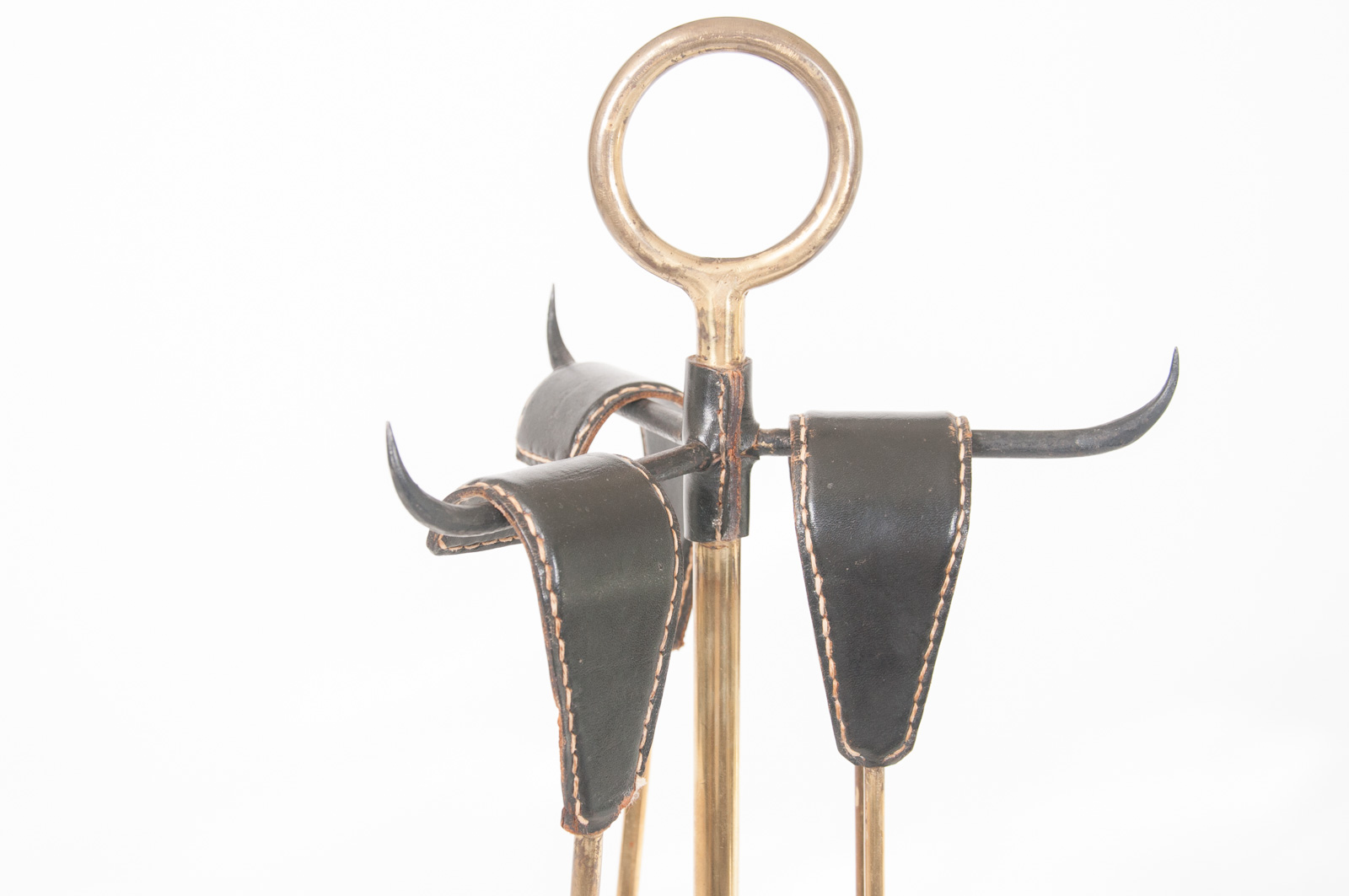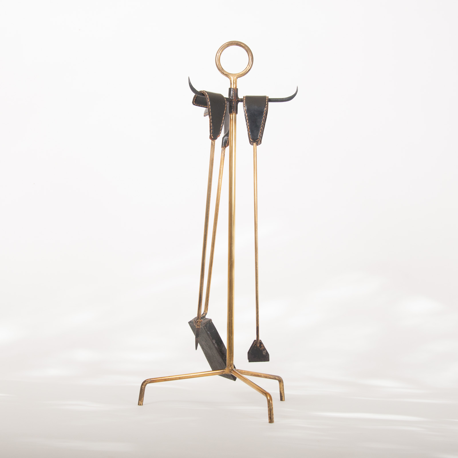 mid century Jacques Adnet style leather and brass set of firetools
