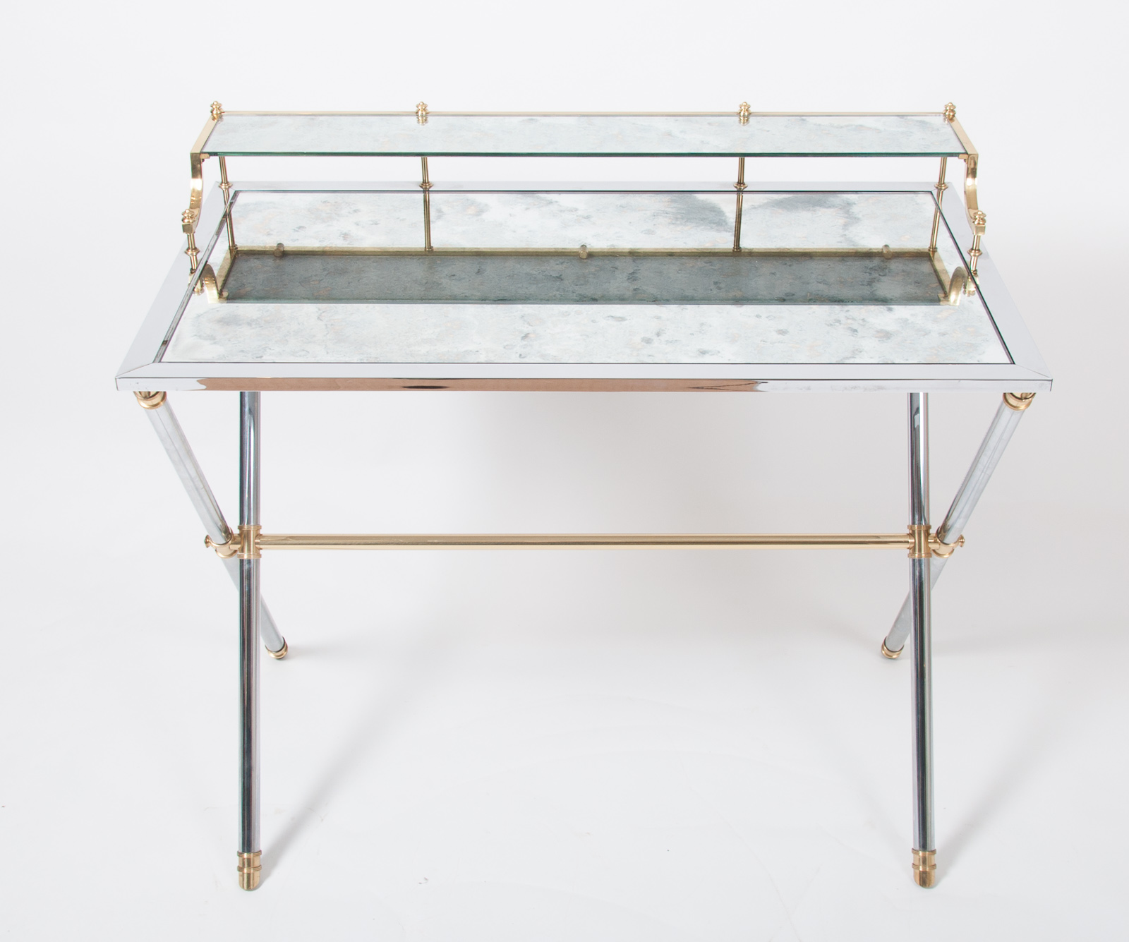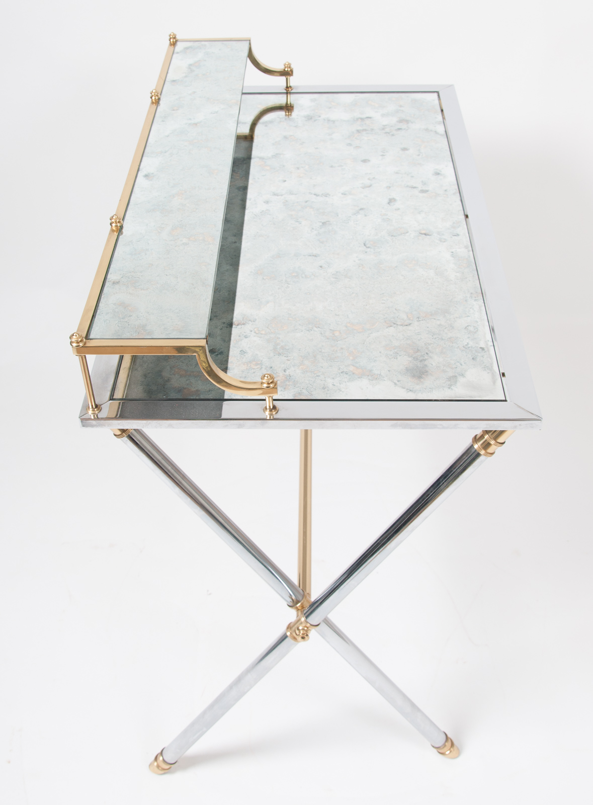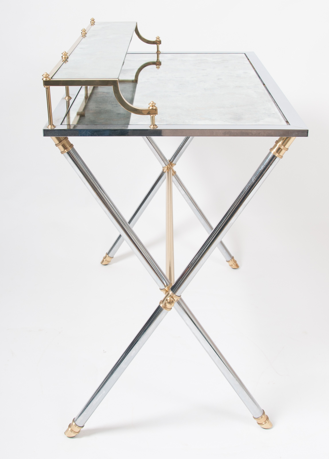 Maison Jansen brass and steel desk, silver and gold patina with a rectangular mirrored top resting on a cylindrical X-frame base connected by a stretcher. Stamped “Jansen, 9 Rue Royale” France circa 1970