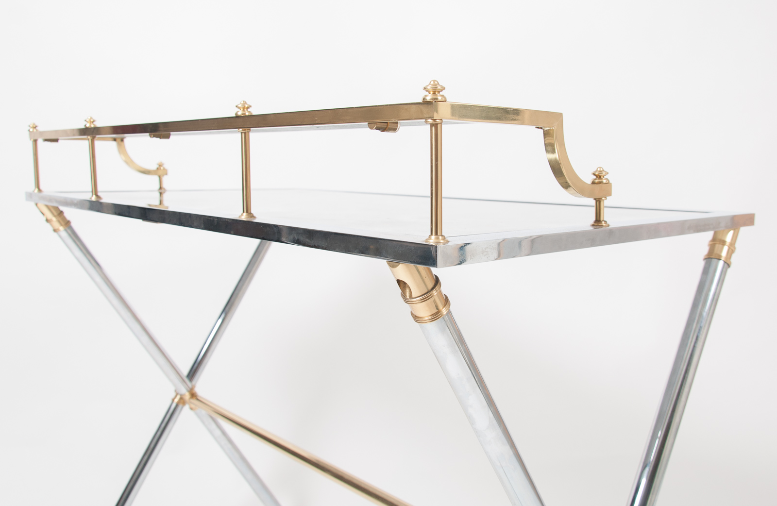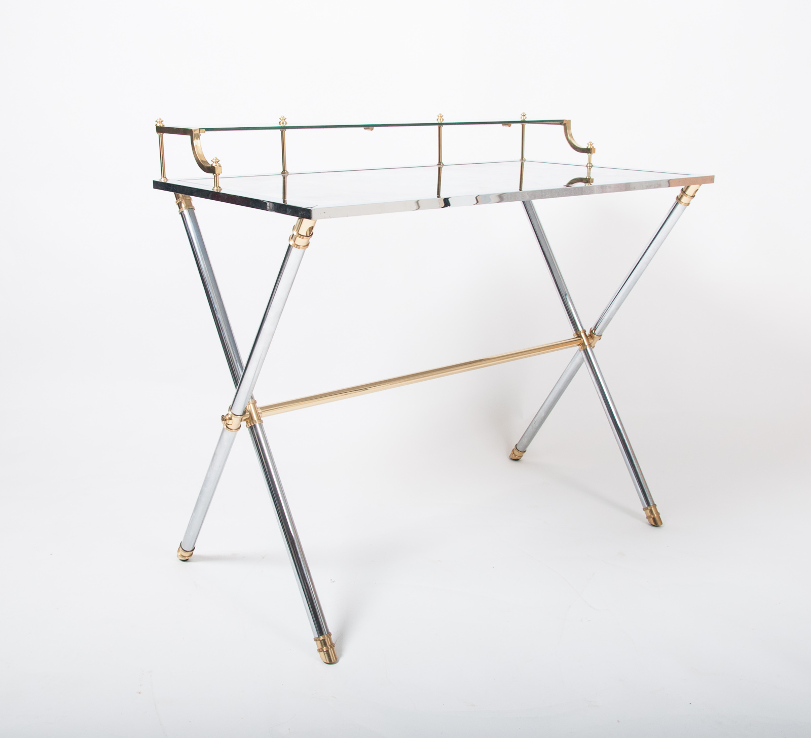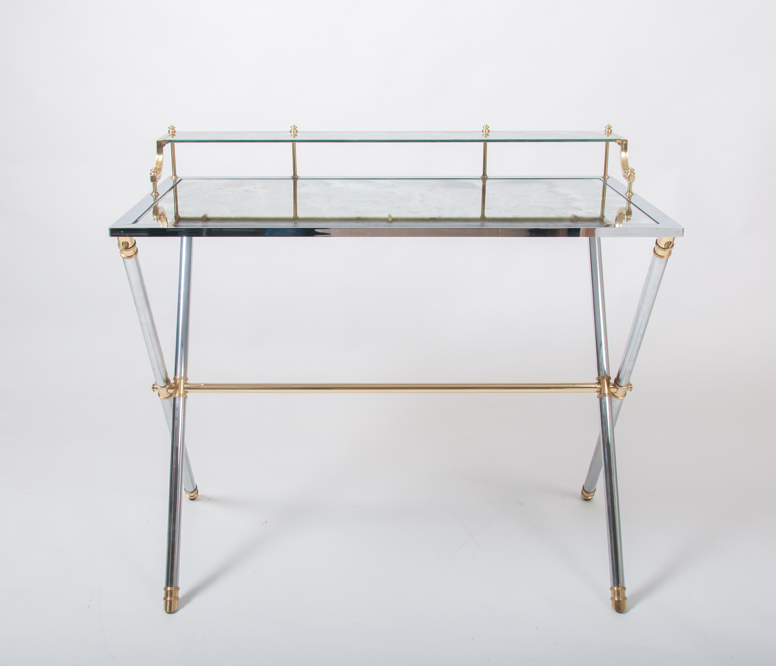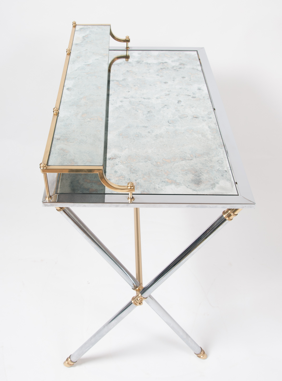 Maison Jansen brass and steel desk, silver and gold patina with a rectangular mirrored top resting on a cylindrical X-frame base connected by a stretcher. Stamped “Jansen, 9 Rue Royale” France circa 1970