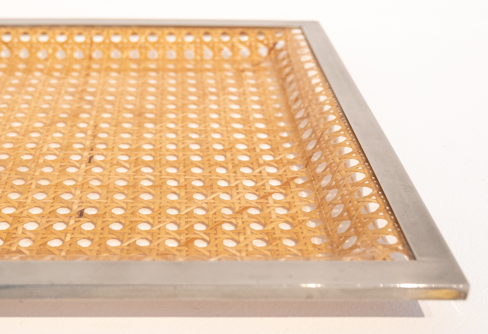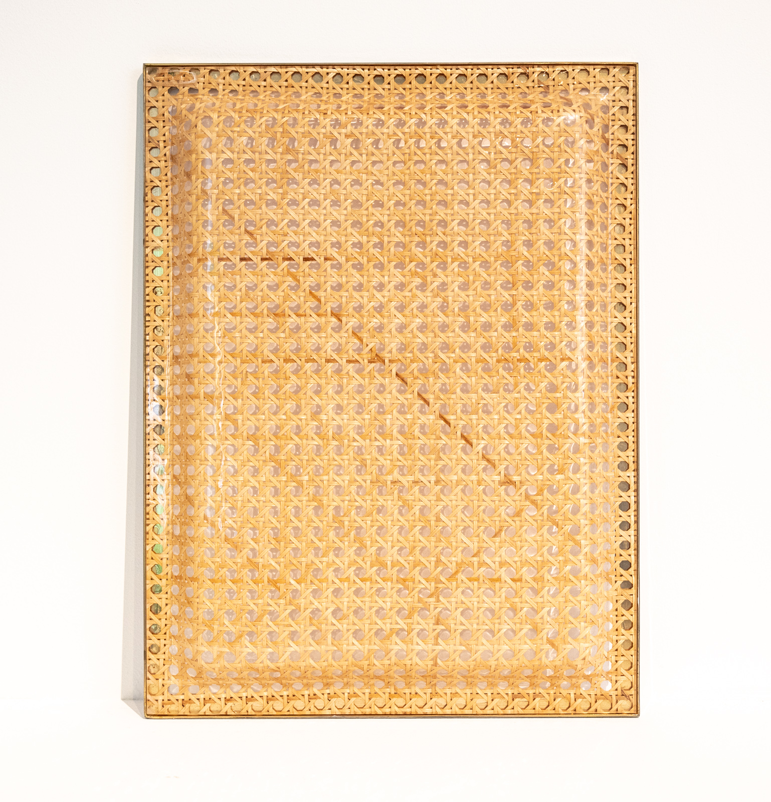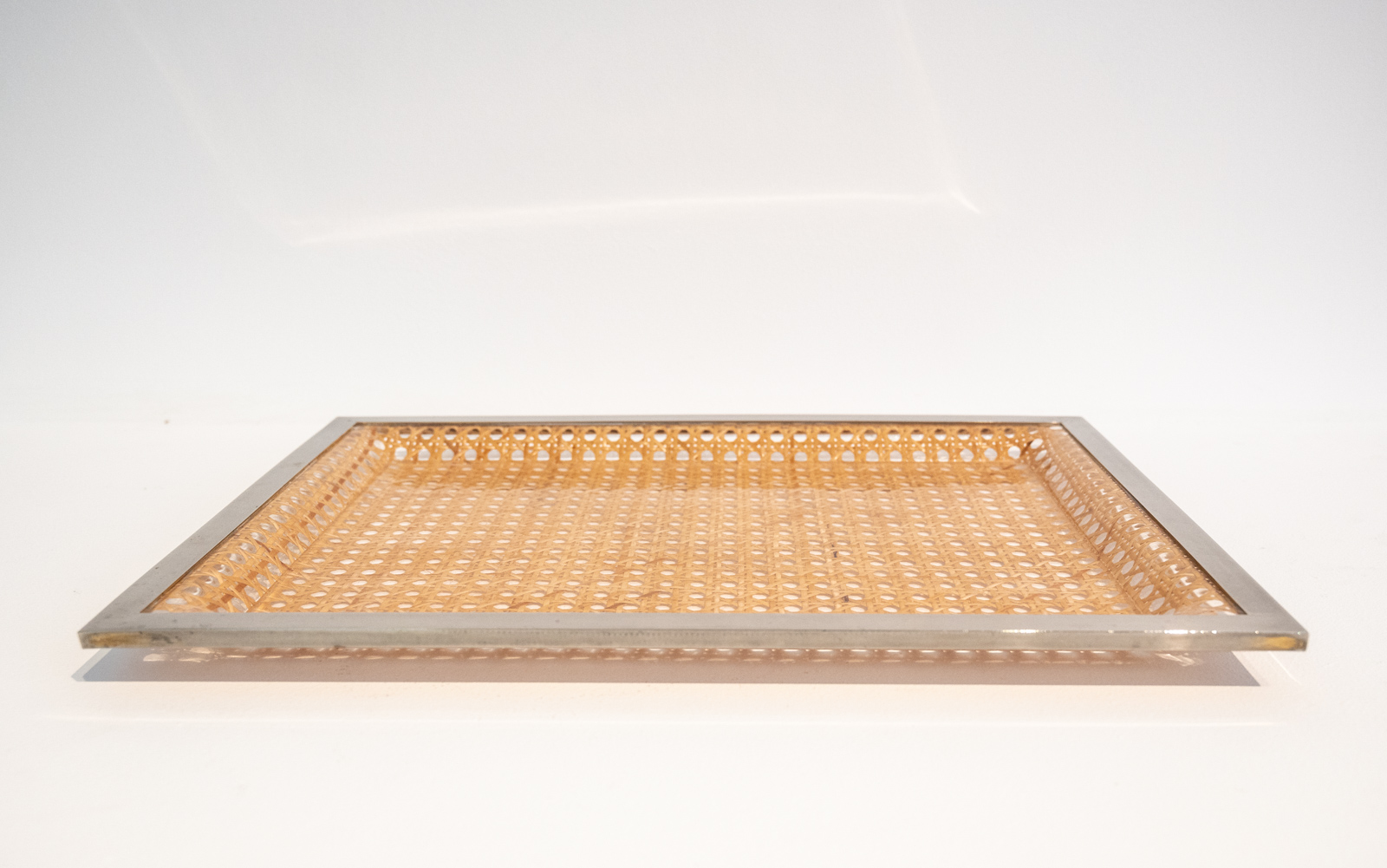 mid century serving tray comprised of a sheet of moulded Lucite with embedded rattan/cane work possibly supplied by Christian Dior Home in the manner of Gabriella Crespi.