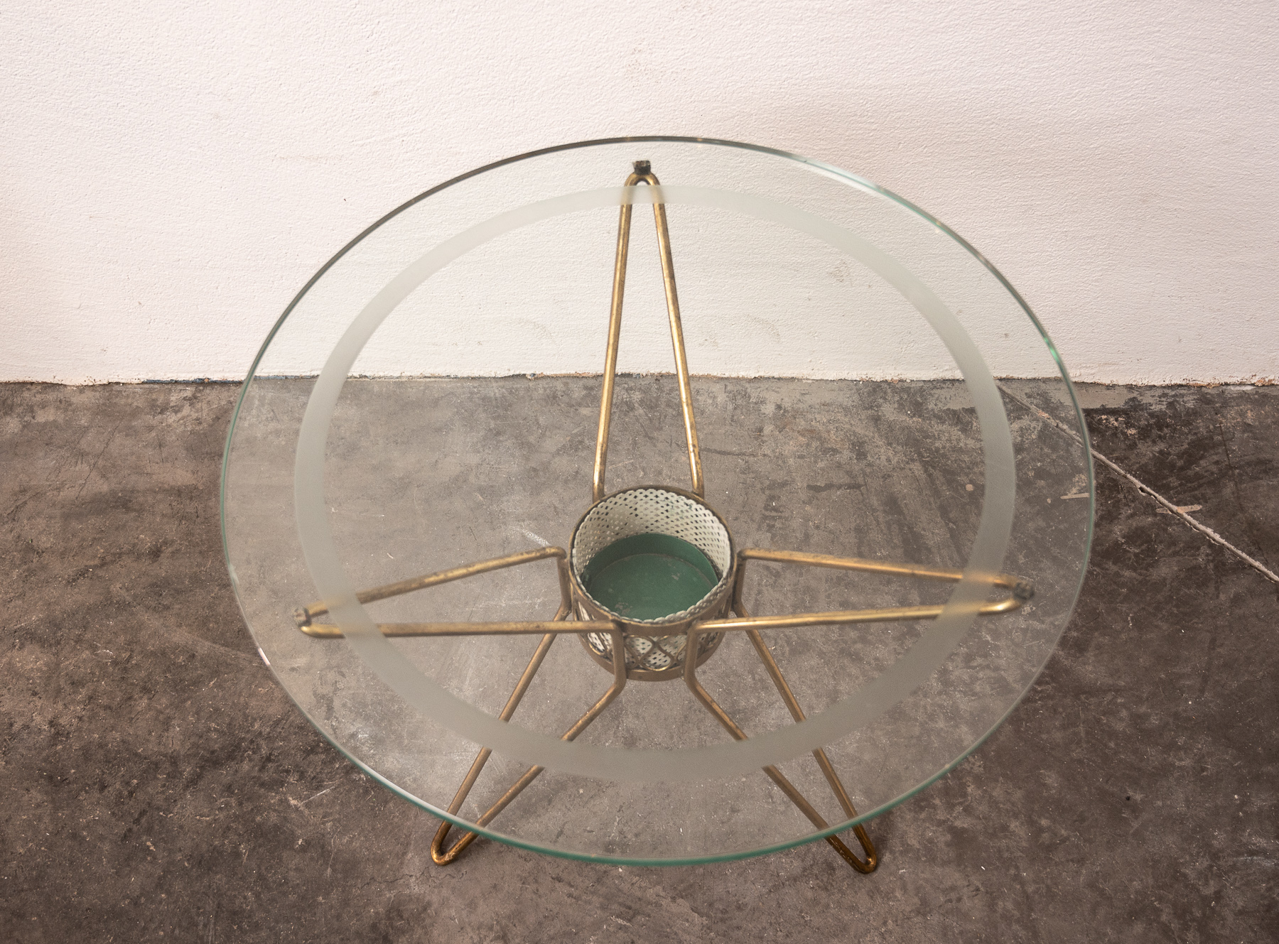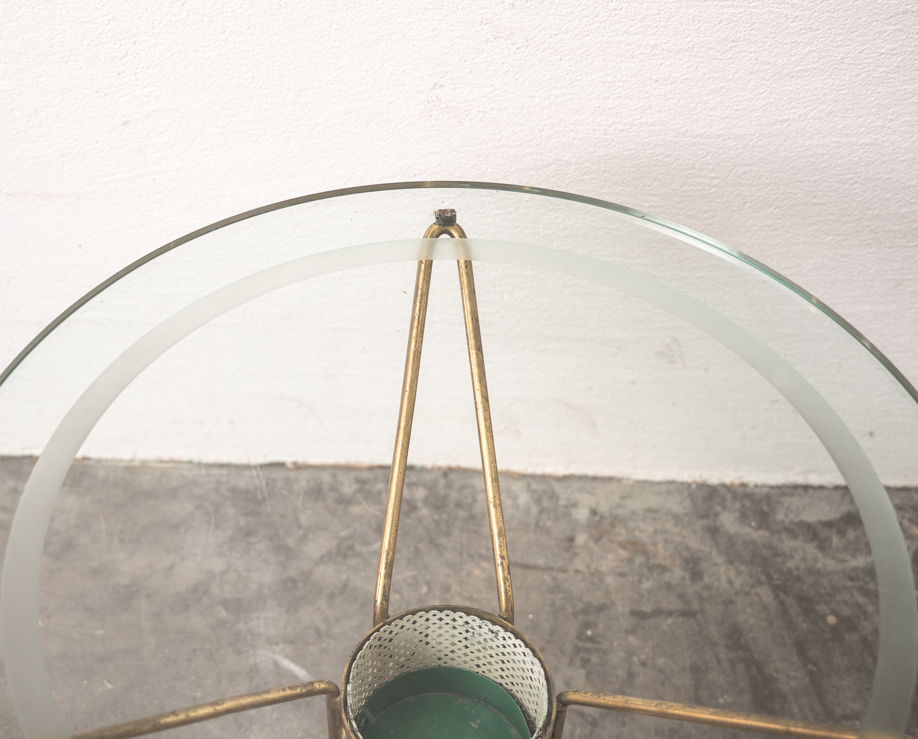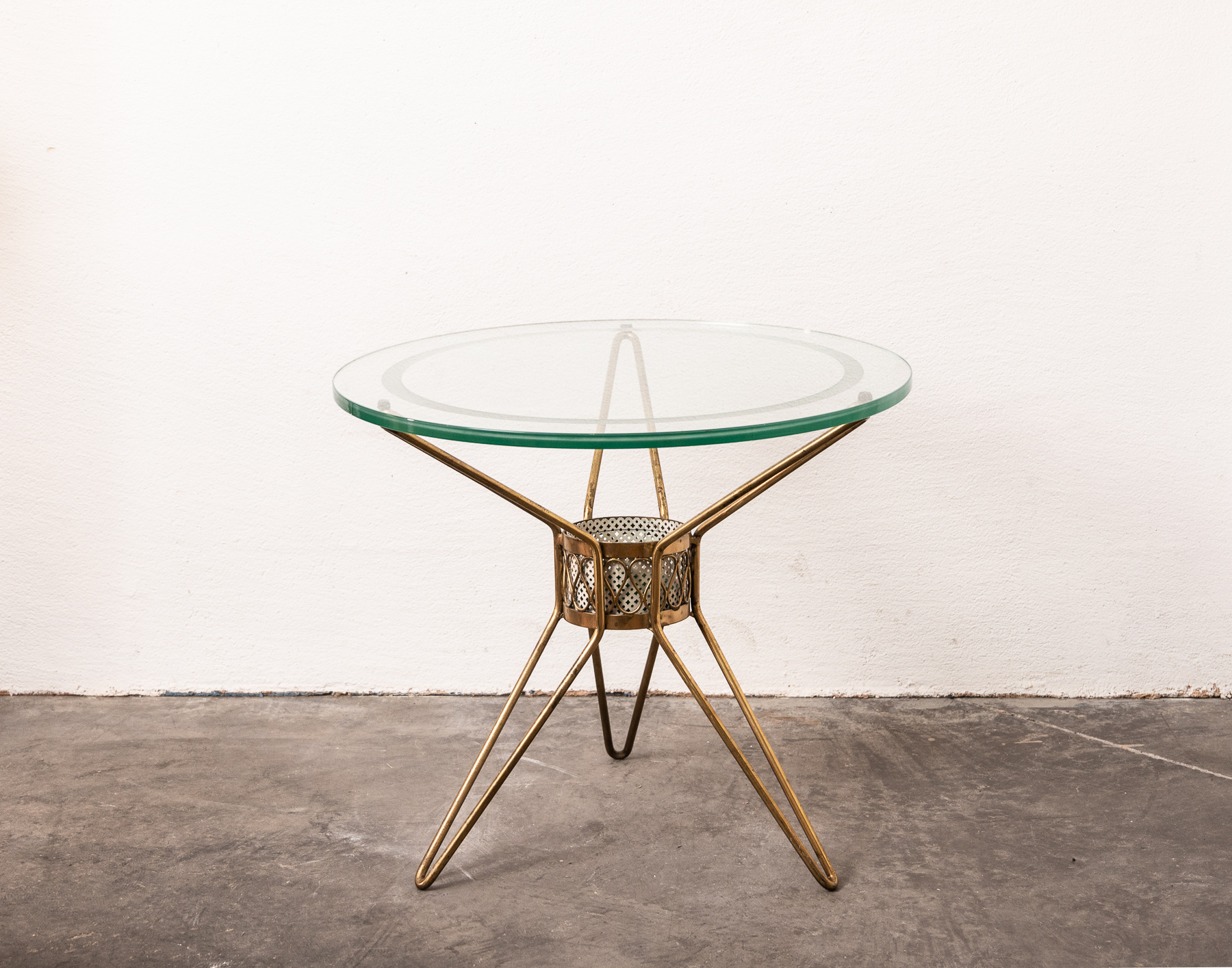 circular Brass, glass and steel tripod low table attributed to Cesare Lacca.