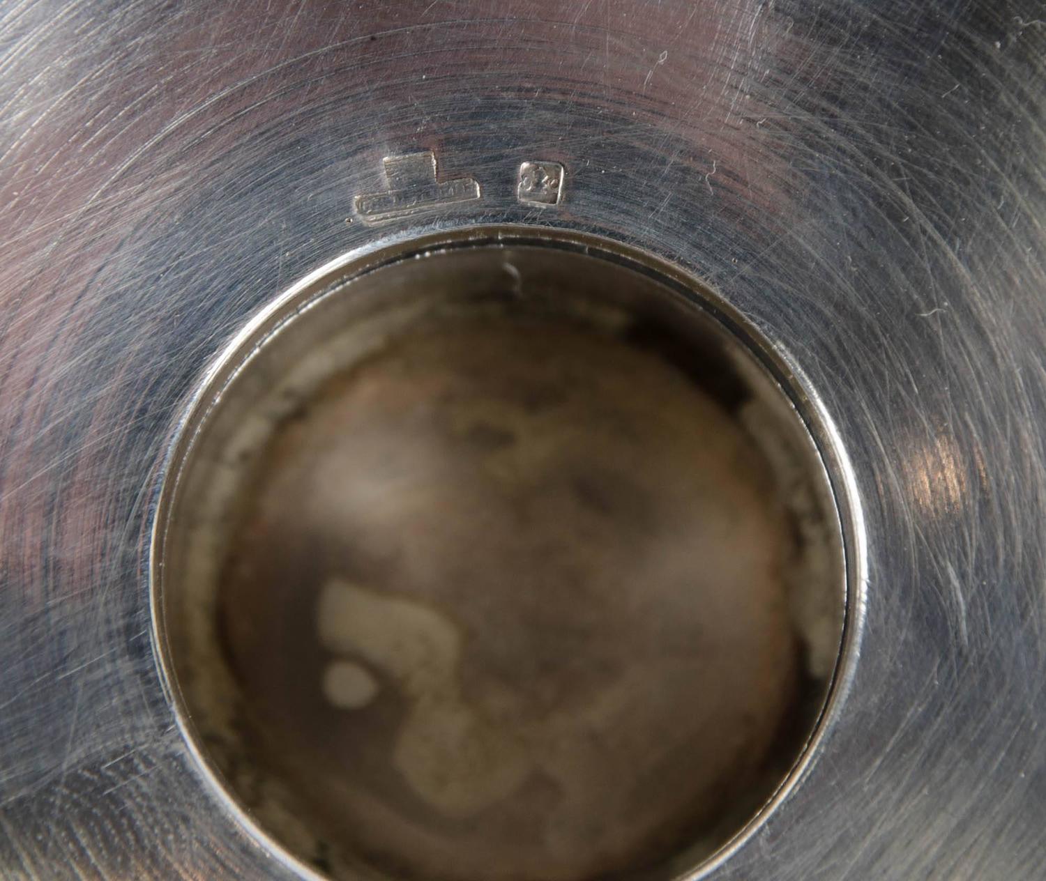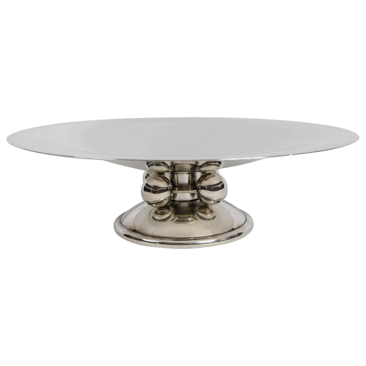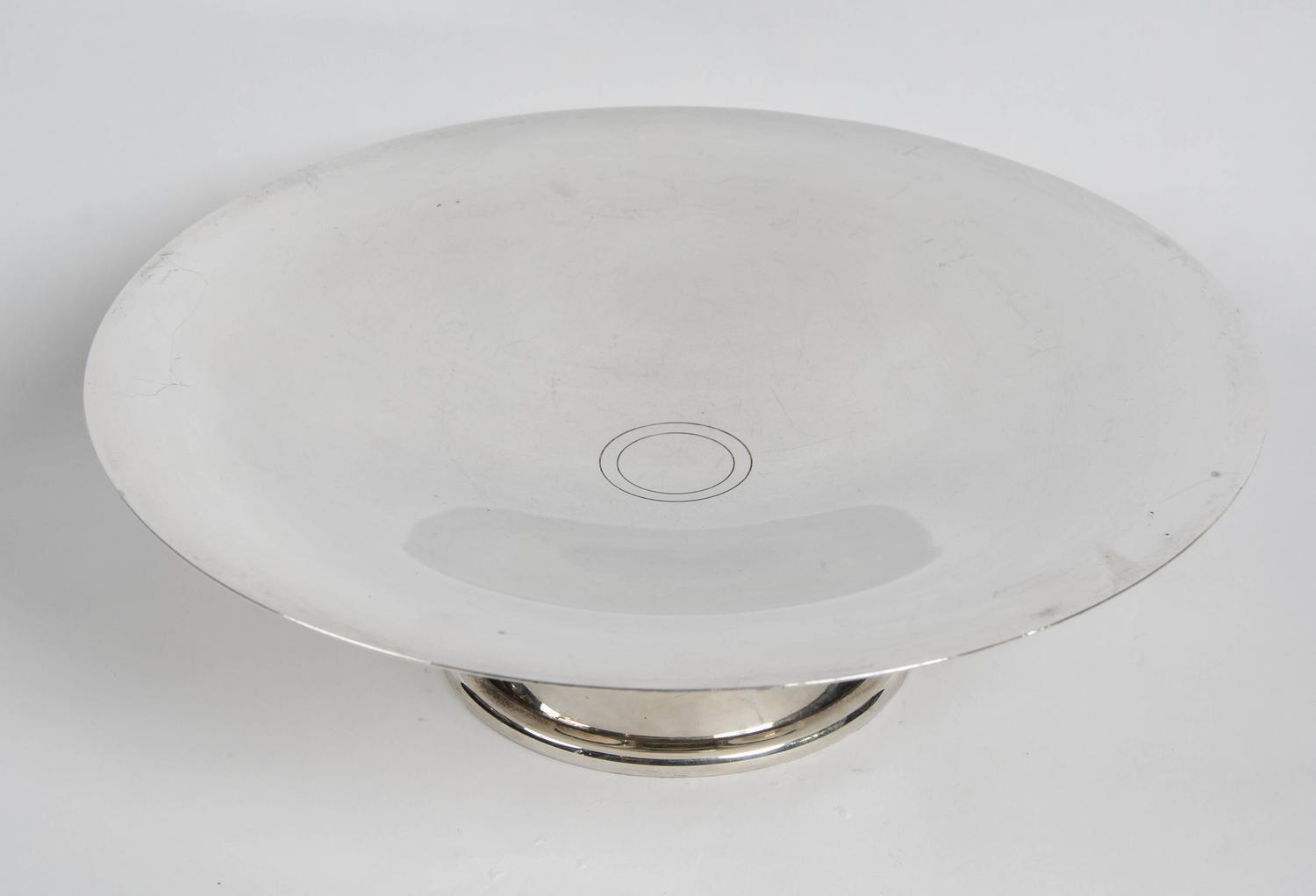 A French Art Deco silver plated tazza by Luc Lanel for Christofle, circa 1935 designed for the S.S. Normandie. Lanel designed this model for the S.S. Normandie’s 300 foot long first class dining room. Christofle manufactured Lanel’s designs for the ocean liner’s famously luxurious Art Deco interiors. Lanel’s affiliation with Christofle lasted from 1920-1946.