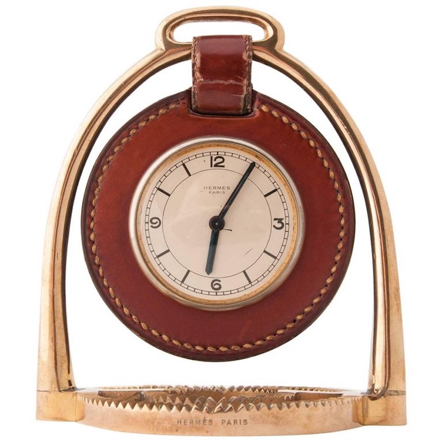 | Condition | Good. The clock is in good working order and keeps good time. The leather has losses to the hook that holds it to the frame, the brass stirrup has an old repair to the right hand upright at the base. |
