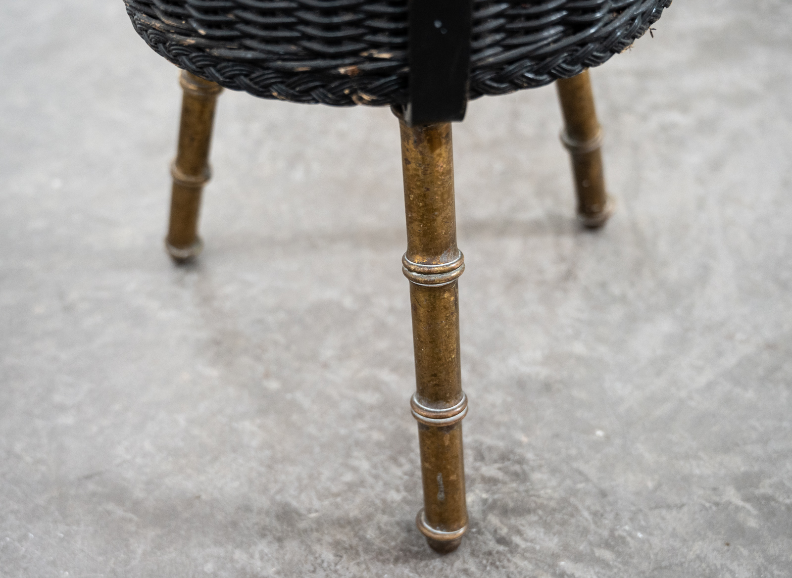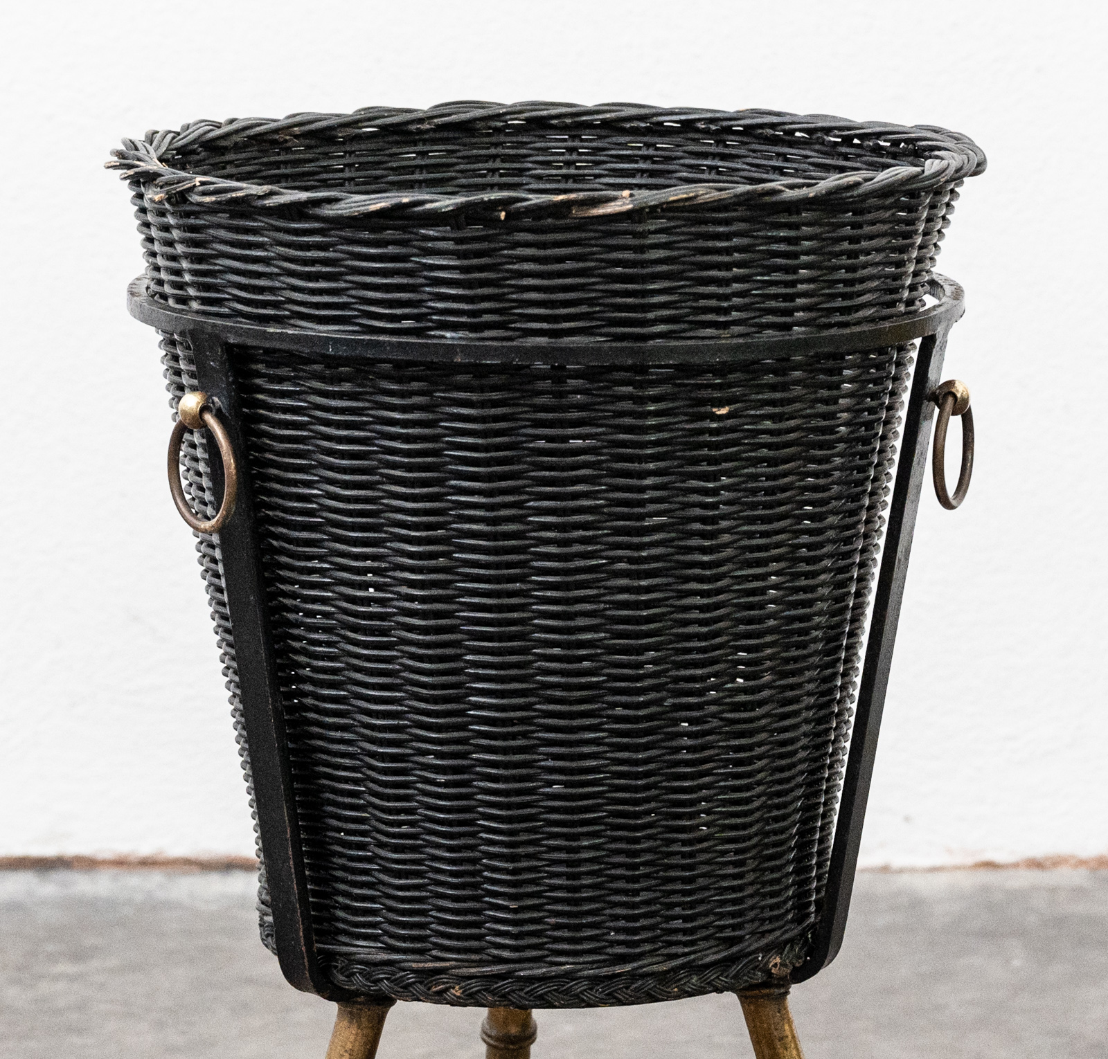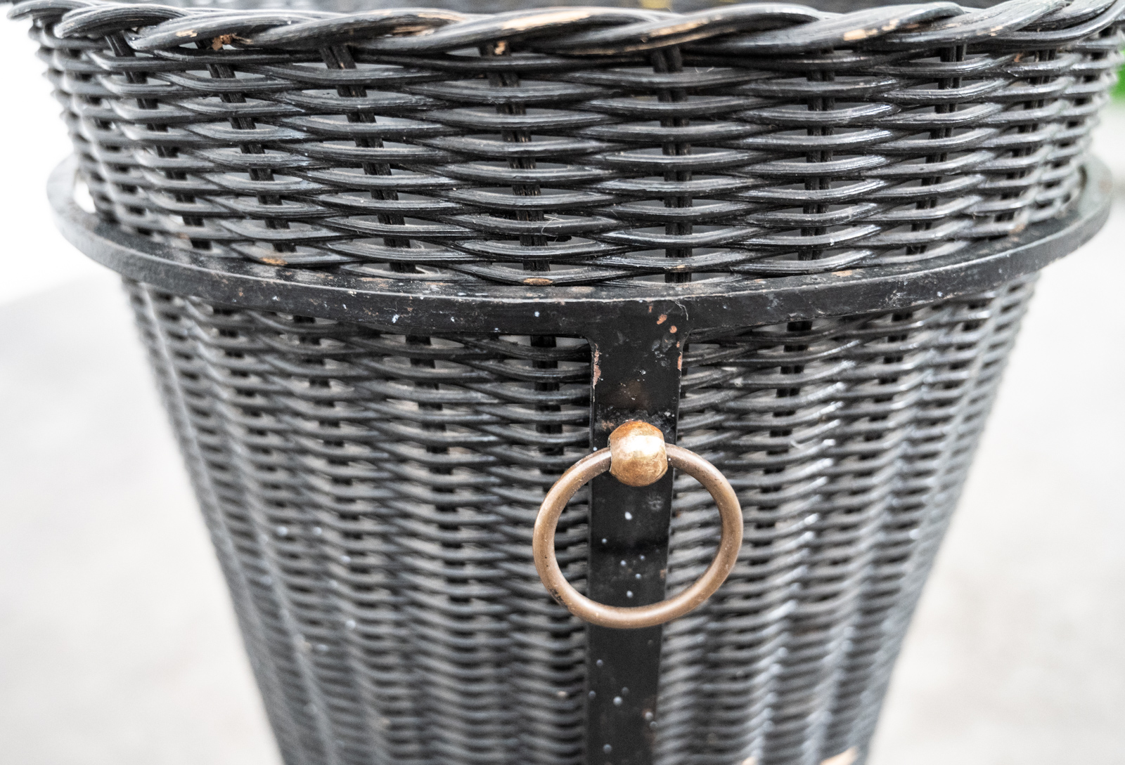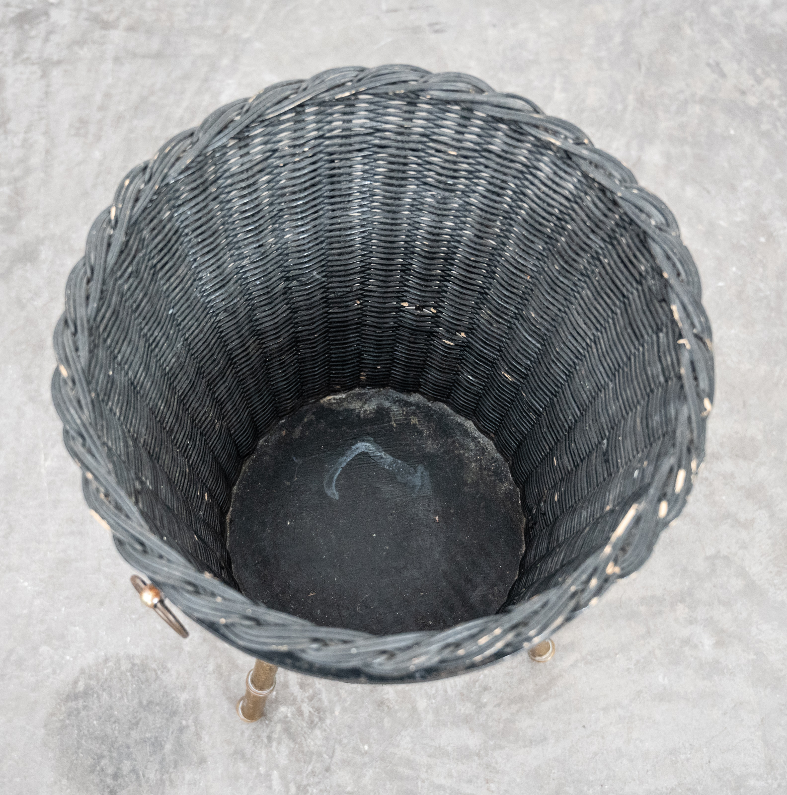 Rare mid century rattan and steel wastepaper basket/jardiniere by Jacques Adnet with brass ring handles supported on three brass faux bamboo legs