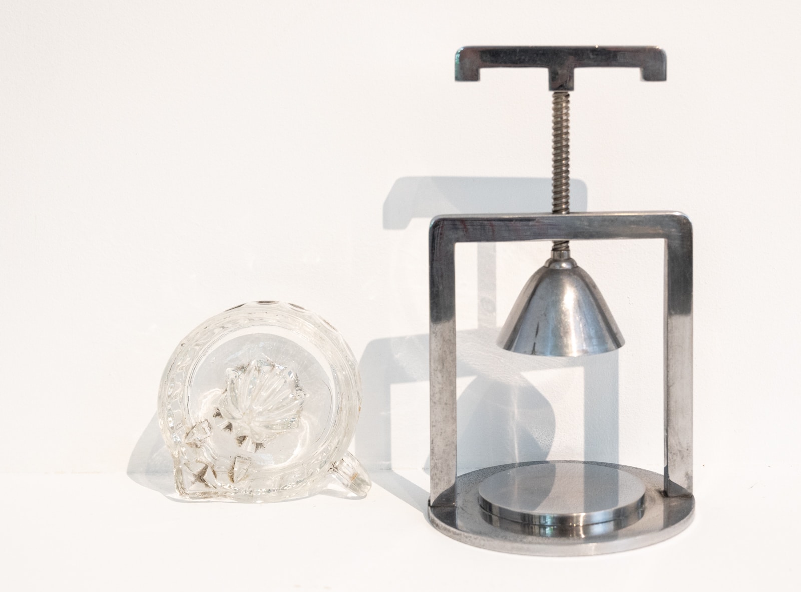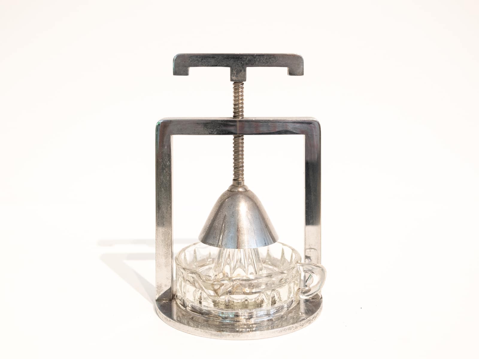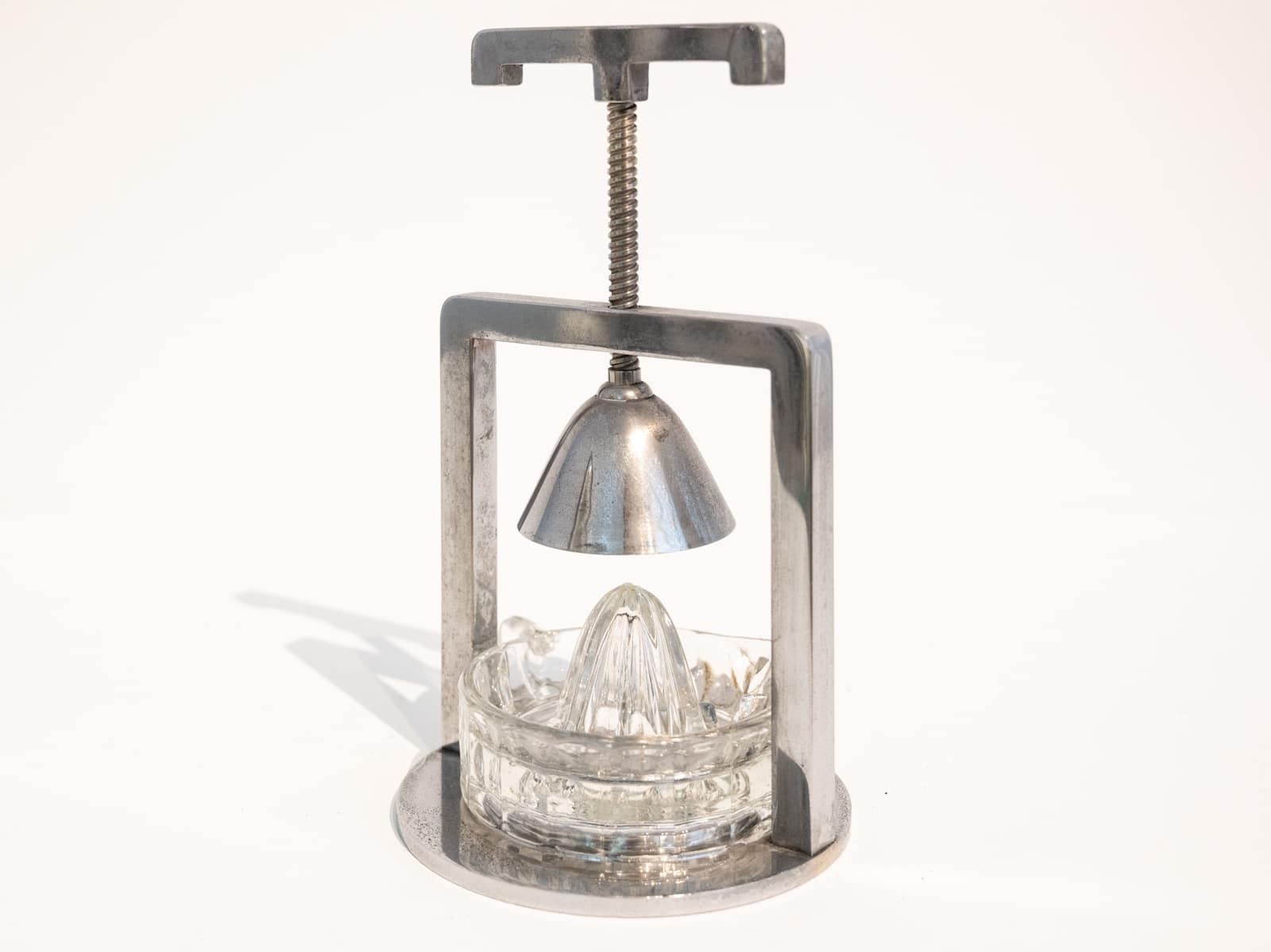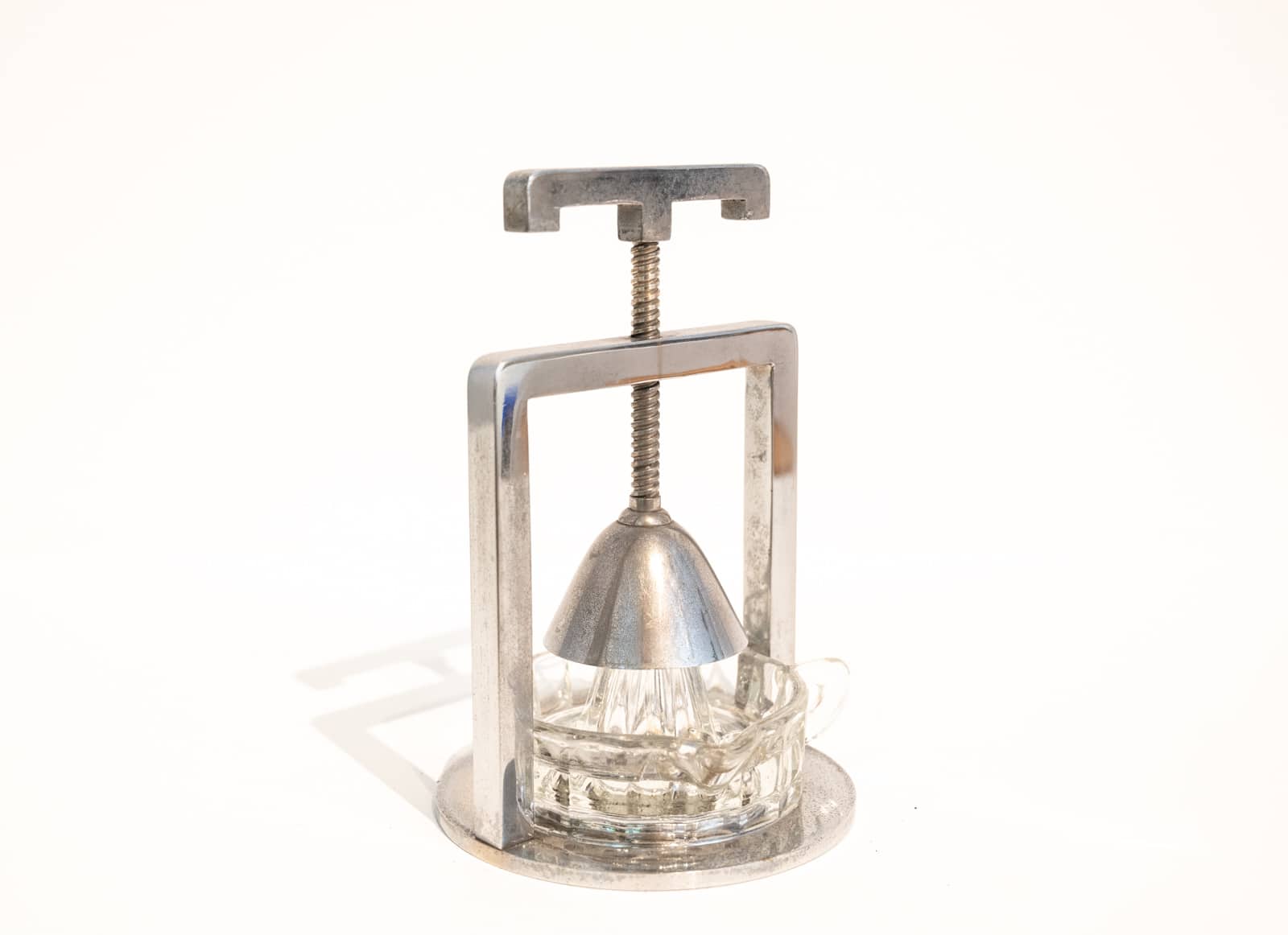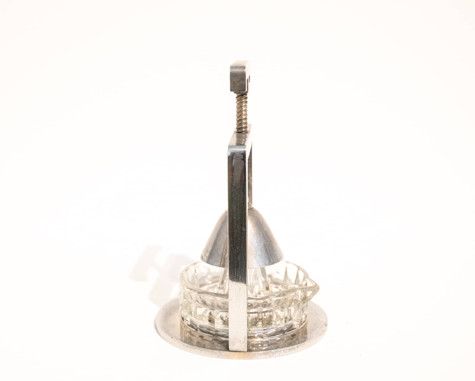 A chromed metal and glass modernist lemon squeezer attributed to Jacques Adnet possibly produced by the Compagnie des arts Français