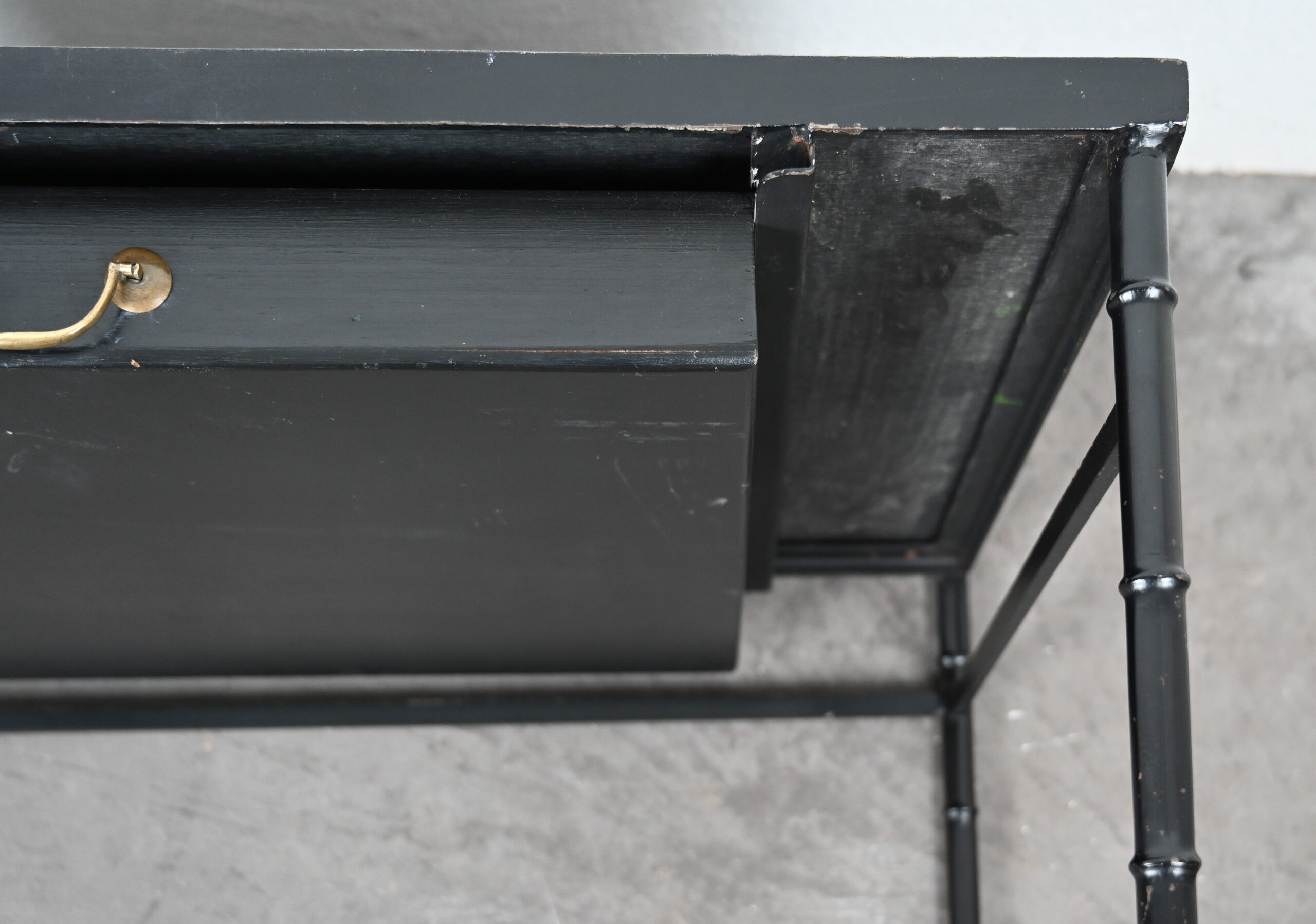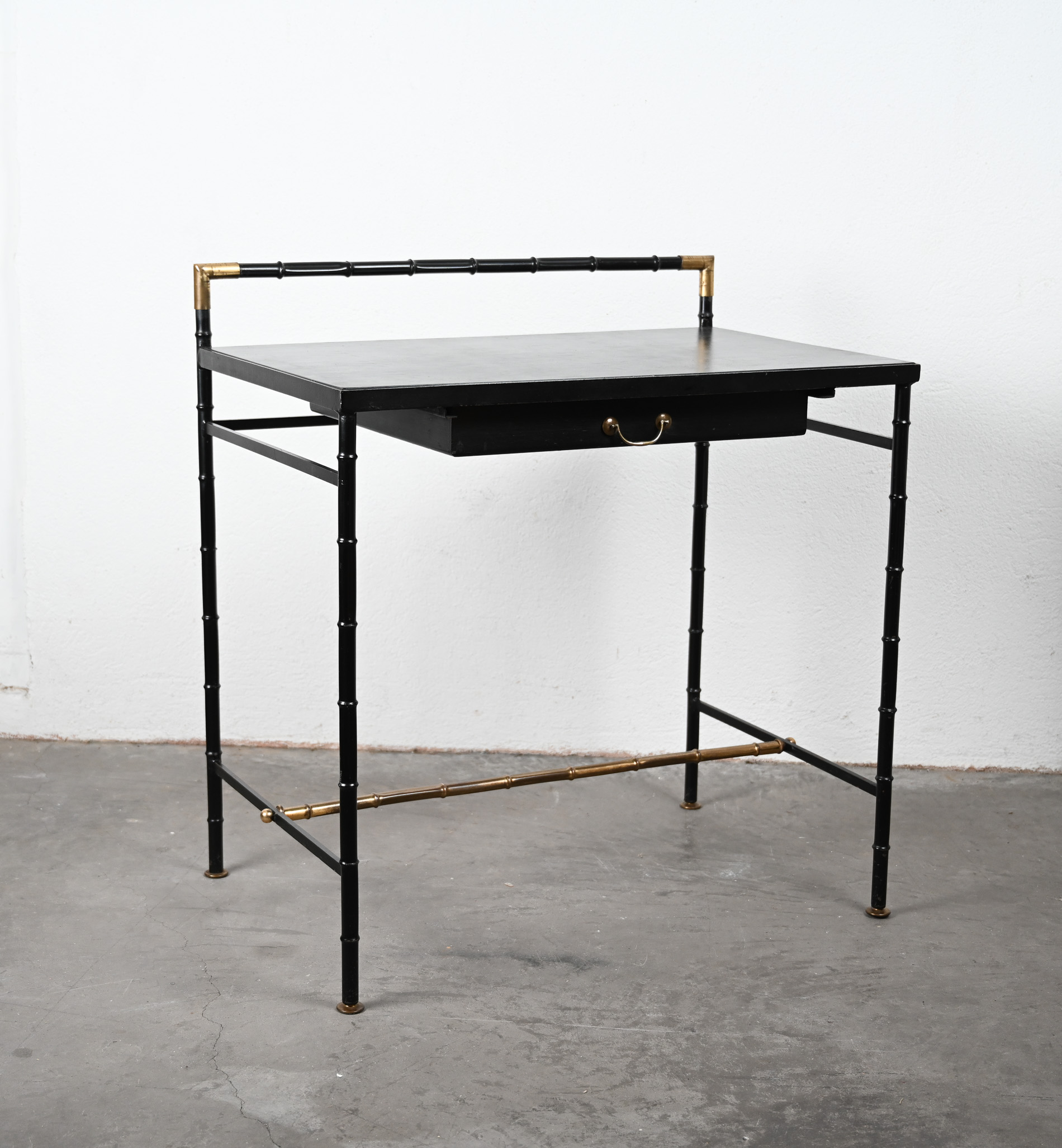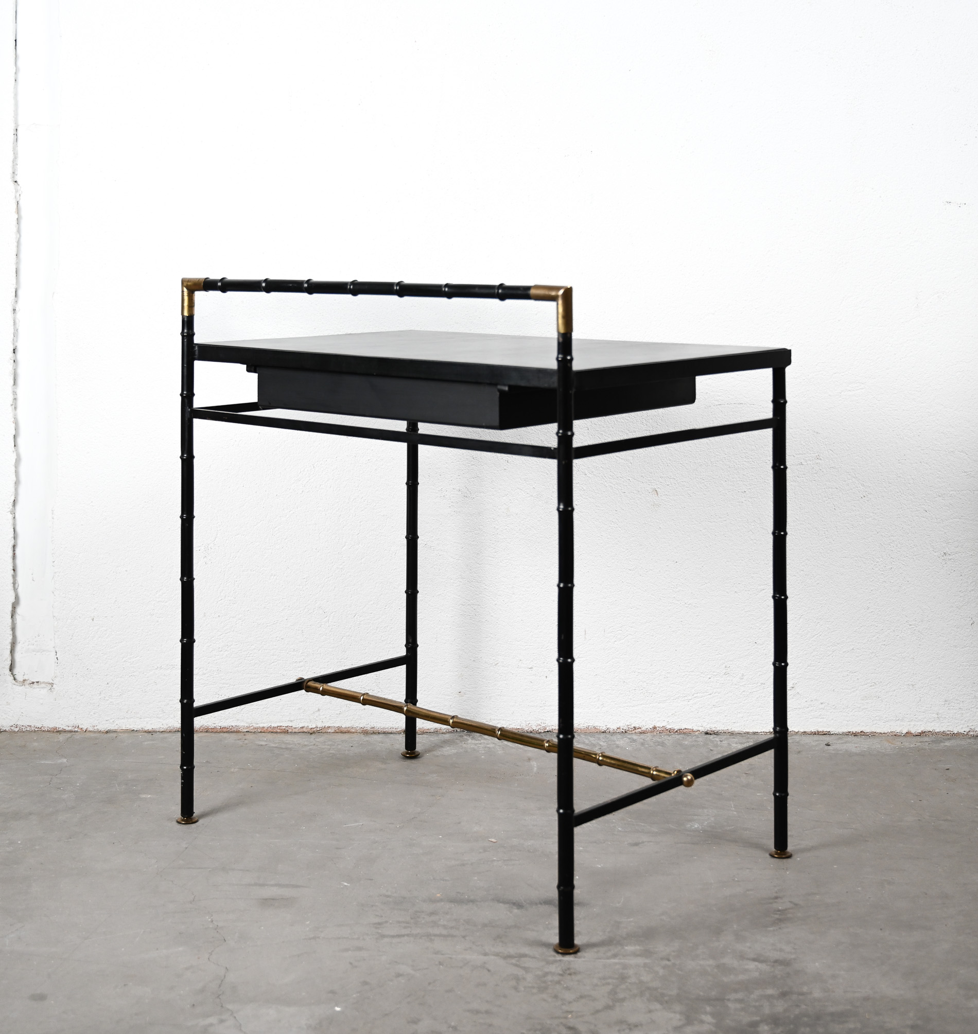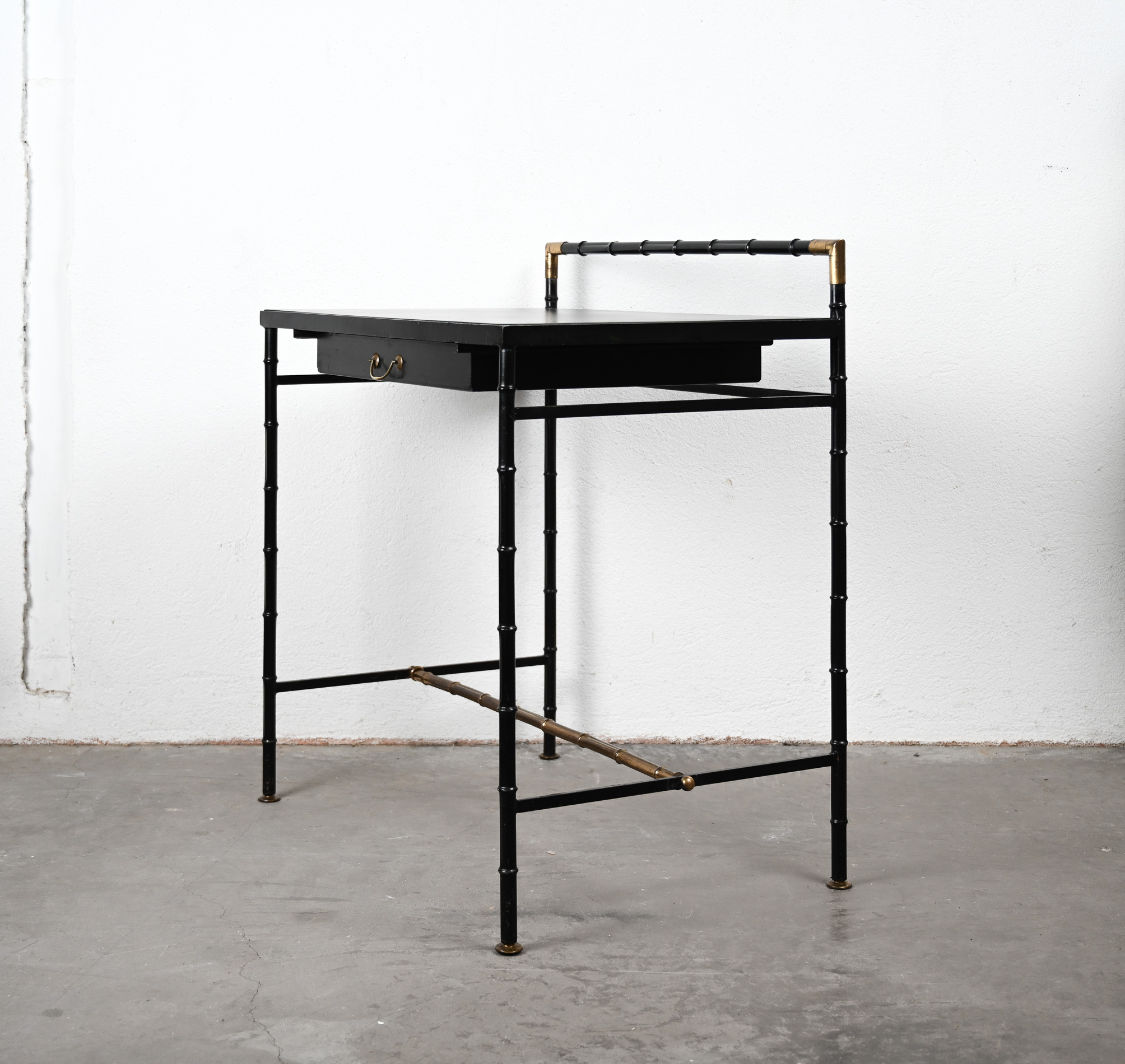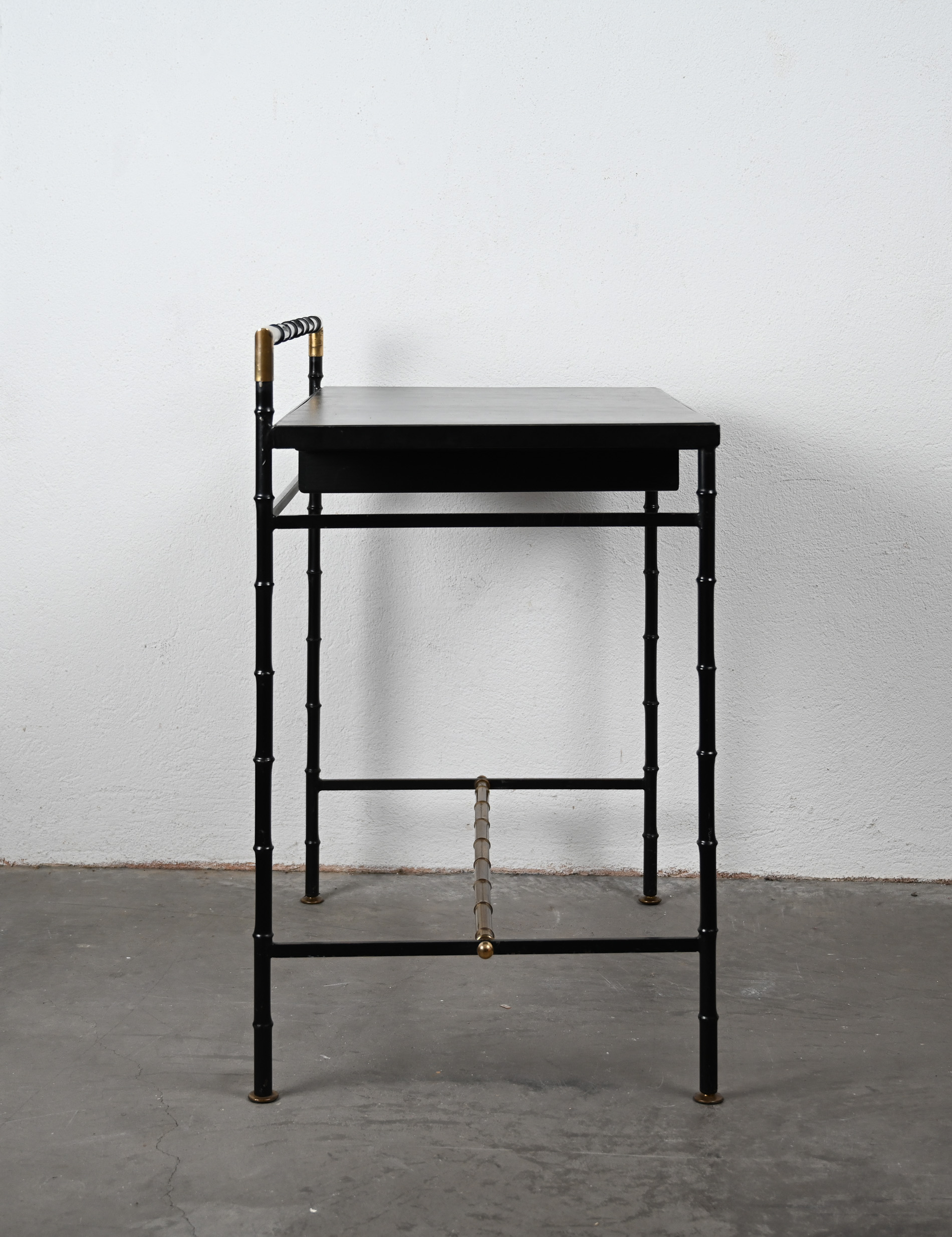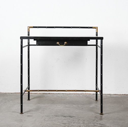 Black leather, steel and brass faux bamboo side table/desk with single drawer in the style of Jacques Adnet