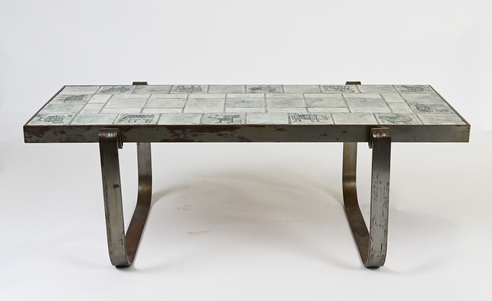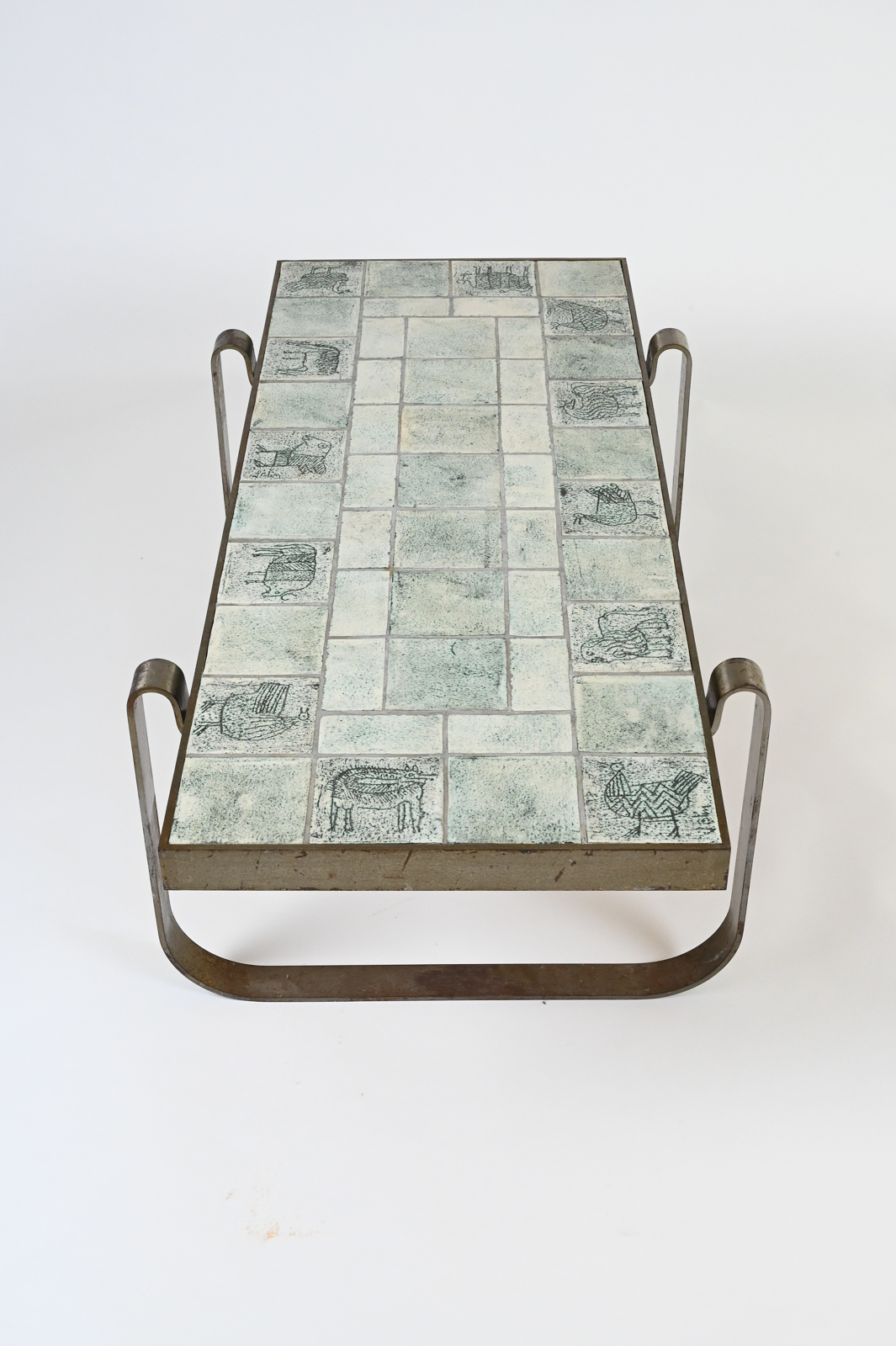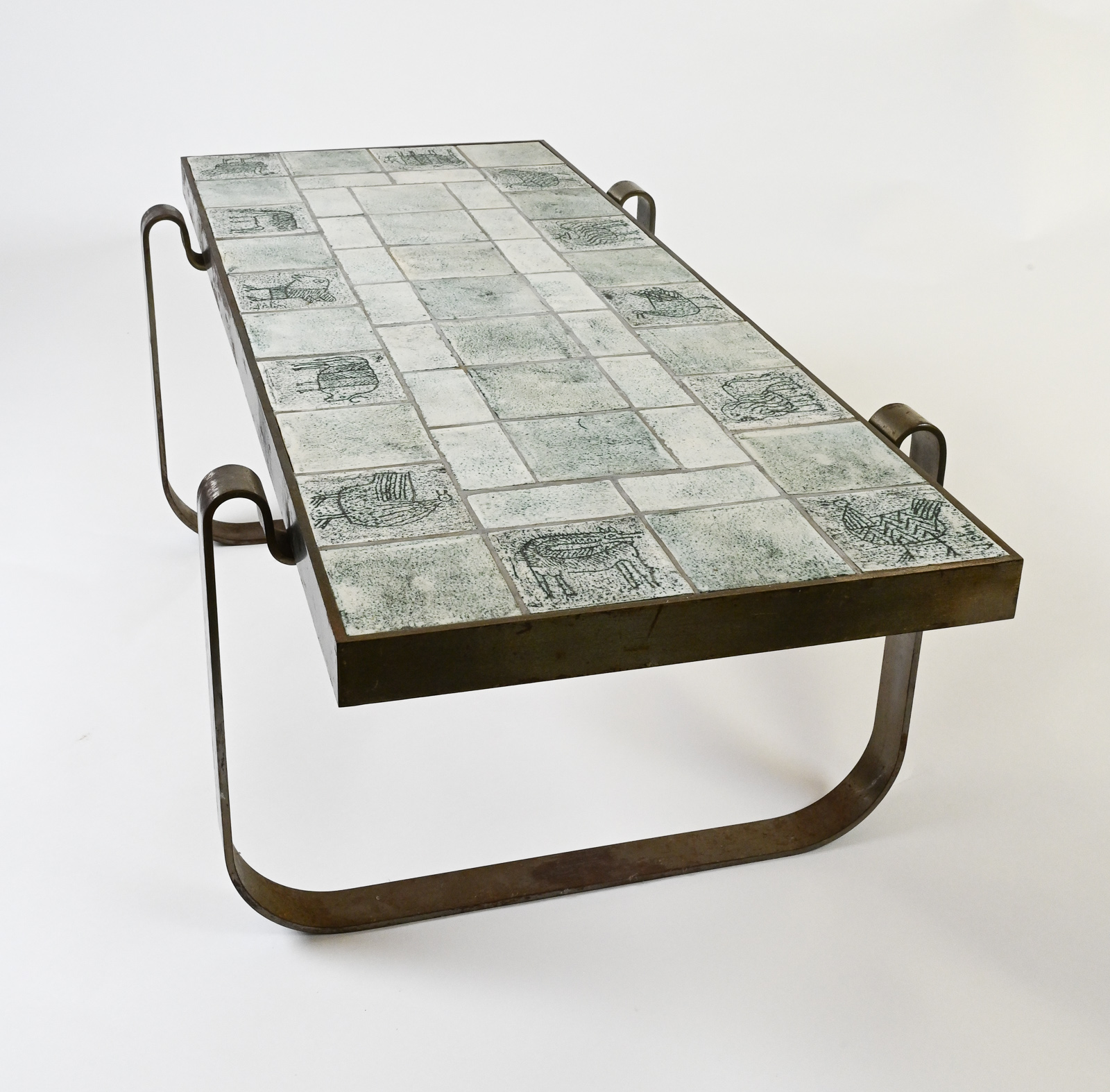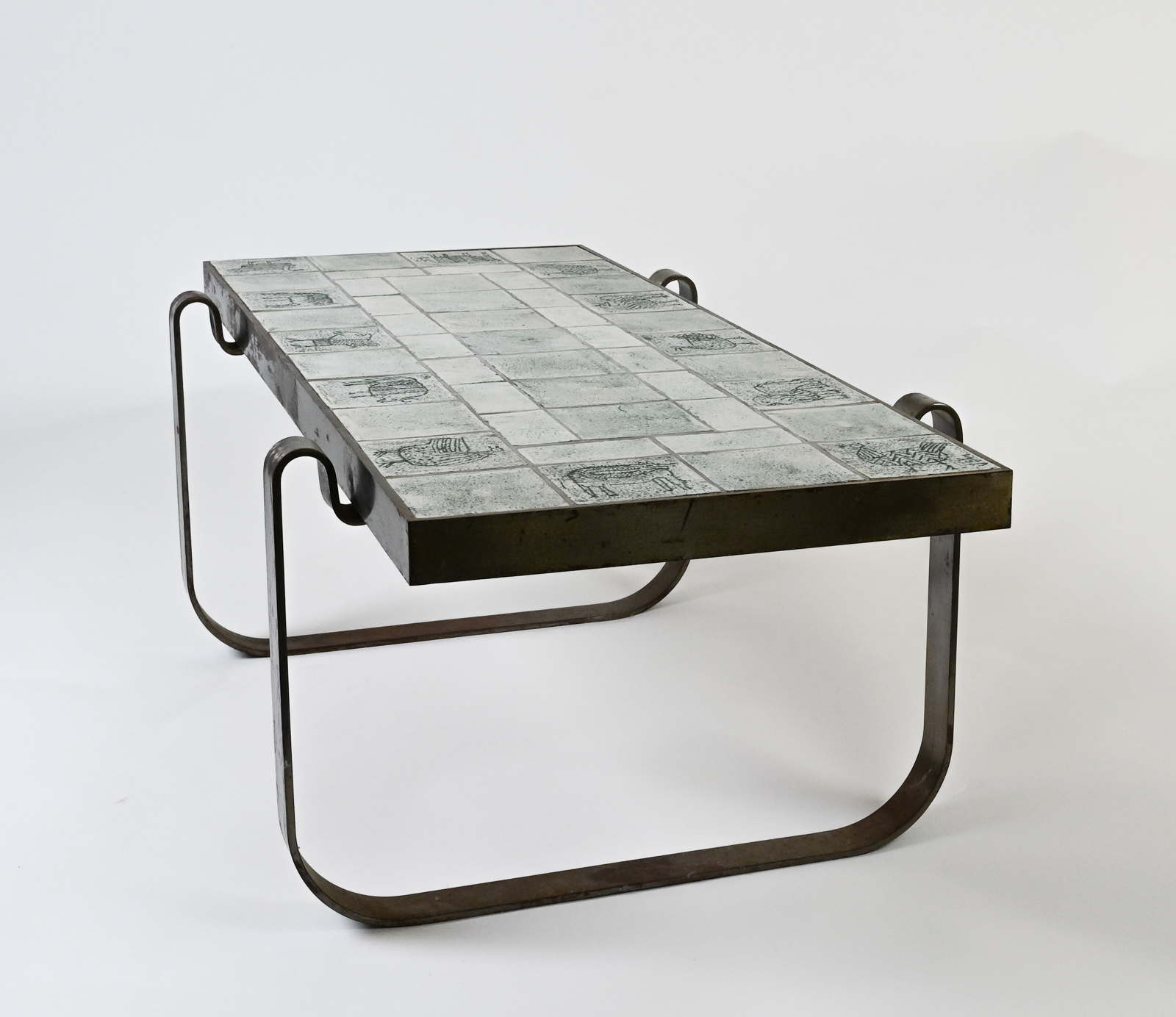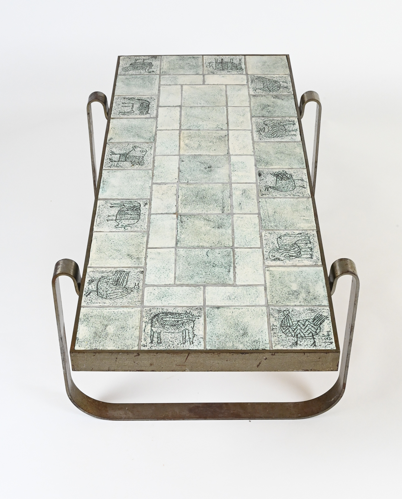 Rare modernist mid century steel-framed low table composed of ceramic tiles of animals by Jacques Blin.