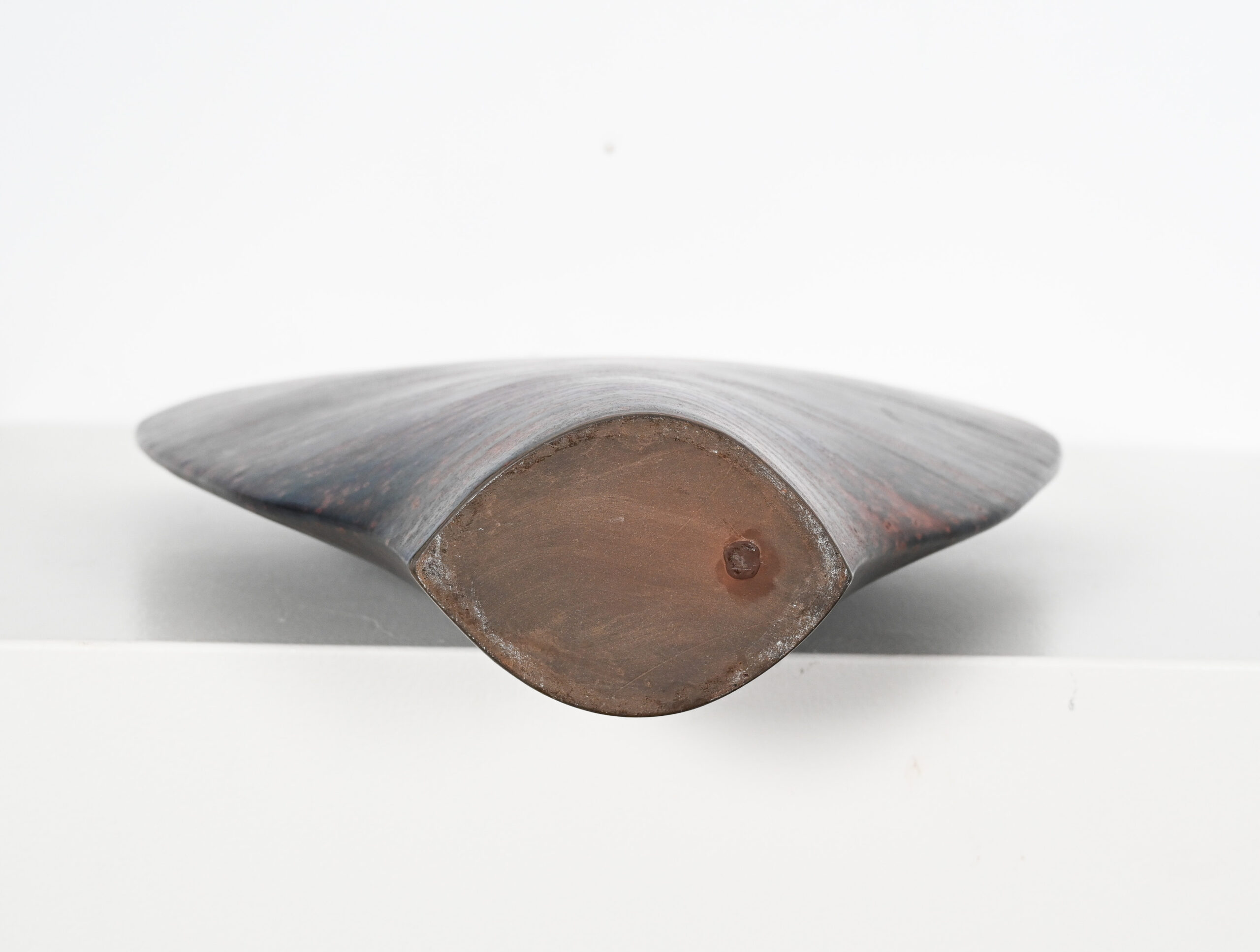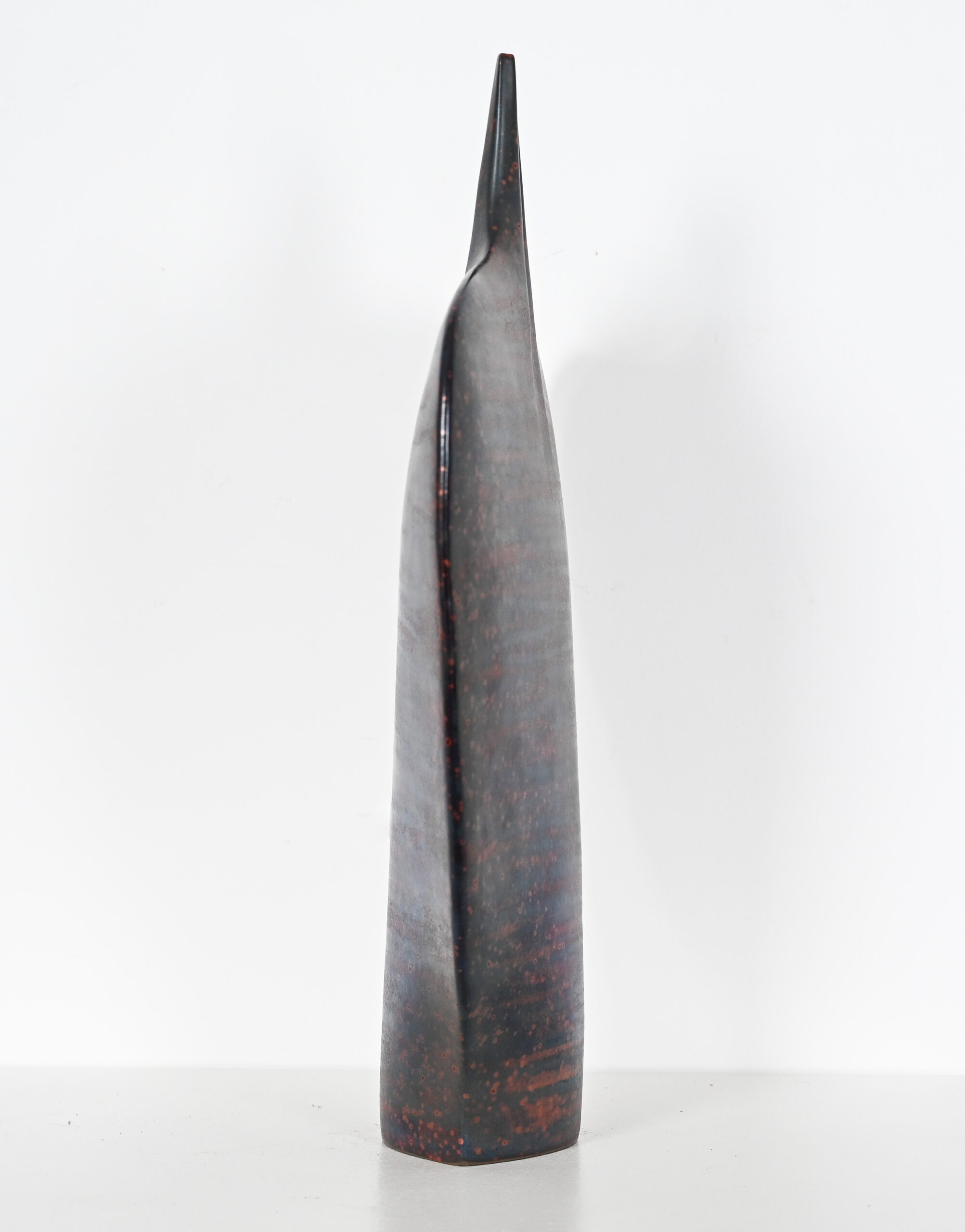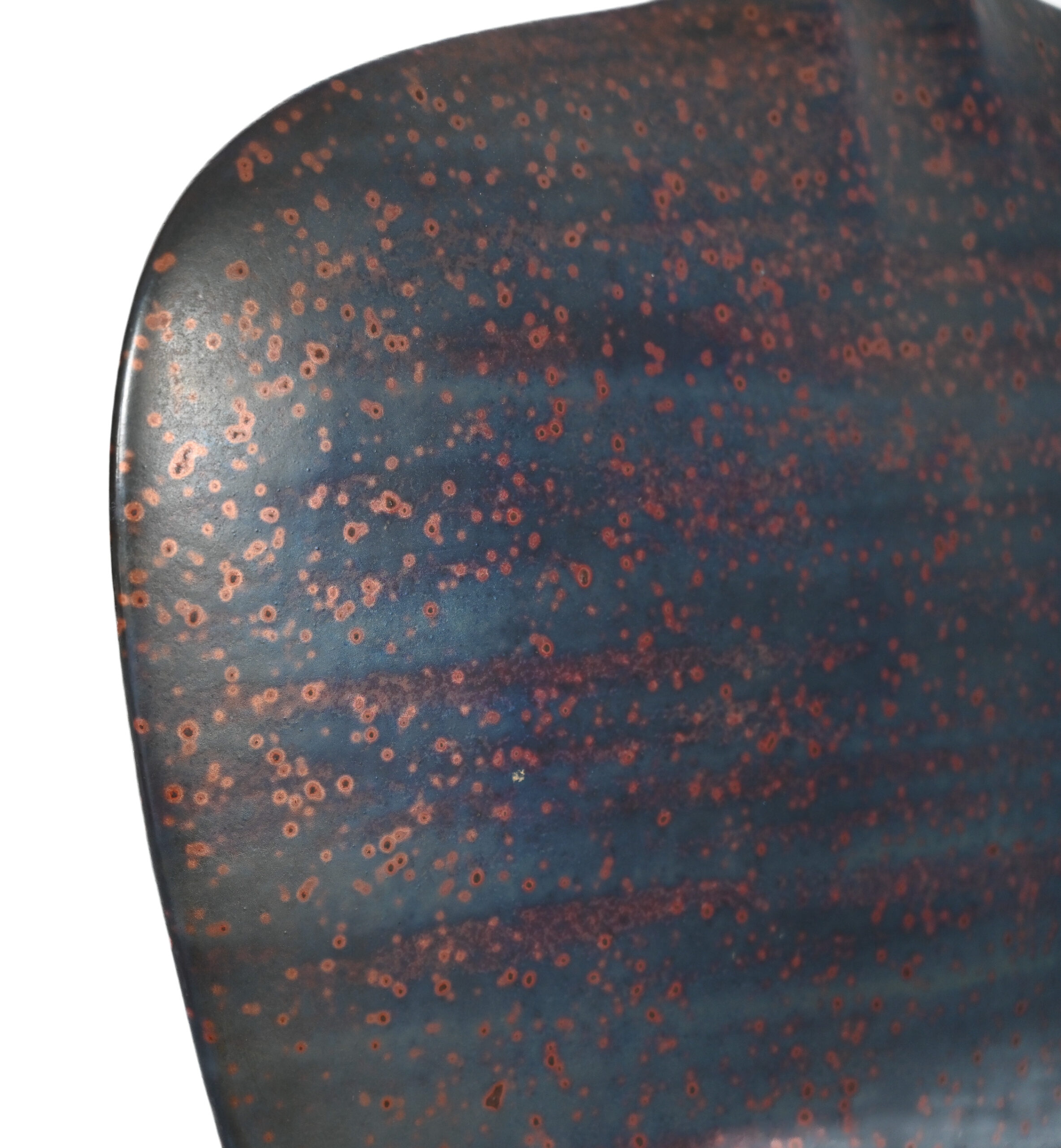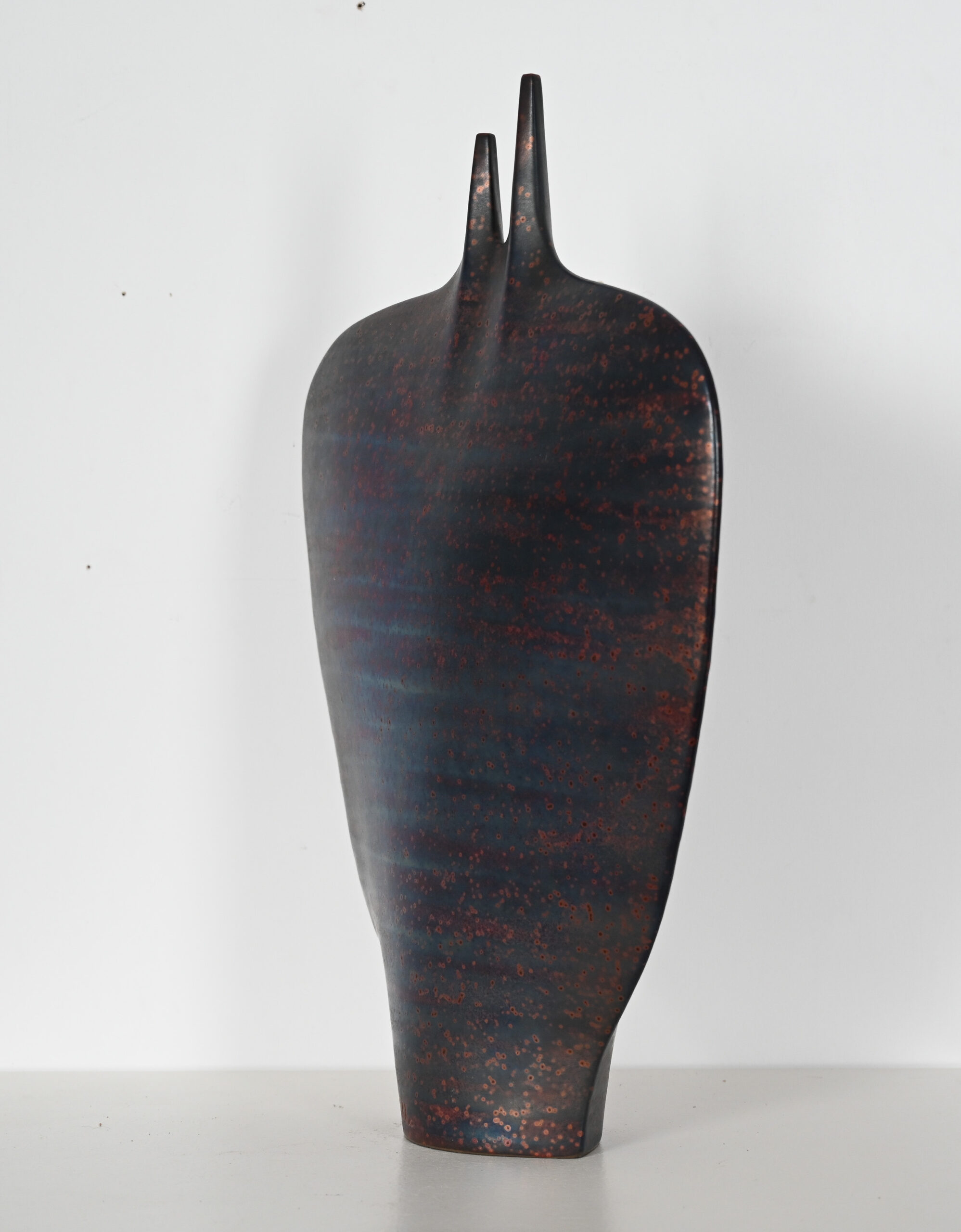 This example is distinguished by its compressed ovoid body and bifurcated crest, animated by a deep blue-black reduction glaze with iron-rich copper spotting and subtle horizontal striations. Monumental in scale and presence, it is signed to the base and intended for plinth display.