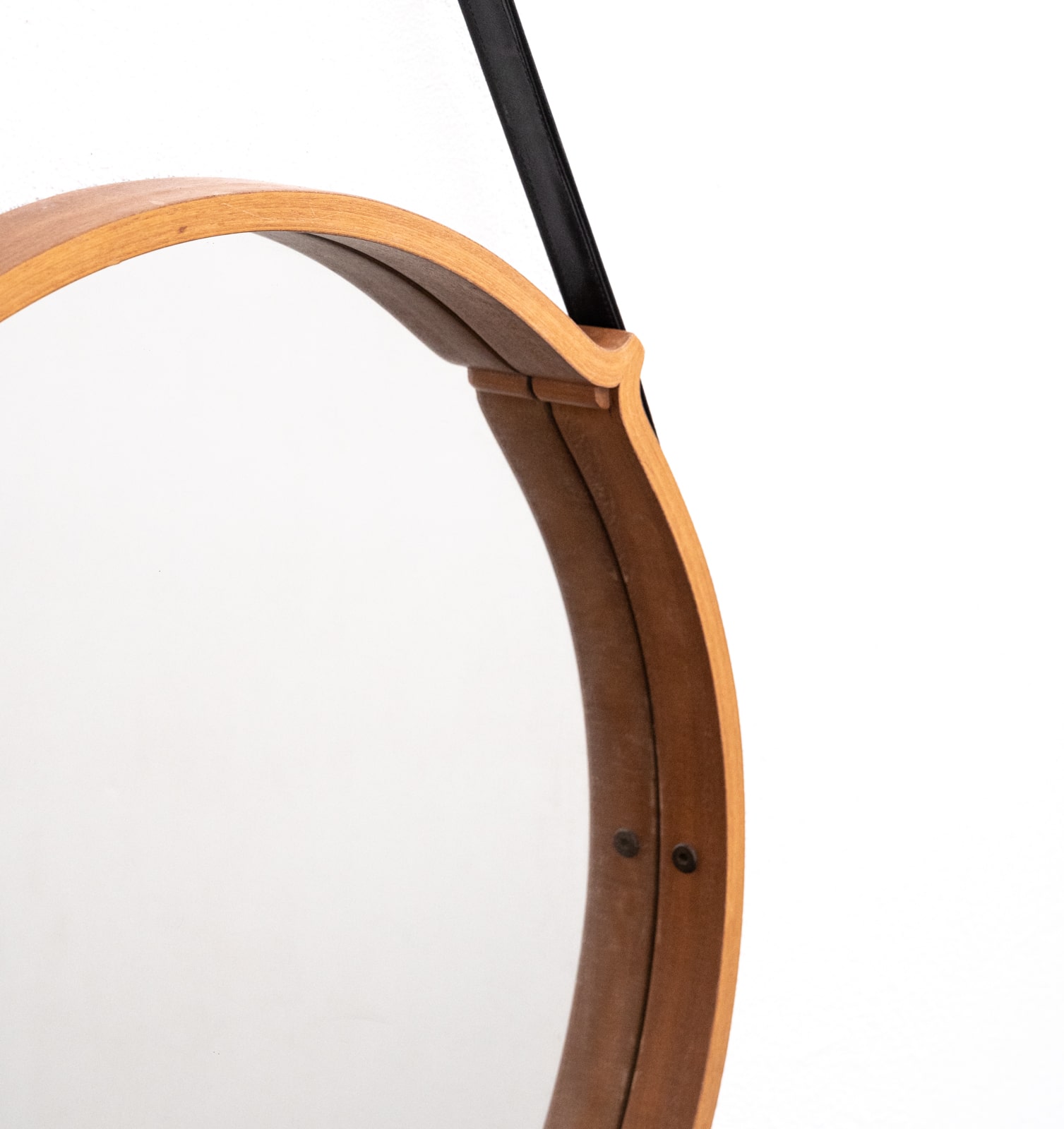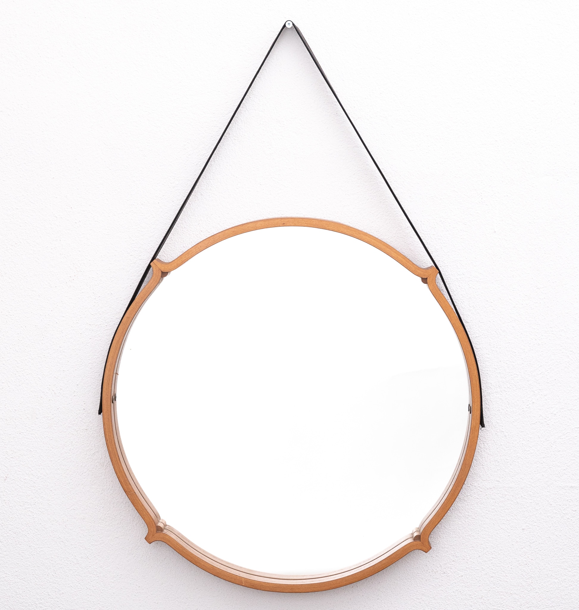 mid century circular teak mirror with leather strap hanger