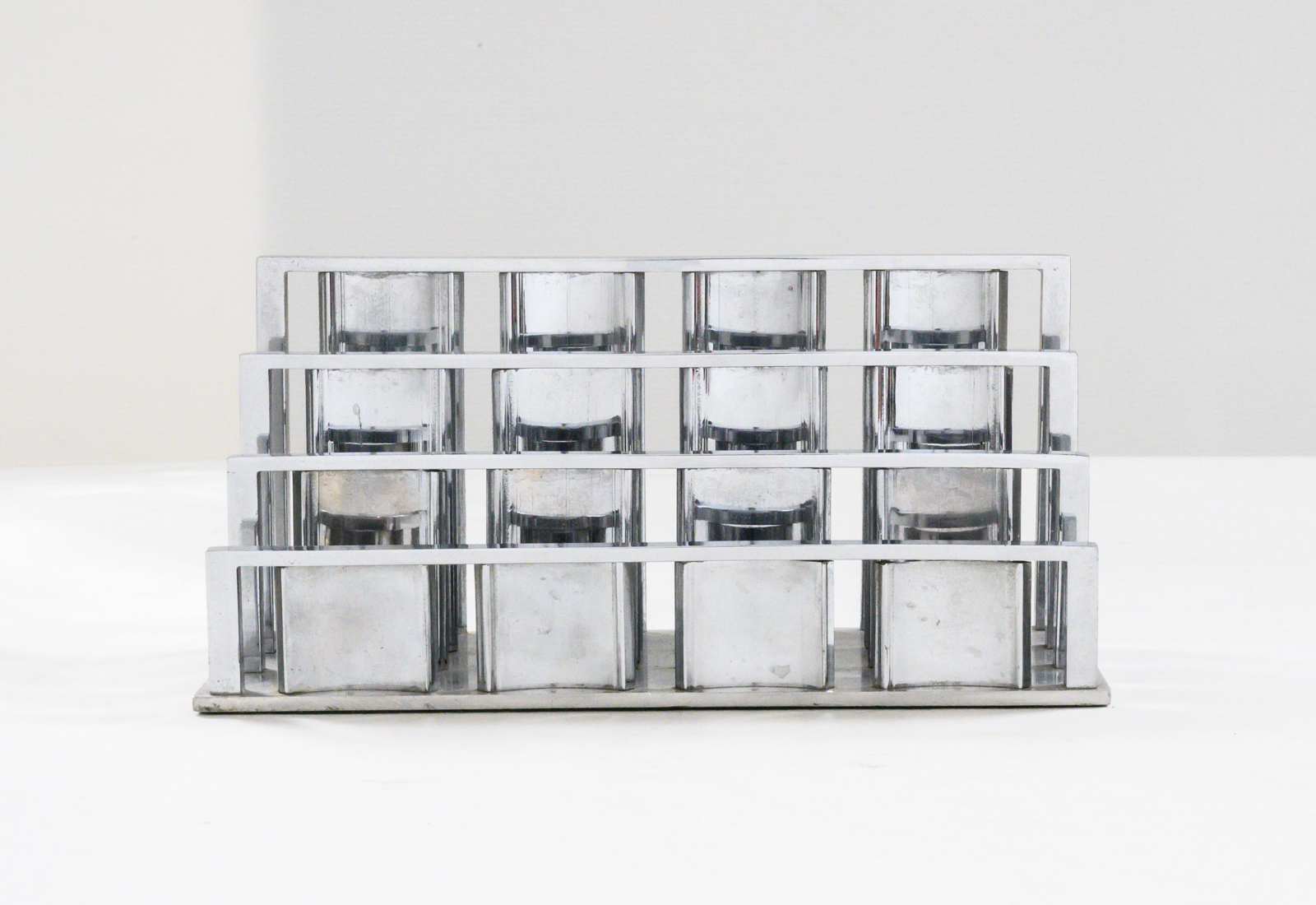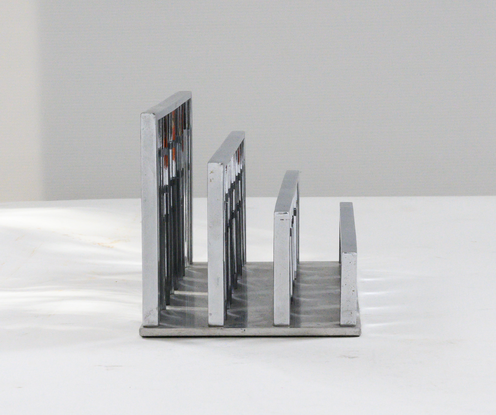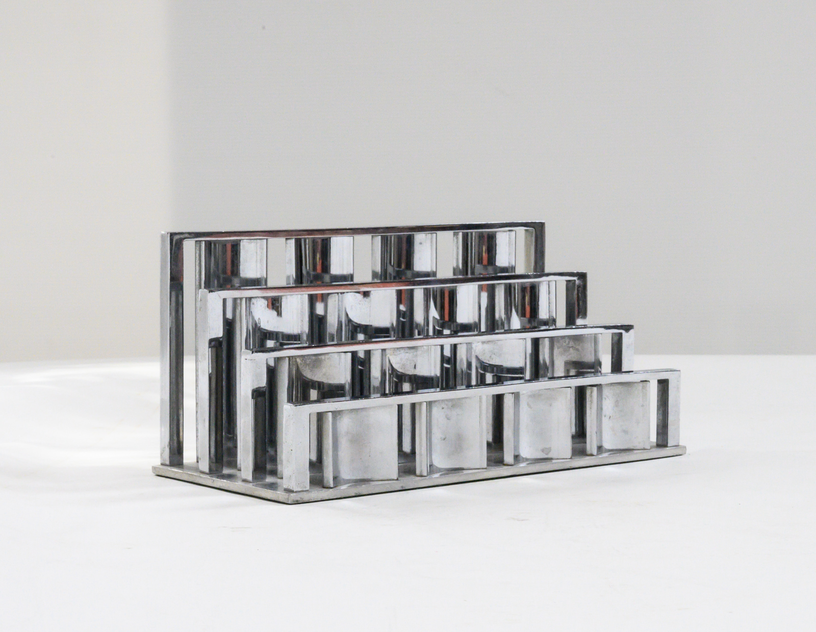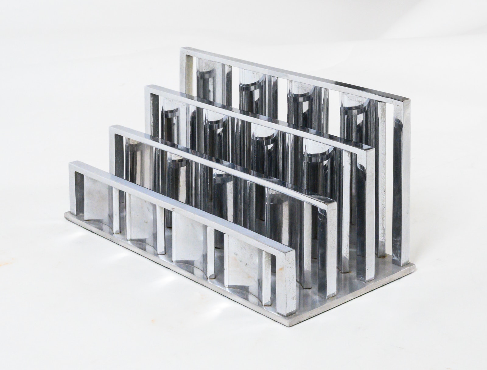 Jacques Adnet & the Compagnie des arts Français letter rack. Chromed metal consisting of a series of vertical blades of curved section resting on rectangular base