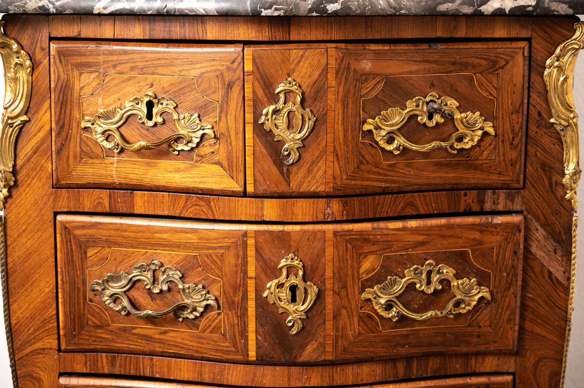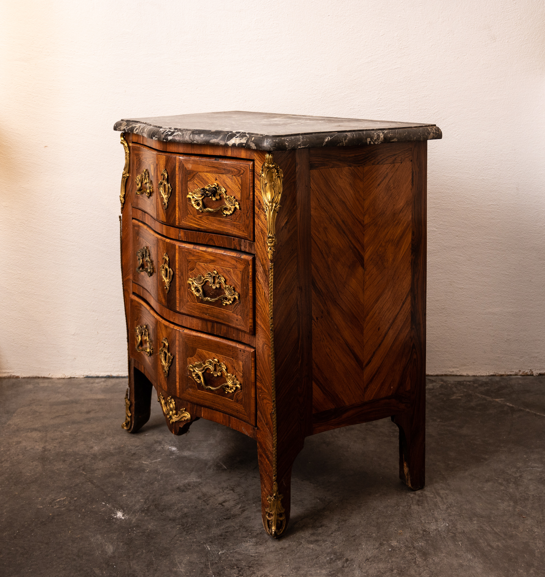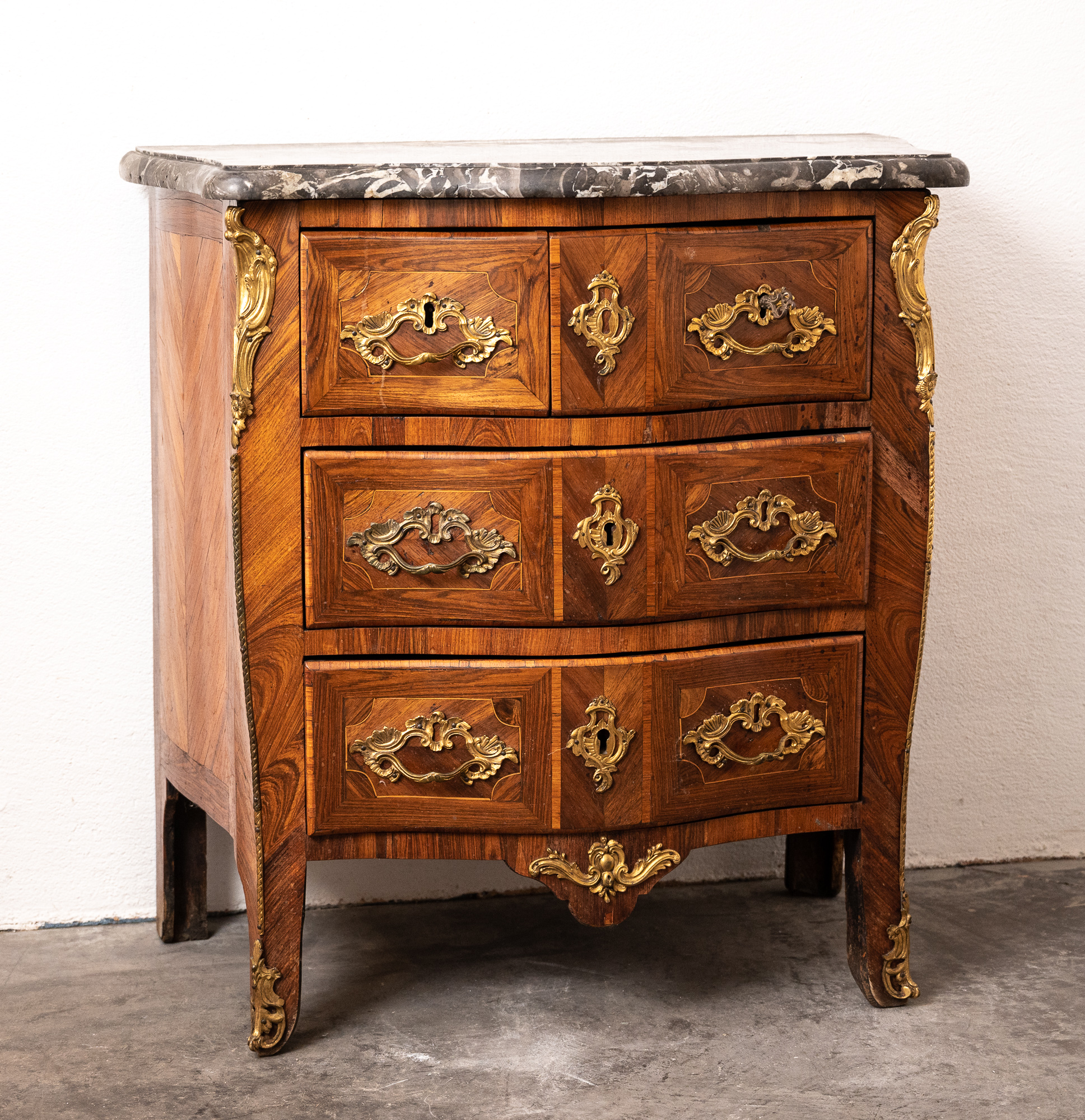 Marble topped Louis XV kingwood veneered commode of small proportions, good original colour with its original grey and white flecked marble top.