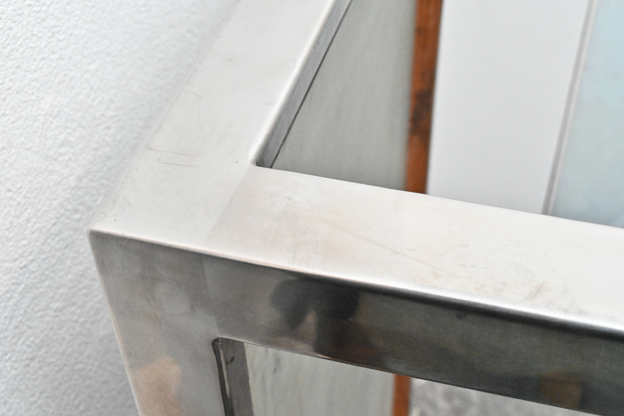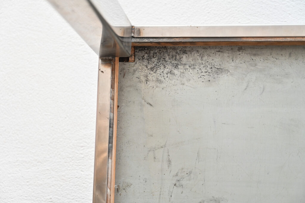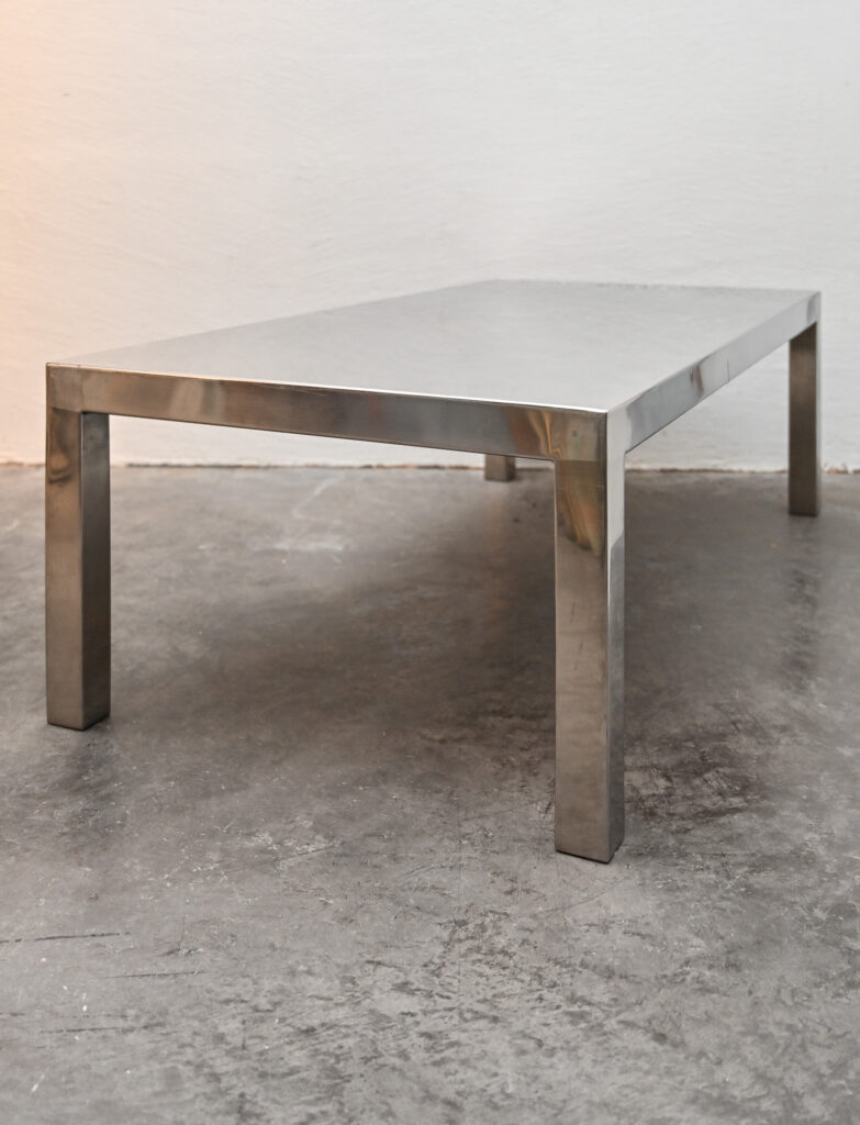 Brushed matte polished stainless steel over wood rectangular coffee table by Maria Pergay on four square steel legs created with Marina Varenne, circa 1970.