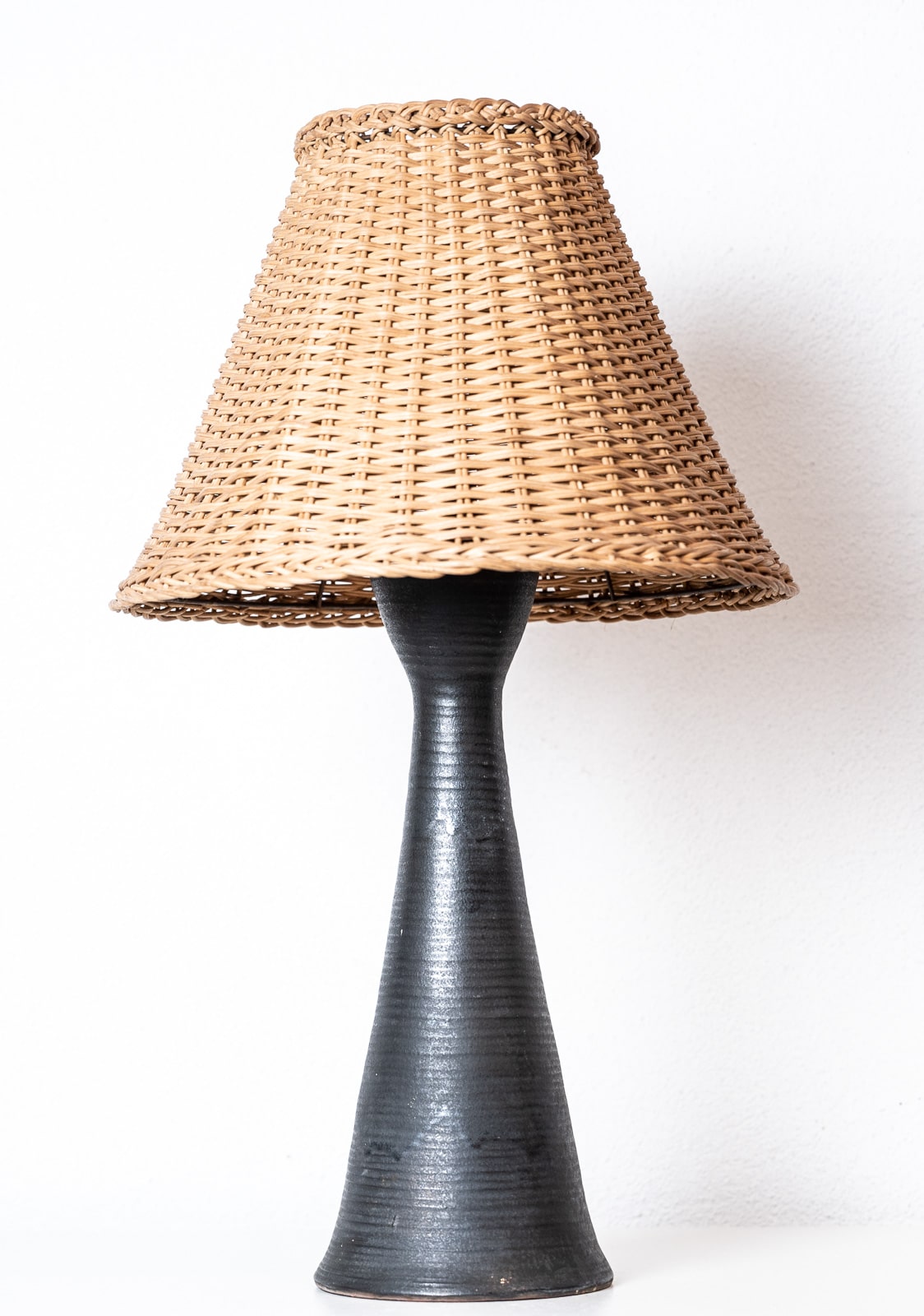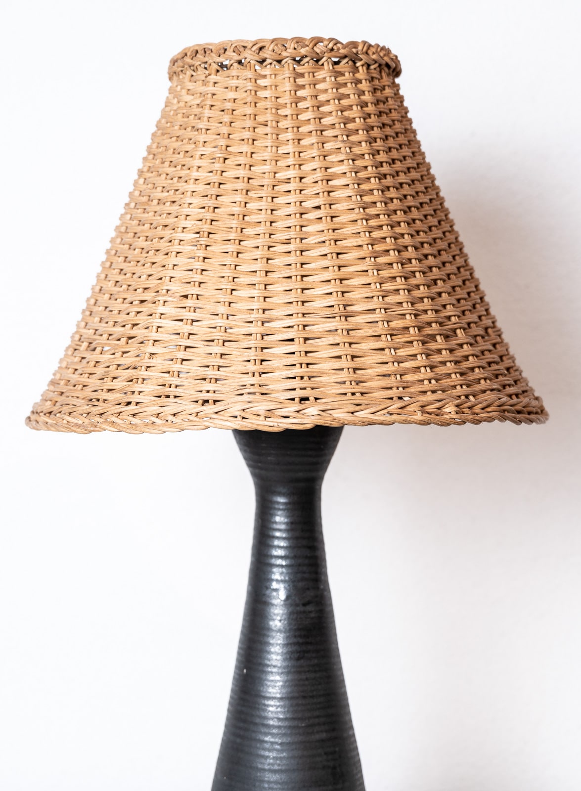 Ceramic table lamp with wicker shade by Marc Drillon, signed “Saint Amand Puisaye M Drillon”