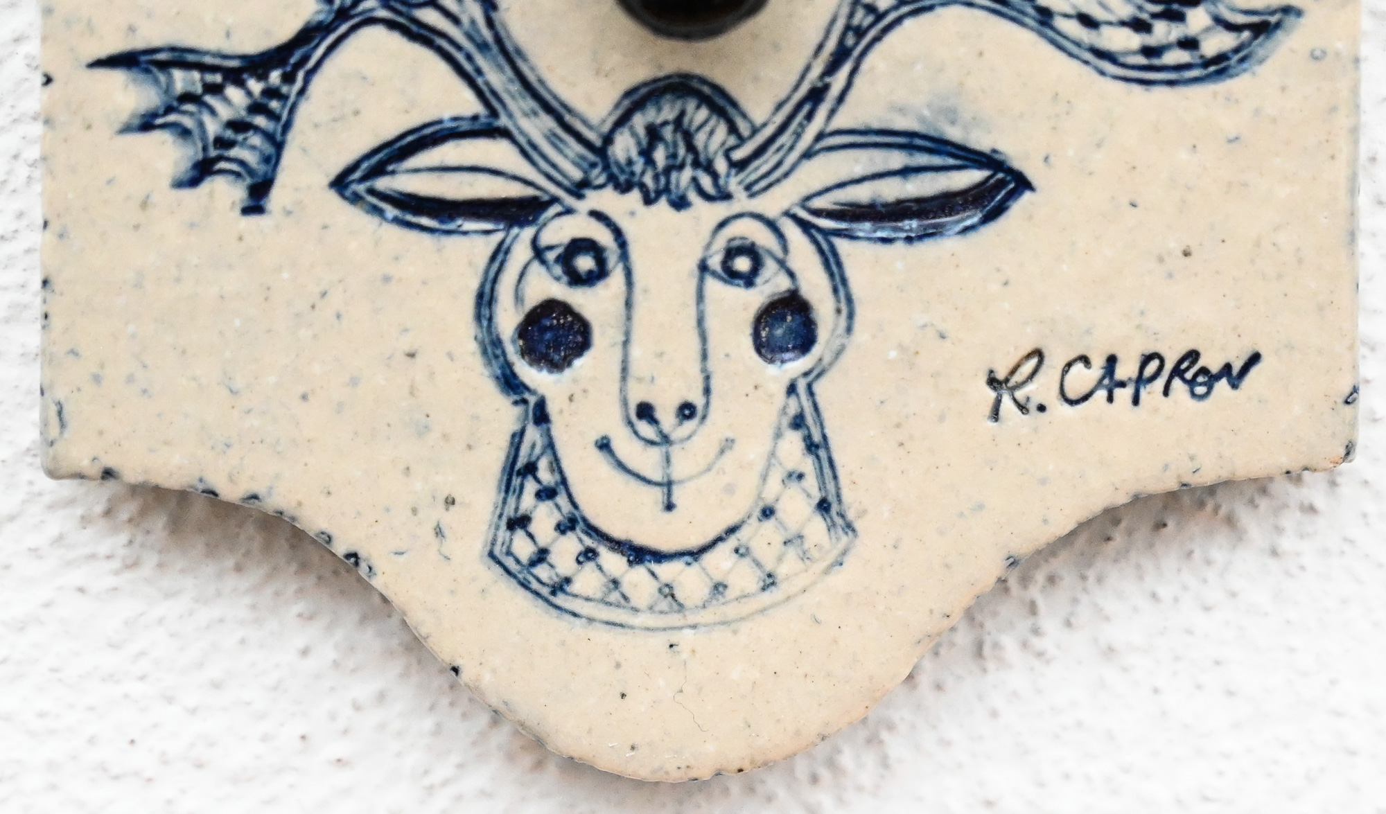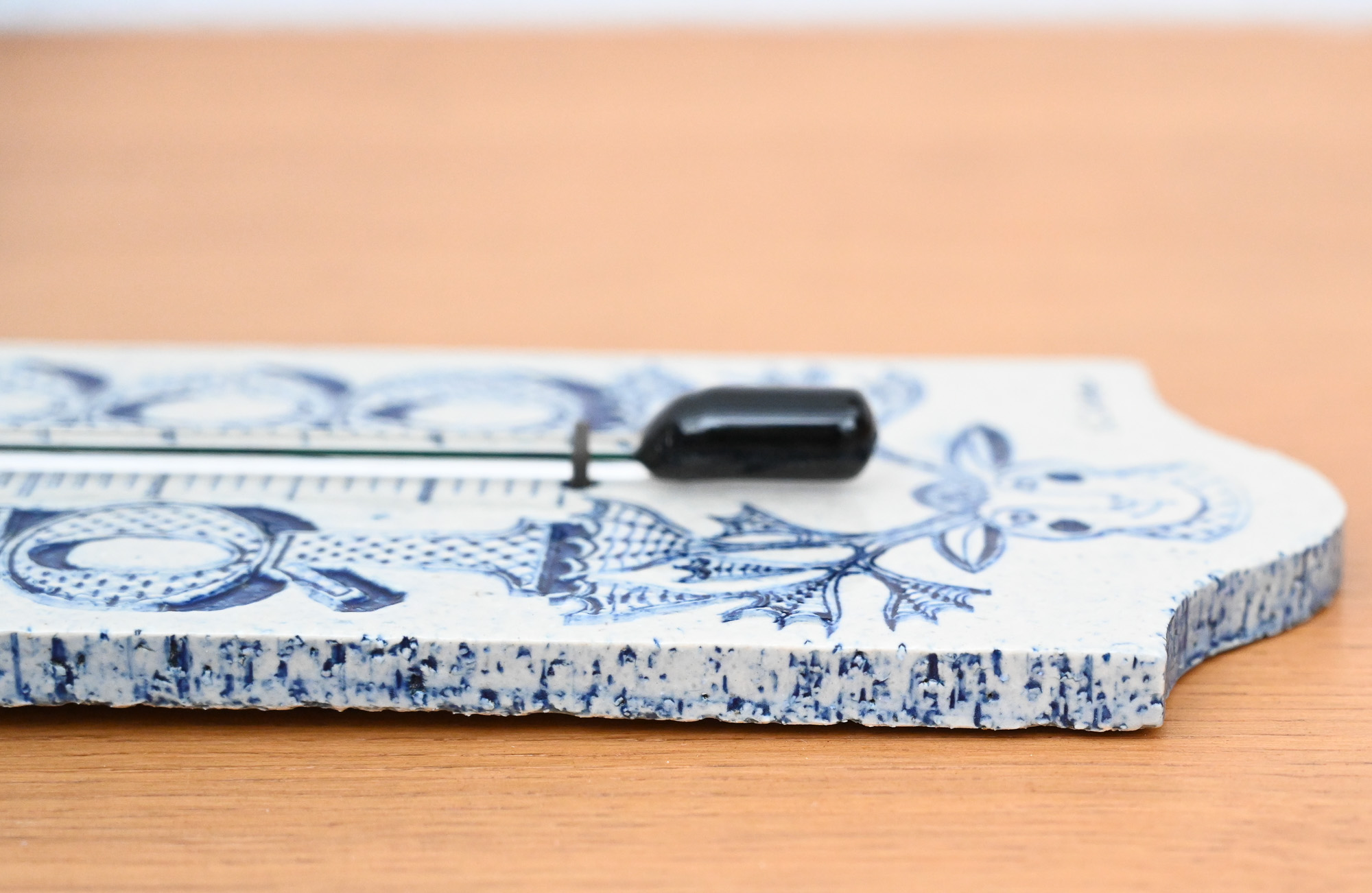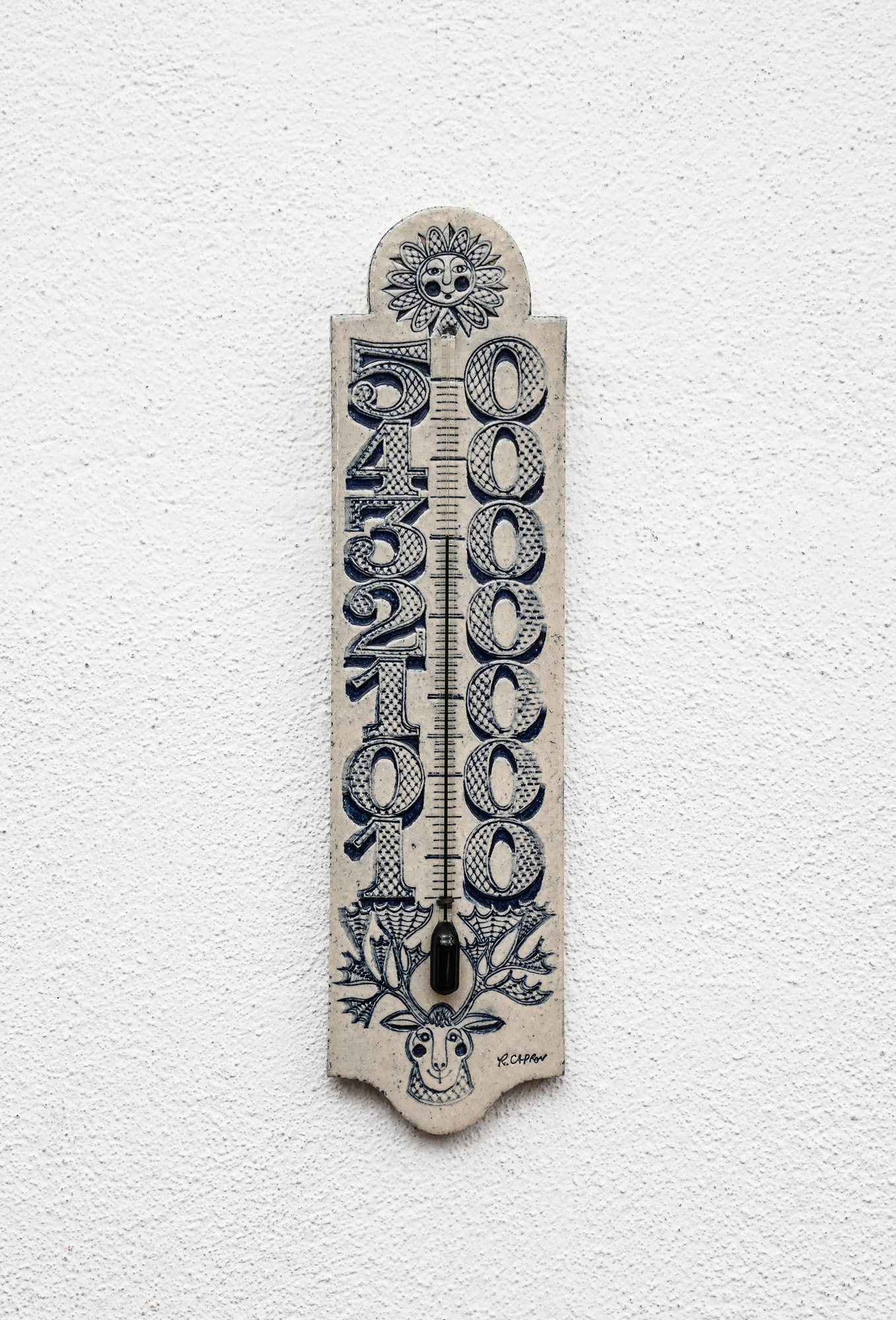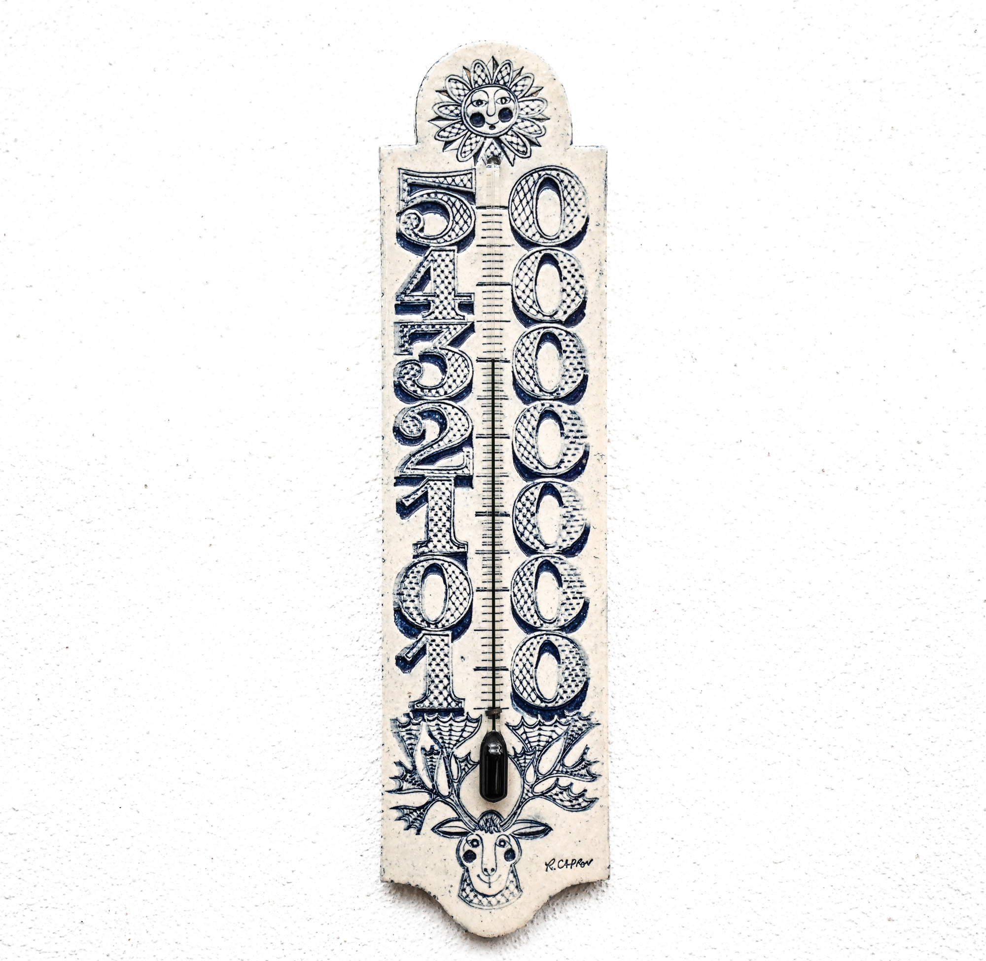Roger Capron ceramic thermometer with blue sun and deer decoration, signed R Capron.