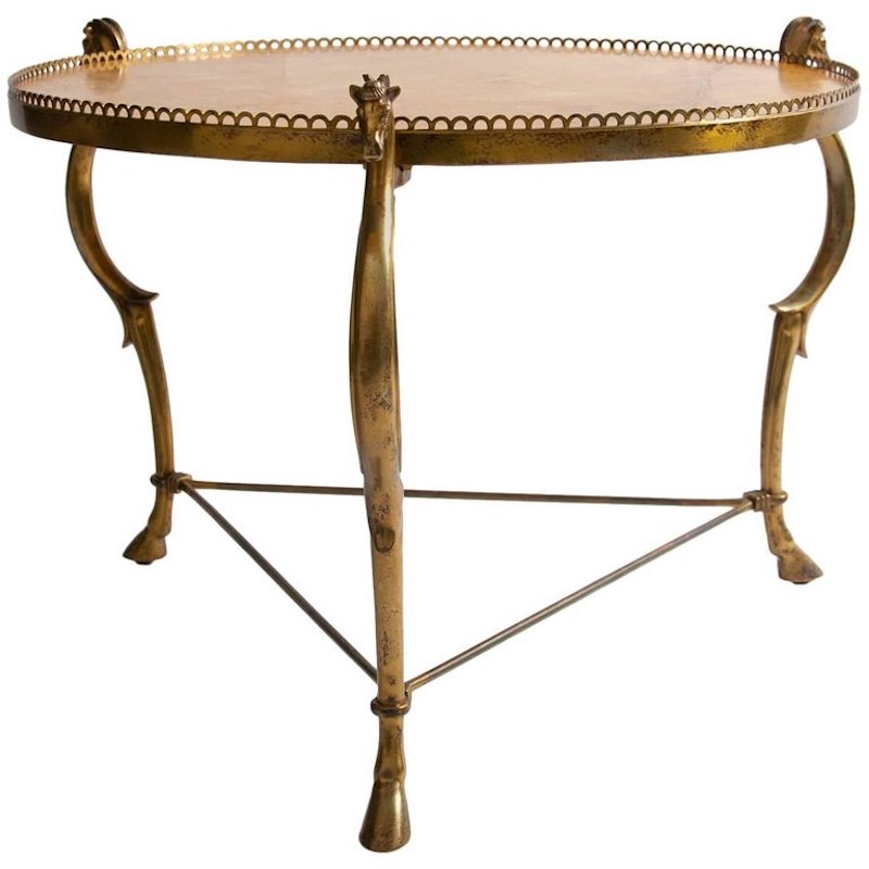Midcentury French circular low table, by Maison Baguès, Paris, circa 1950, Circular sienna marble top supported by three neoclassical legs topped with horses heads and ending in hoof feet. Original marble top with old repair.