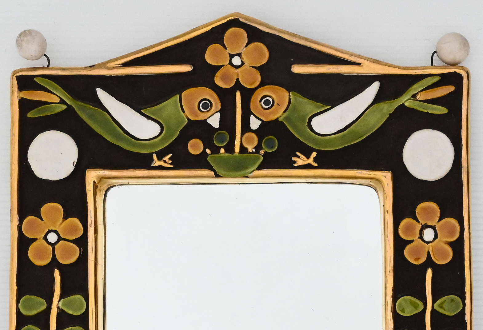 Ceramic “bocage mirror with orbs” in gold and colours with bird and flower motif by Mithé Espelt