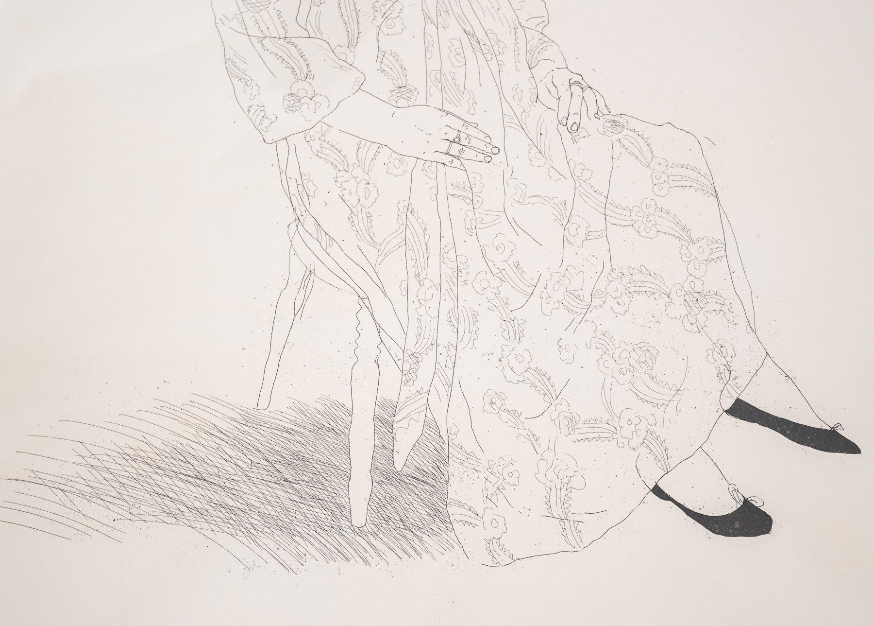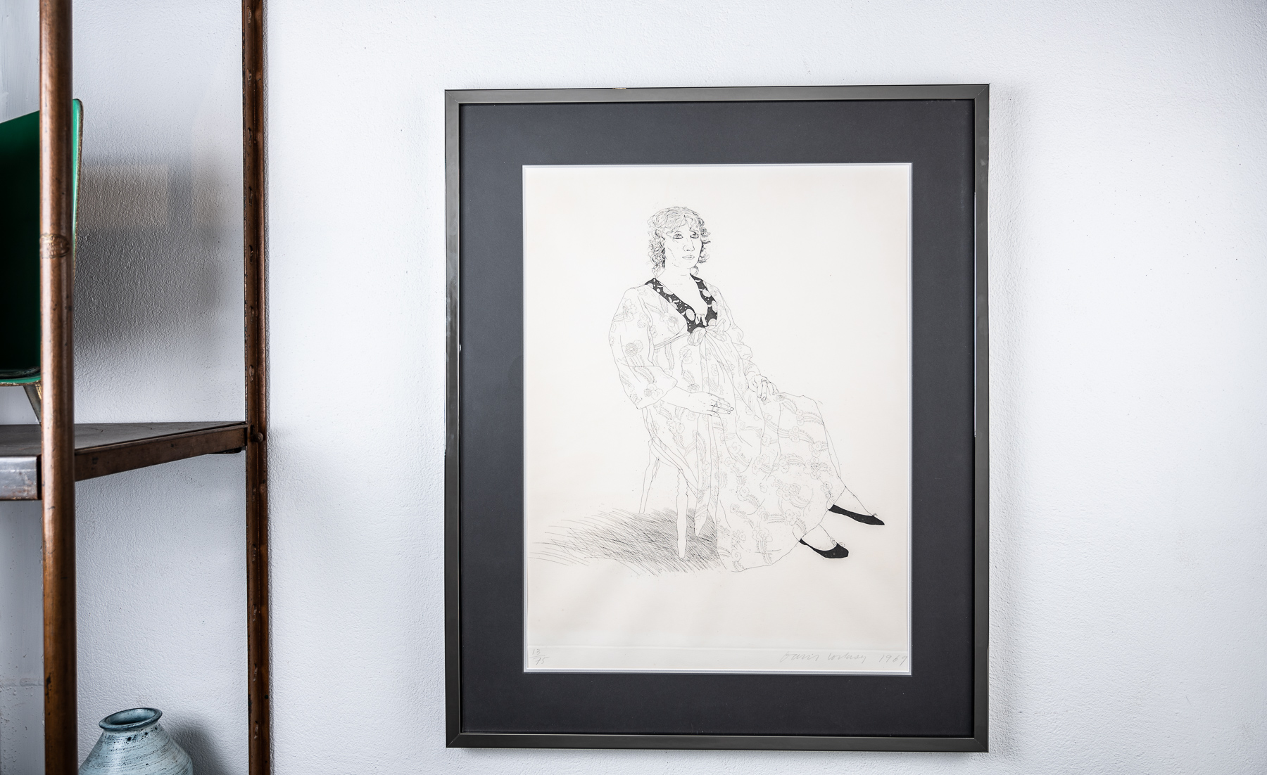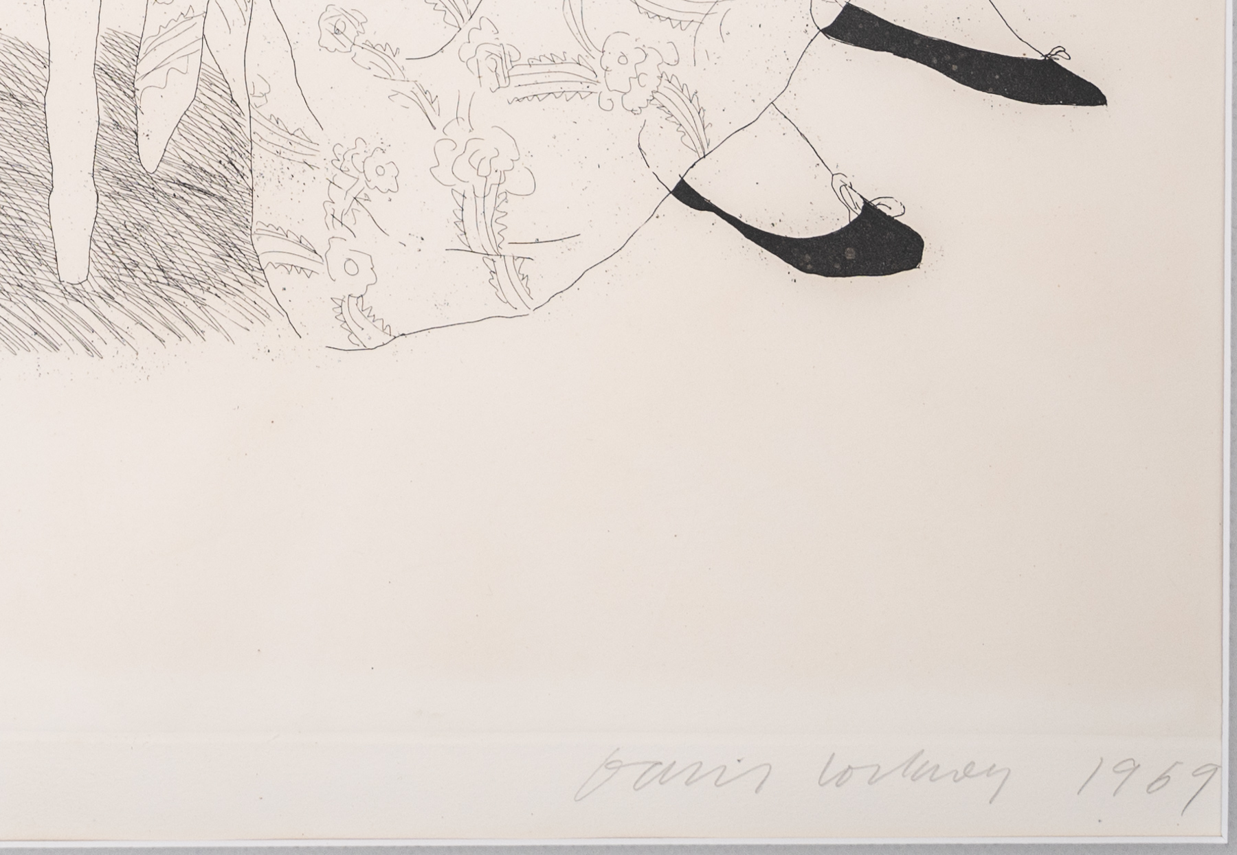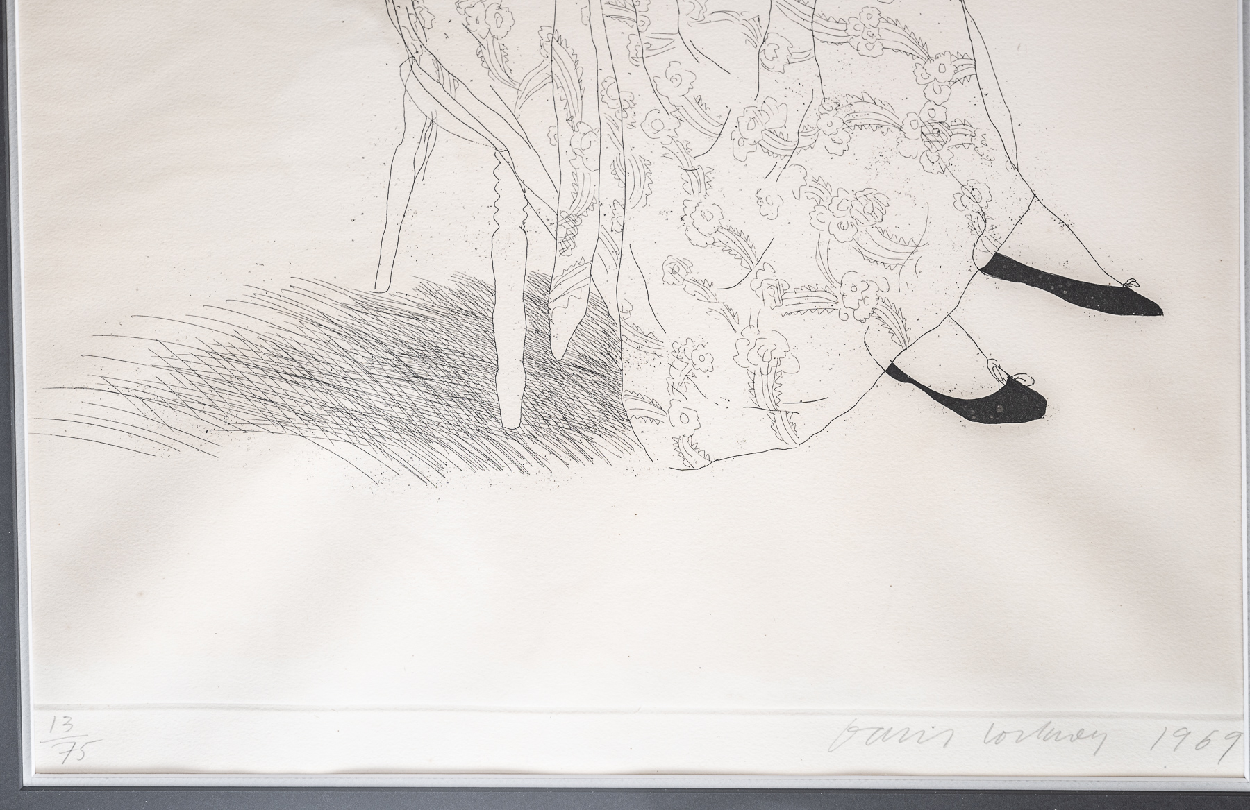 This etching, along with another etching of the same year, “Peter”, marked the beginning of Hockney’s work in full-length figure studies. A version of this print from the same edition can be found in the collection of the Tate Gallery London.