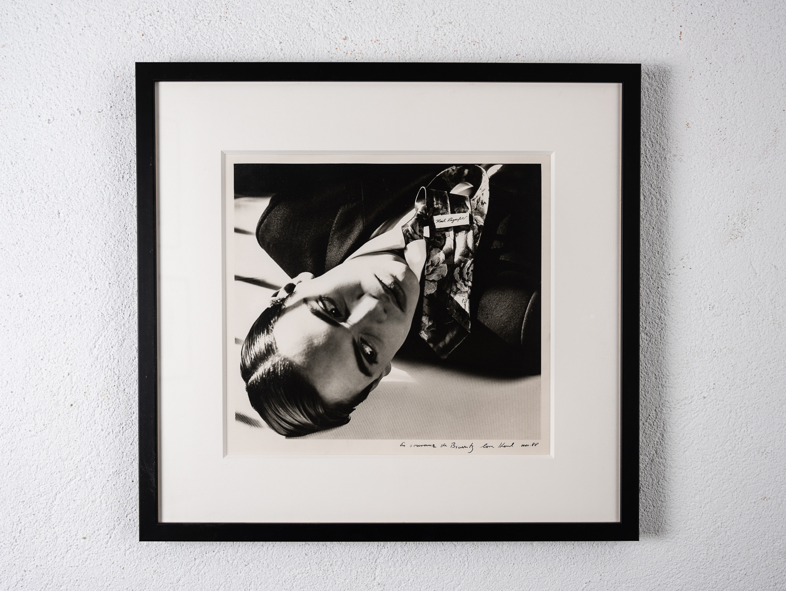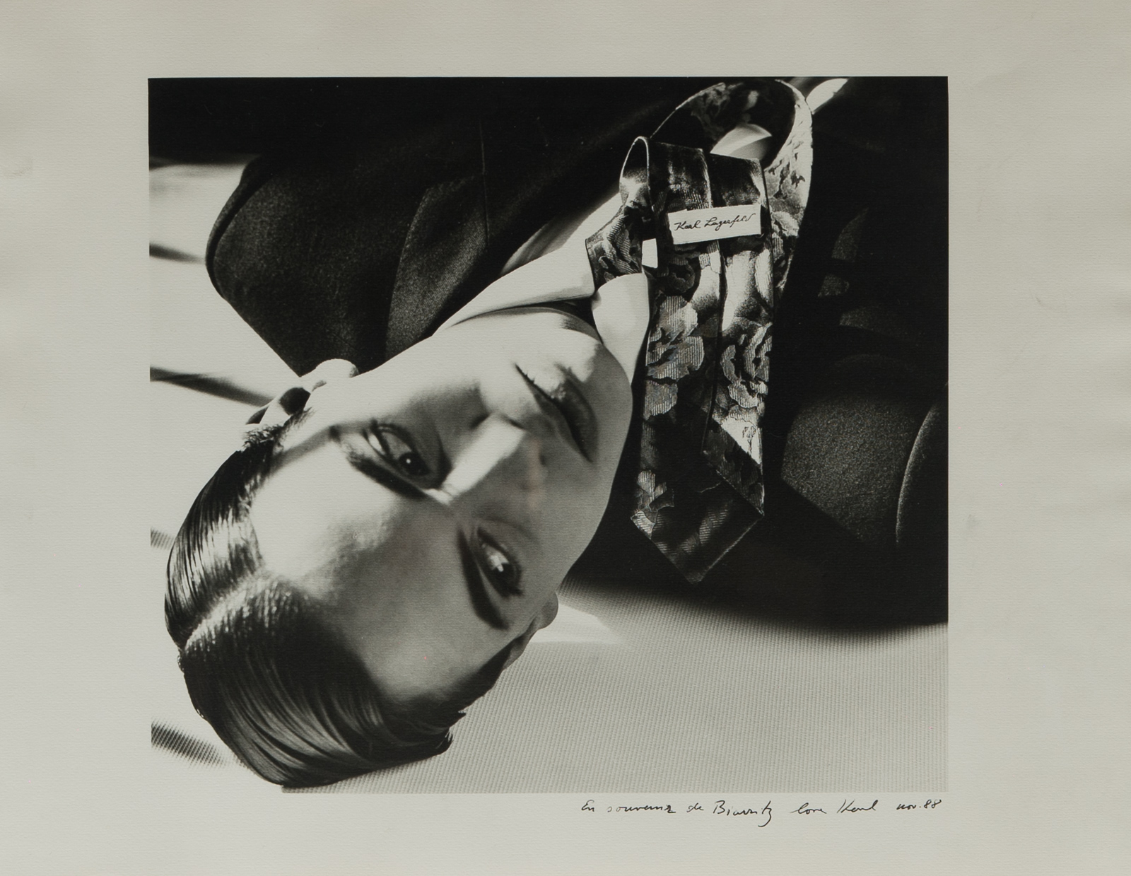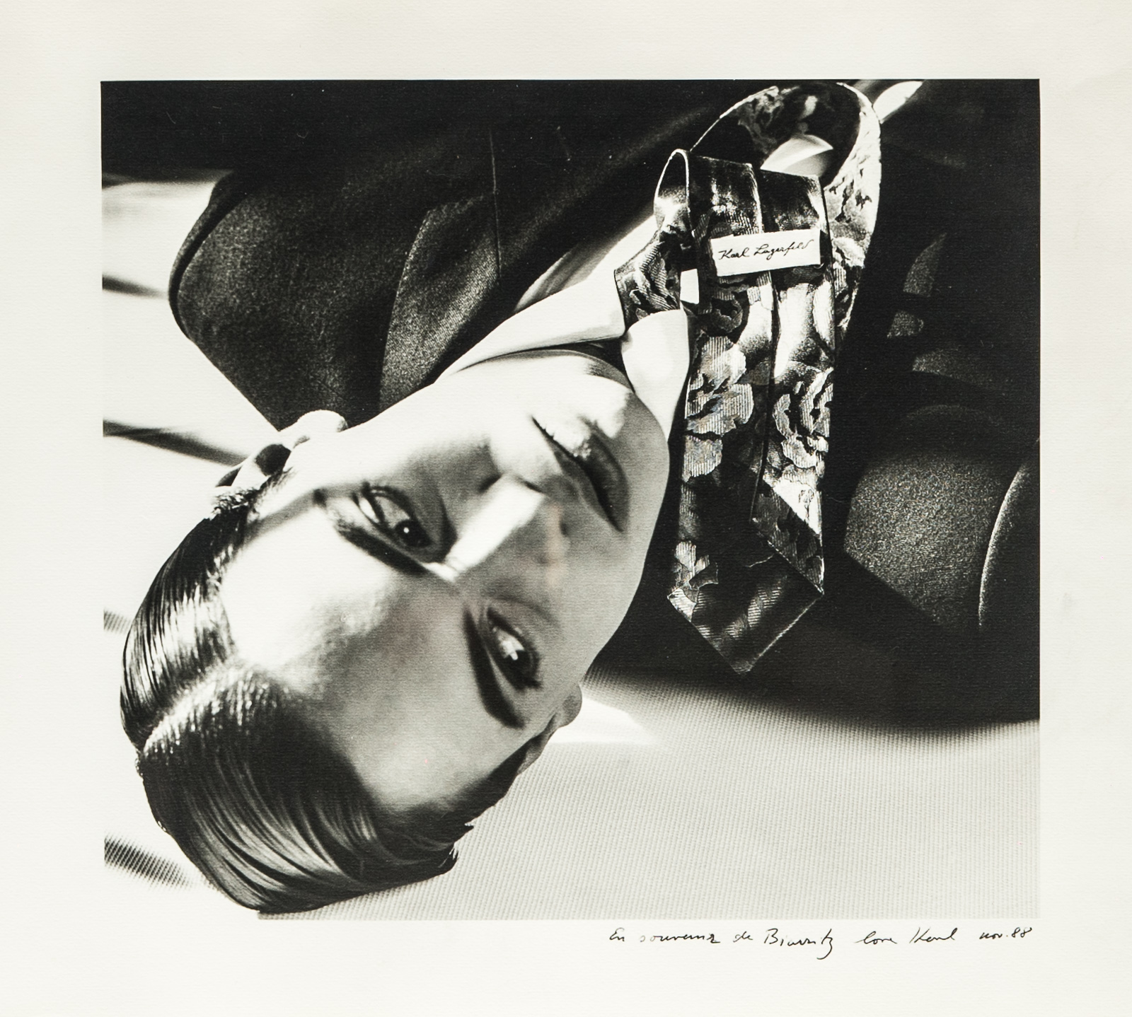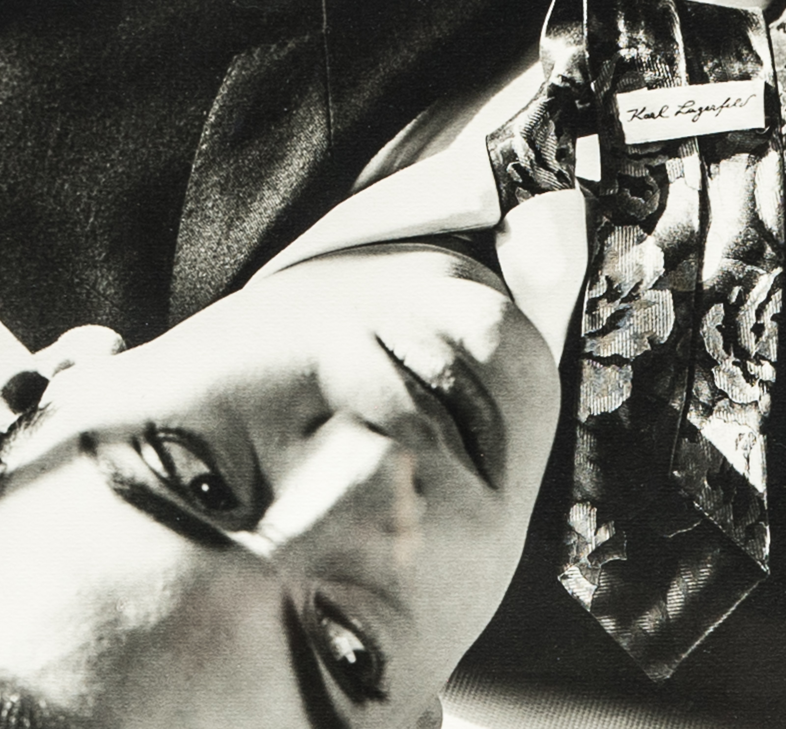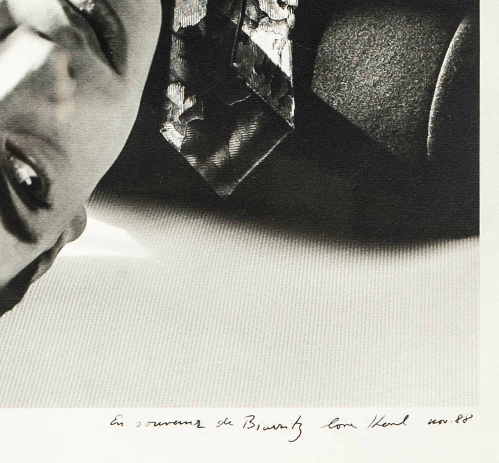 Original silver gelatin print of an unidentified model from Lagerfeld’s studio, dedicated “un souvenier de Biaritz, Love Karl Nov 88”