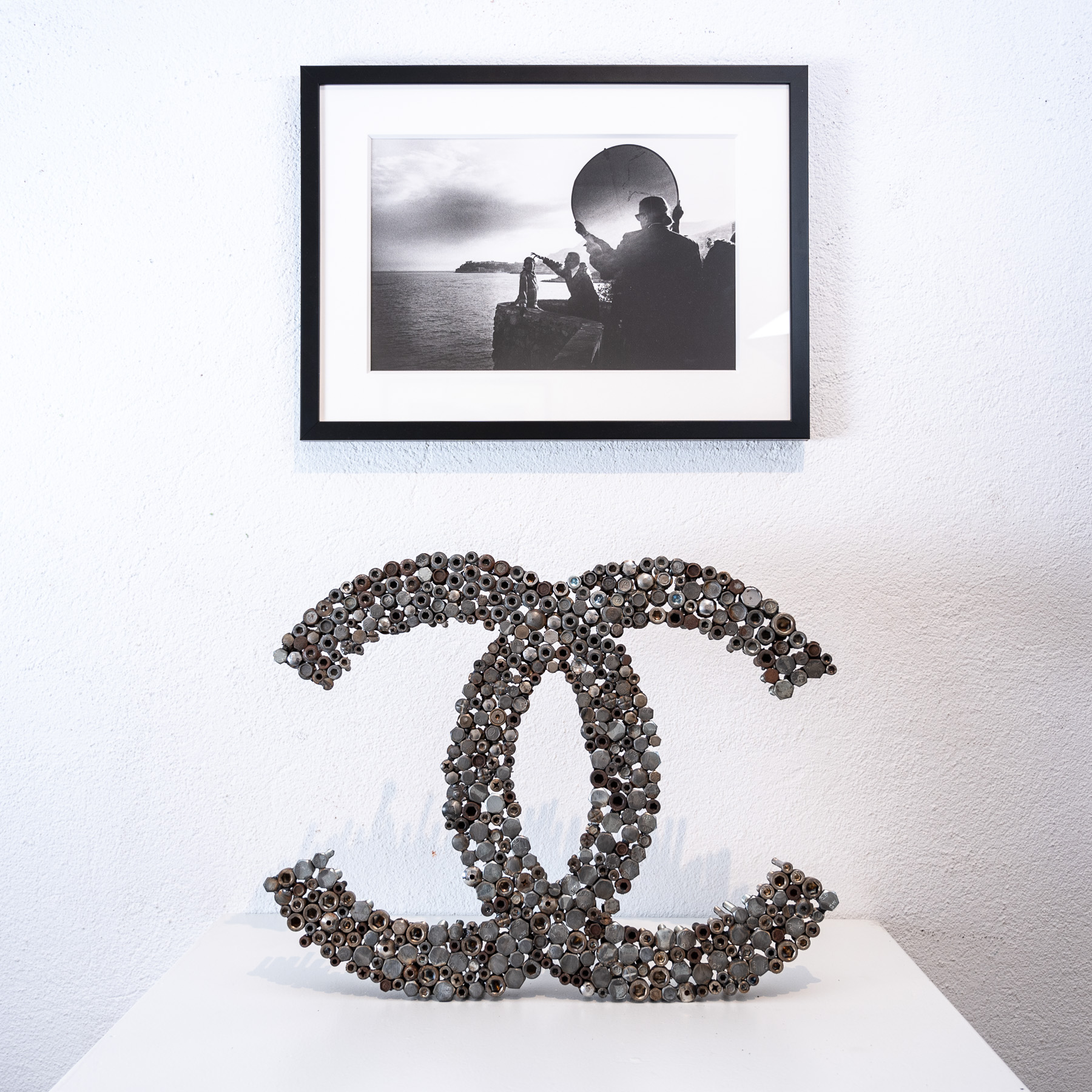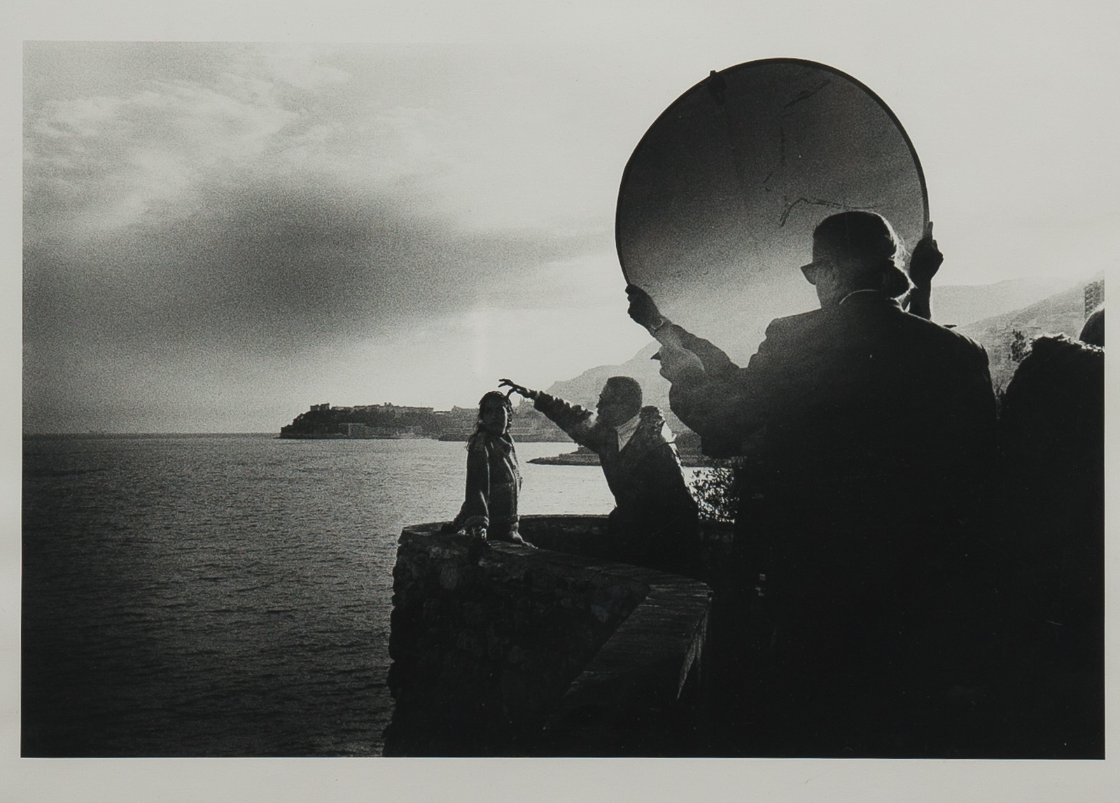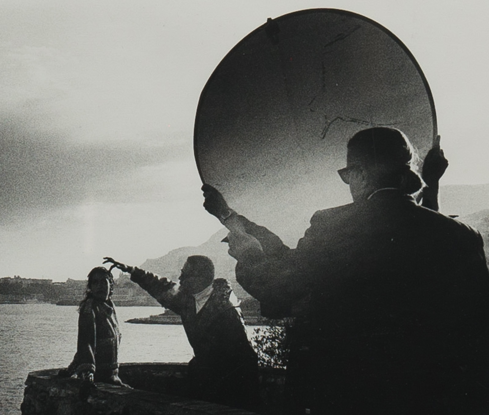Original silver gelatin print of a photo shoot from Karl Lagerfeld’s studio, shows KL himself holding a light reflector.