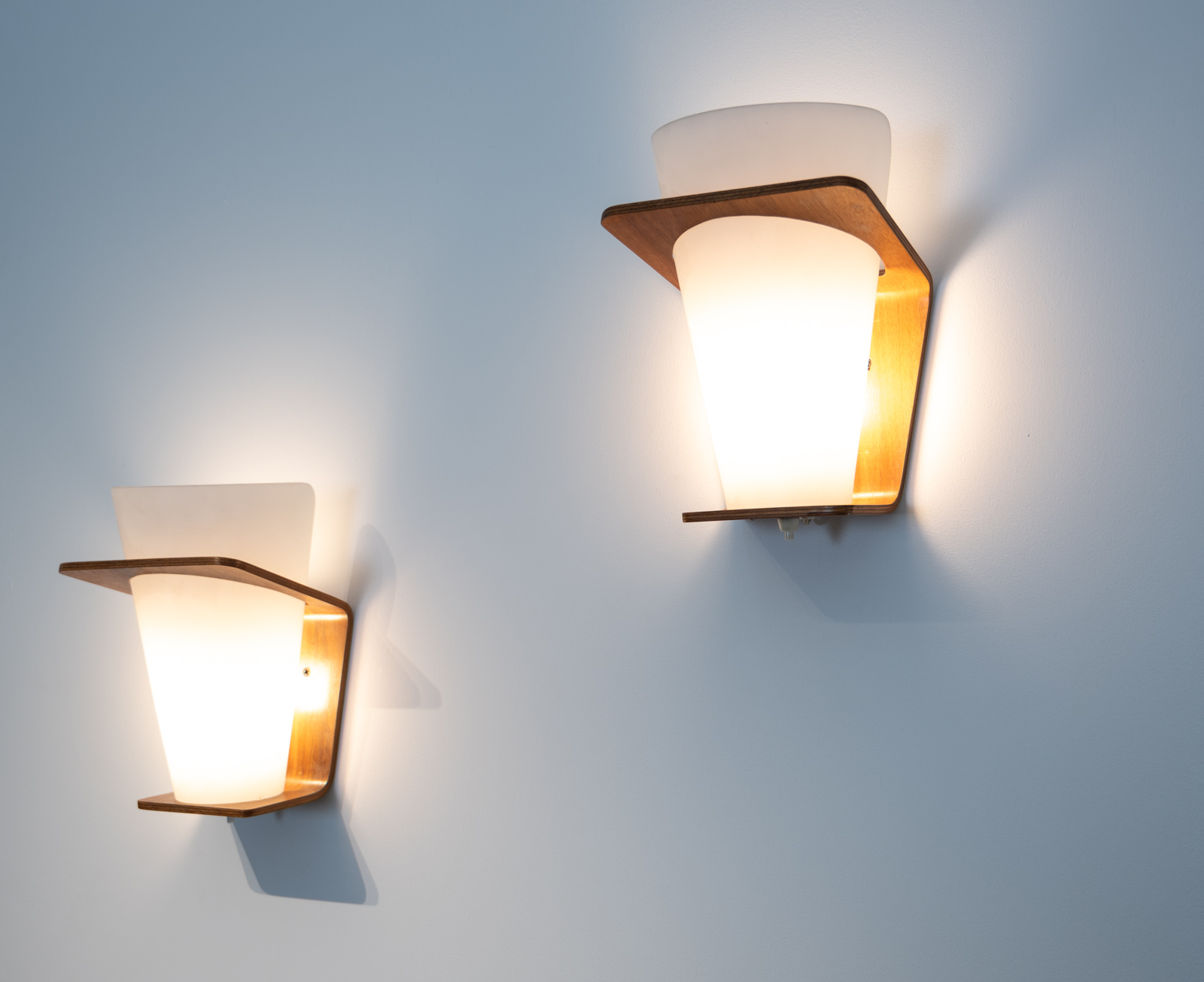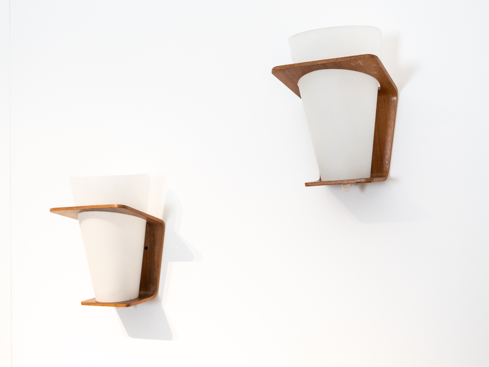 Pair of teak wall lamps model NX 41 designed by Louis Kalff for Philips curved teak plywood and opaline glass.
