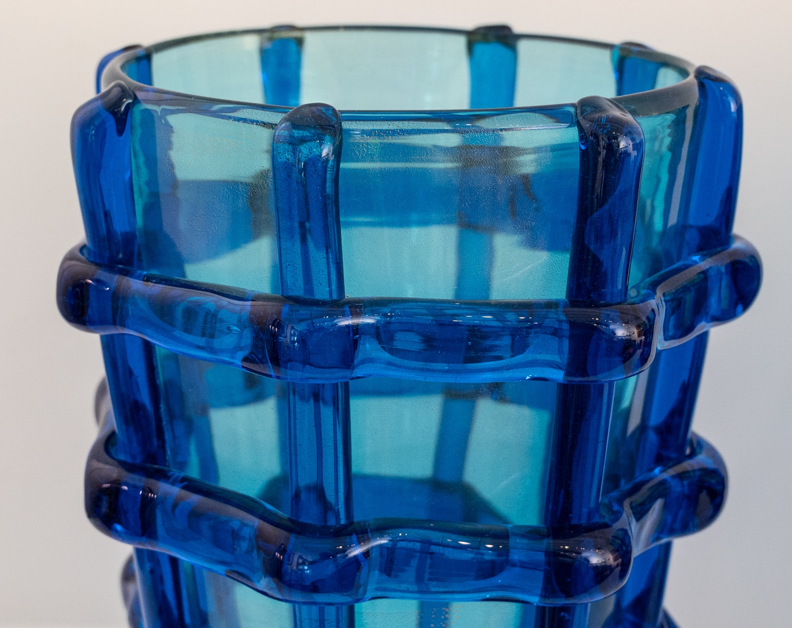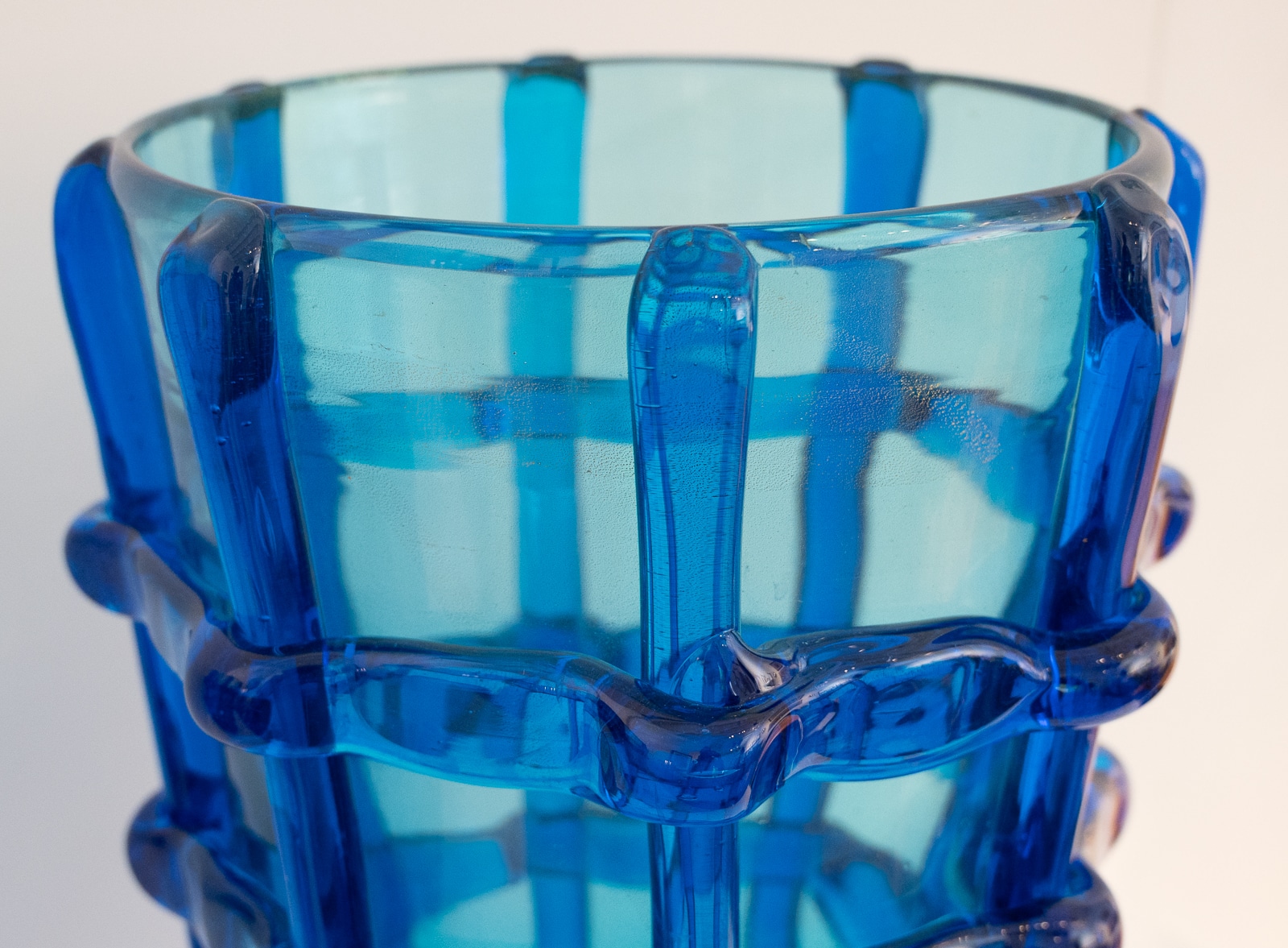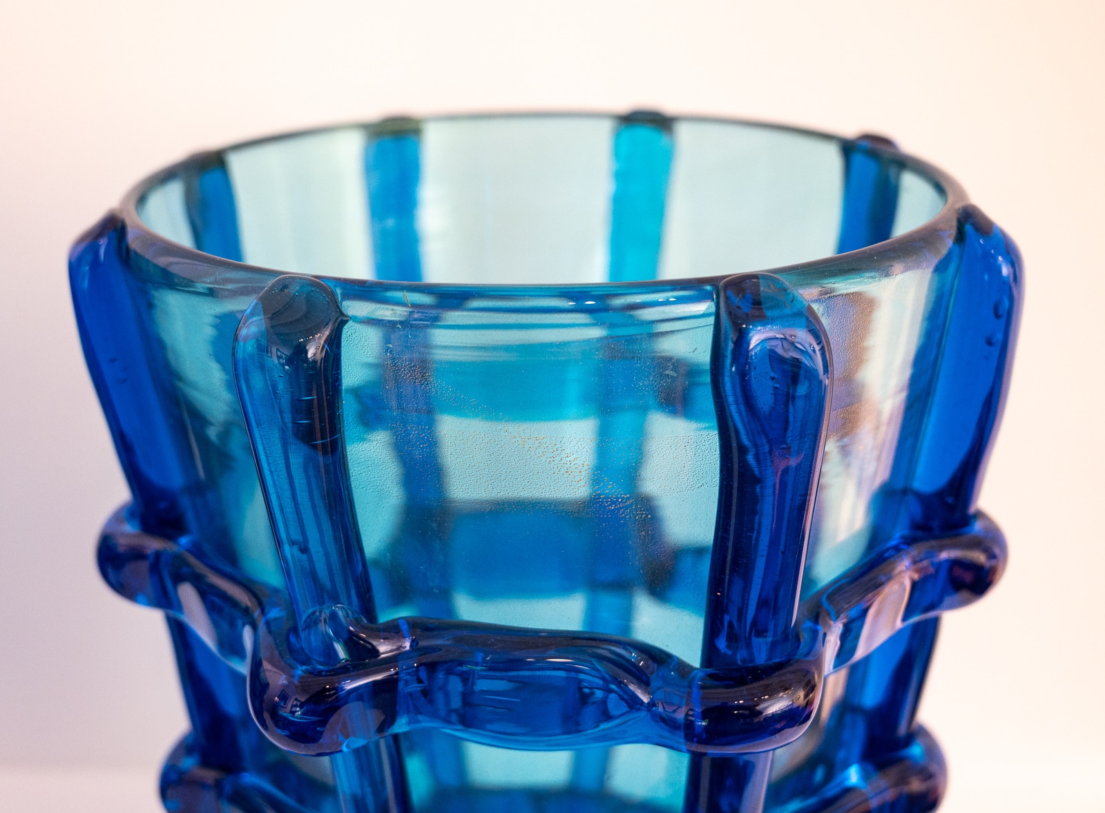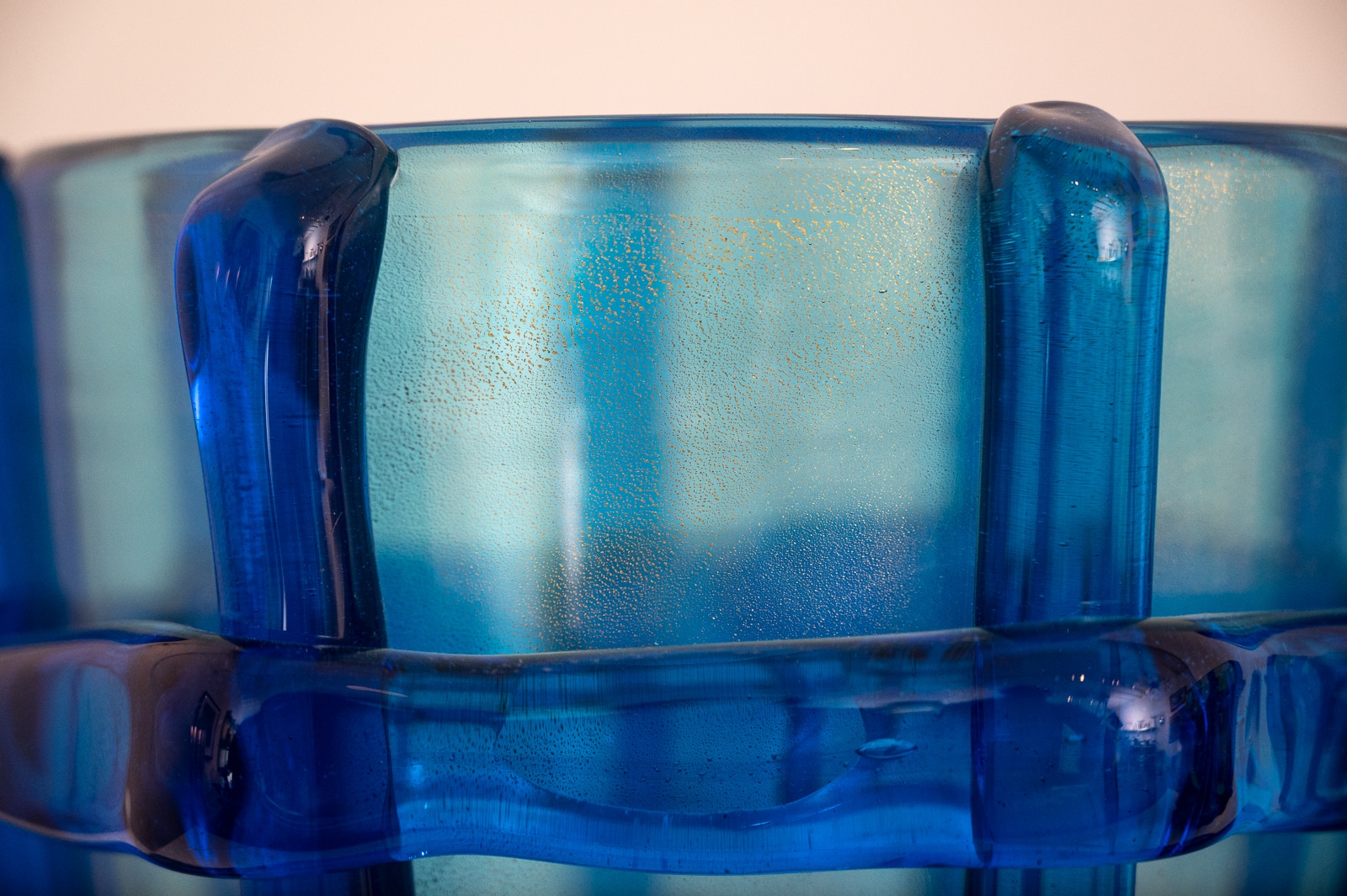 Heavy blue murano glass, applied lattice work decoration with gold inclusions