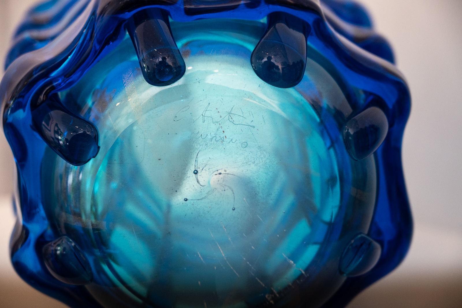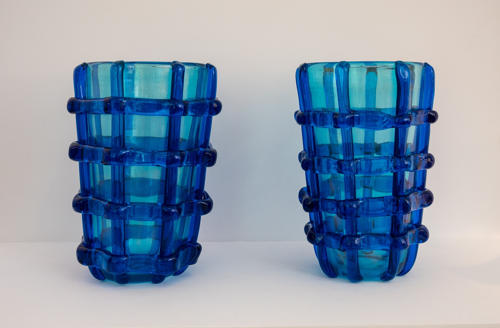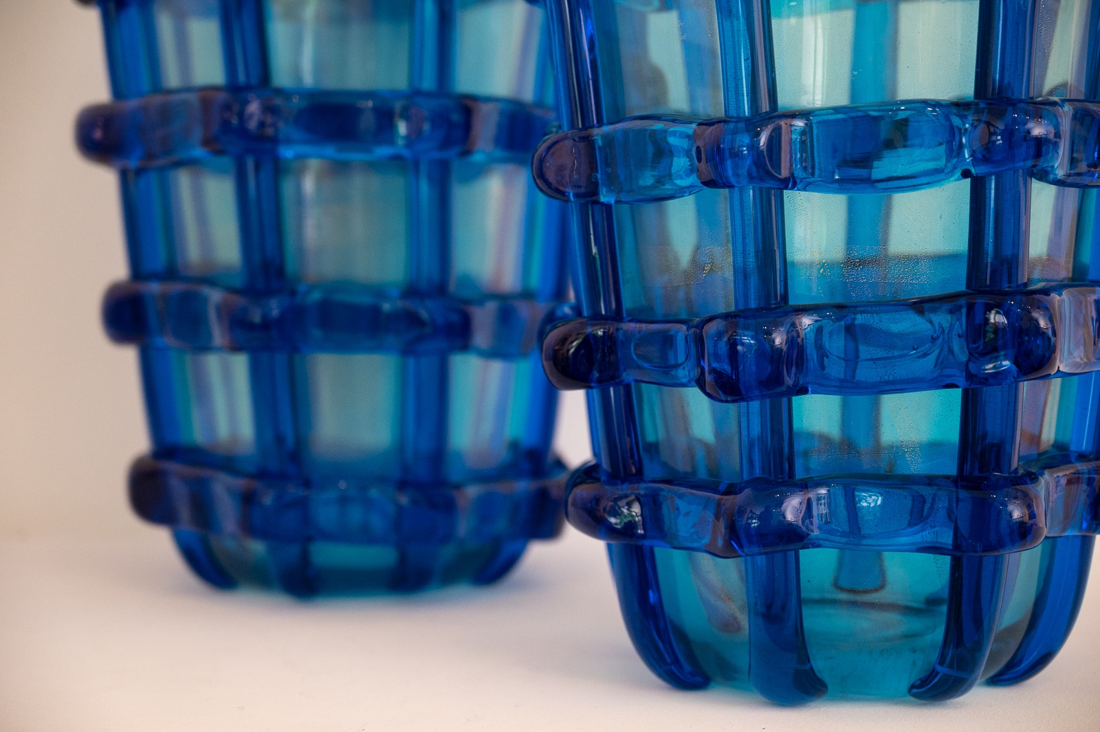 Heavy blue murano glass, applied lattice work decoration with gold inclusions