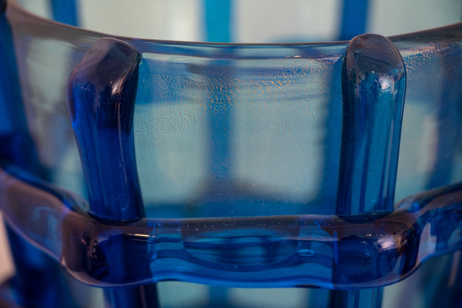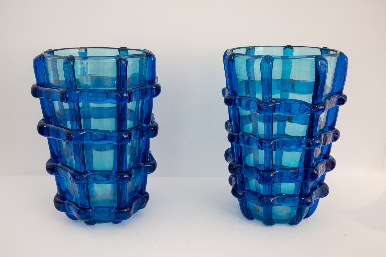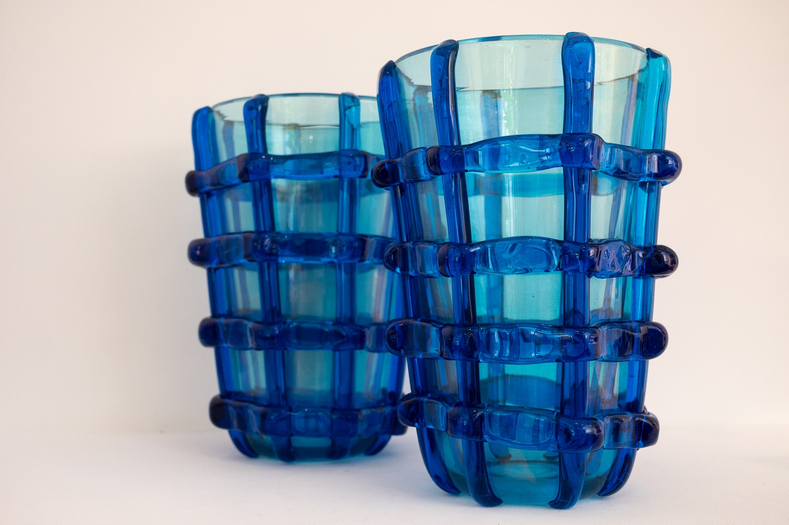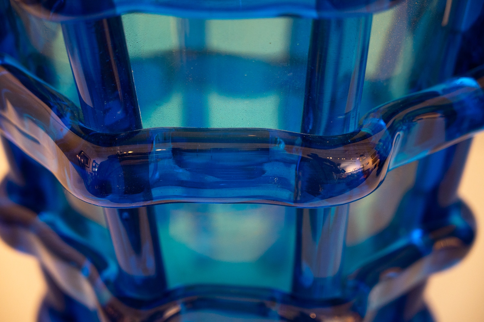 Heavy blue murano glass, applied lattice work decoration with gold inclusions