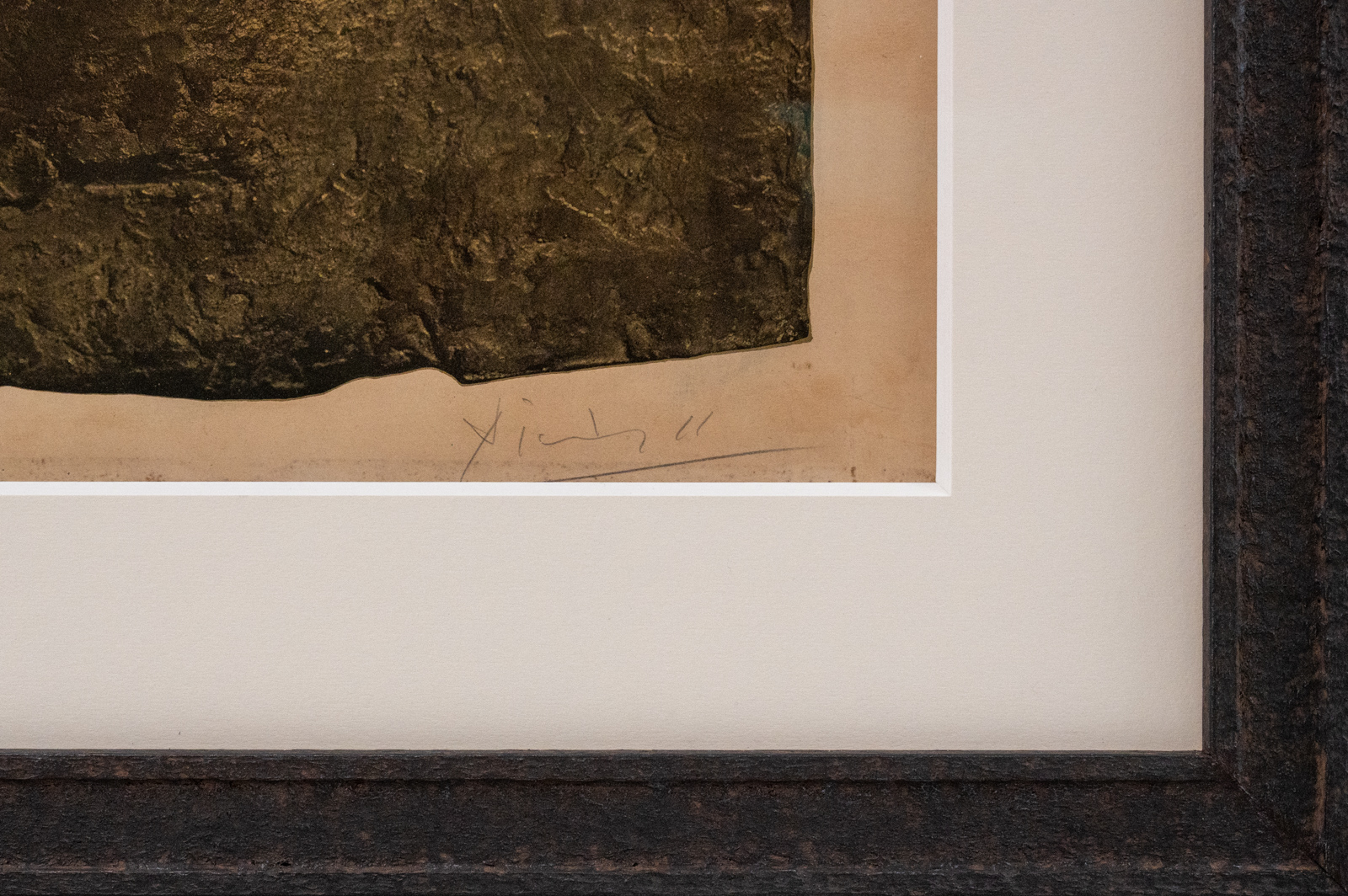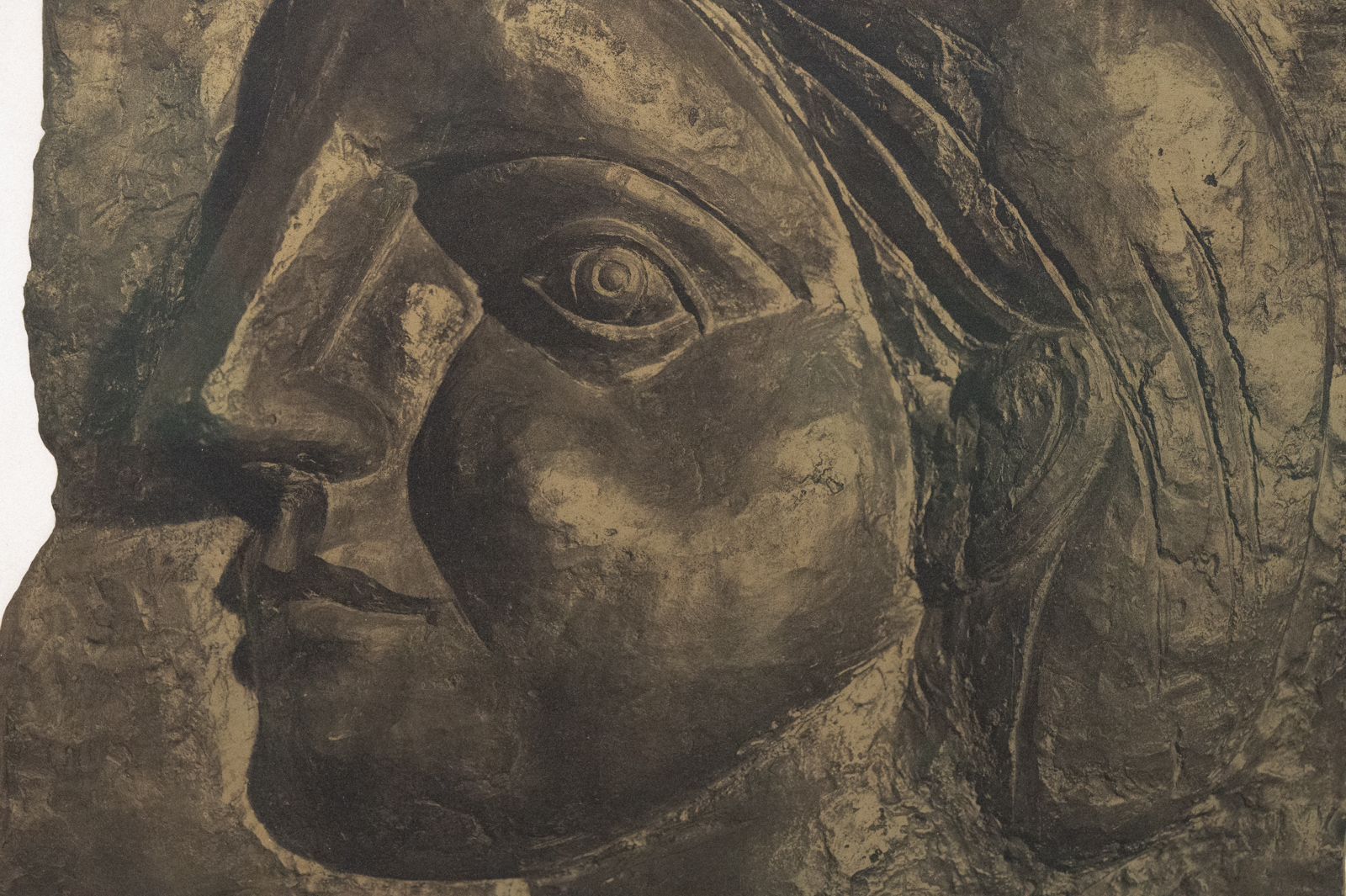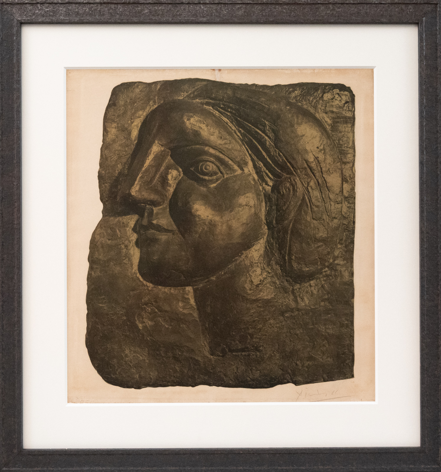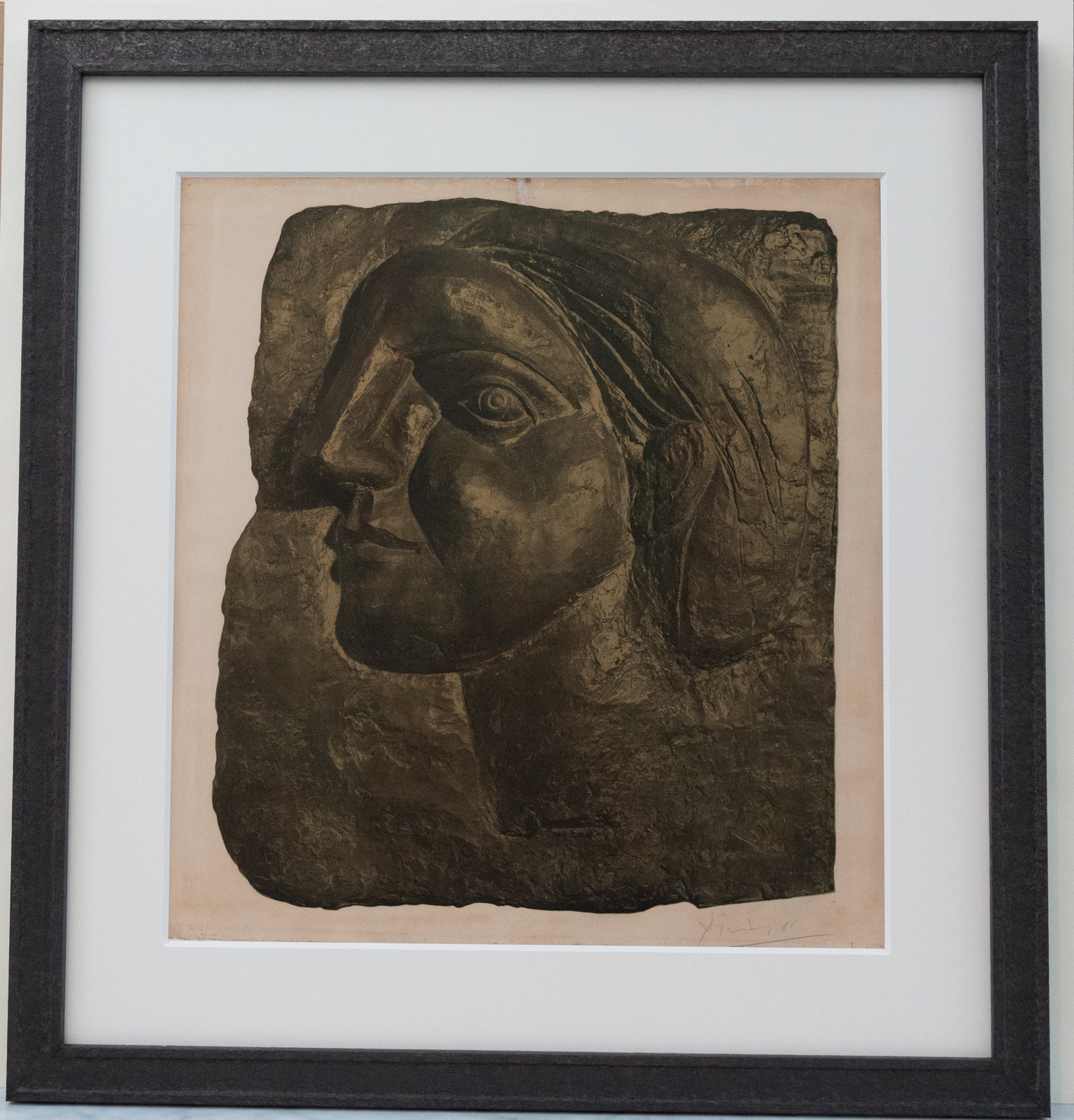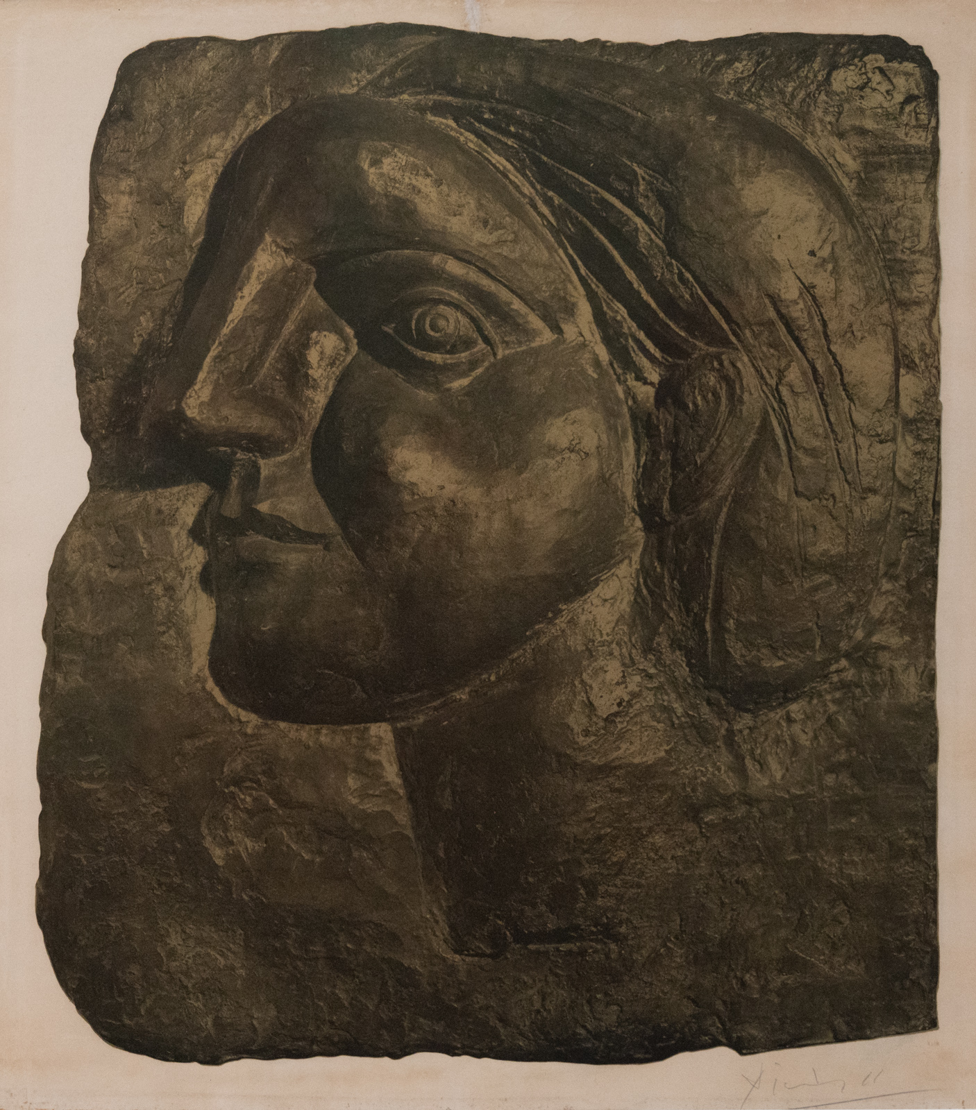 A lithograph of one of Picasso’s more classic profile portraits head of a woman is shaped and contoured suggesting a sculptural relief giving the life-like illusion and recreation of Marie-Thérèse herself. Printed by Mourlot in 1958, Signed by Picasso. Proof(?) for the edition of 150