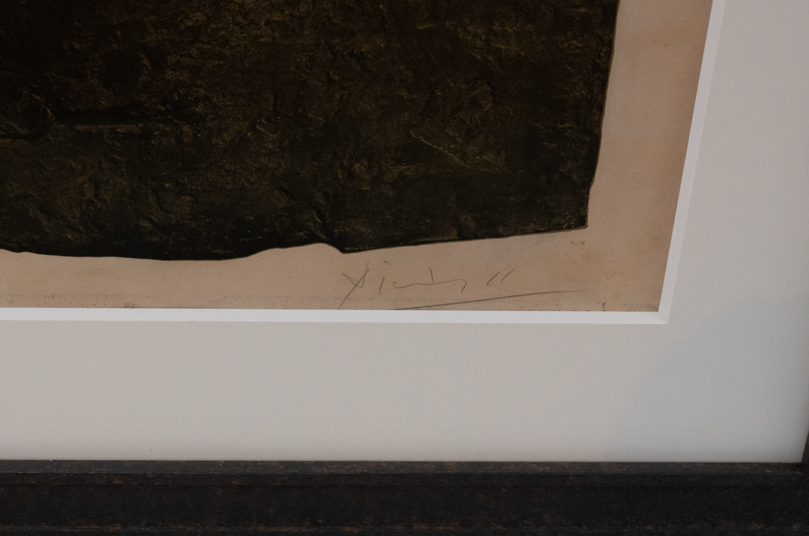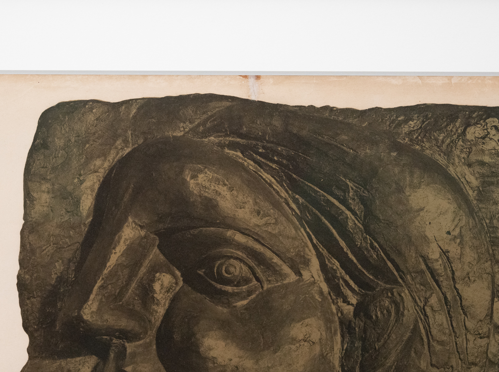 Created in 1958, this image was created for a poster designated for an exposition of Picasso’s sculptures and drawings during the same year at the Maison de la Pensée Française, Paris. The poster with the lettering was out of an edition of 800 while there was an additional edition of 150 featuring only the image without the text. It is hand-signed by the artist in pencil in the lower right margin.