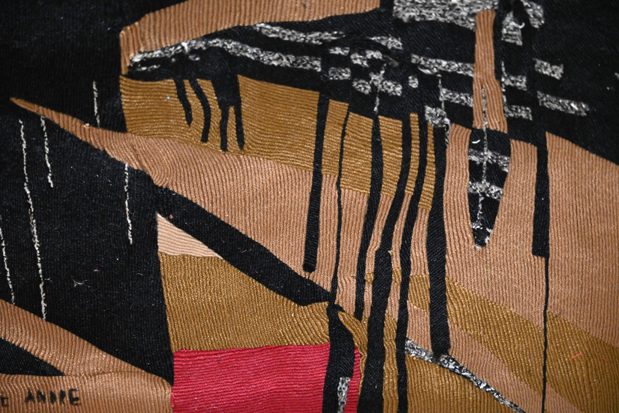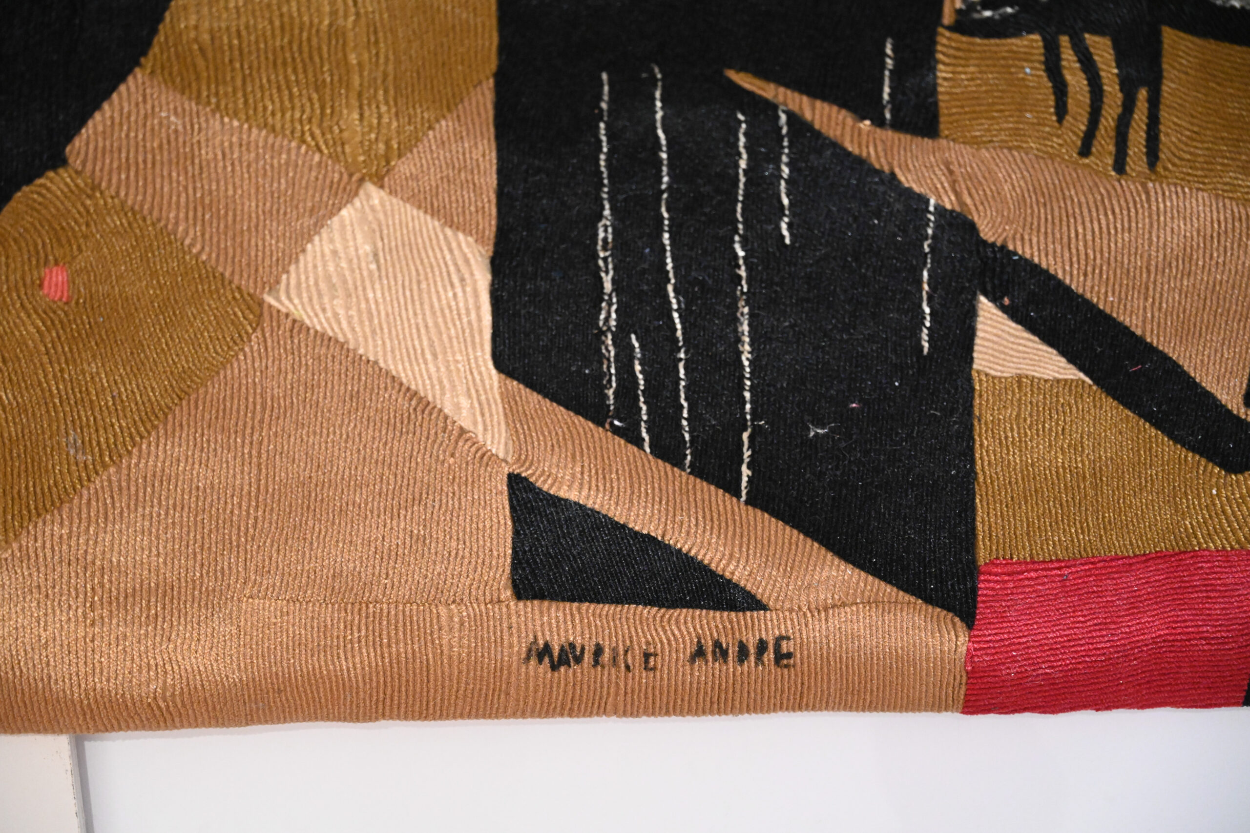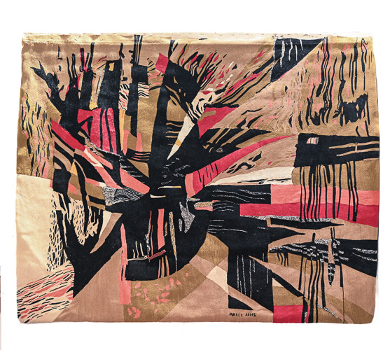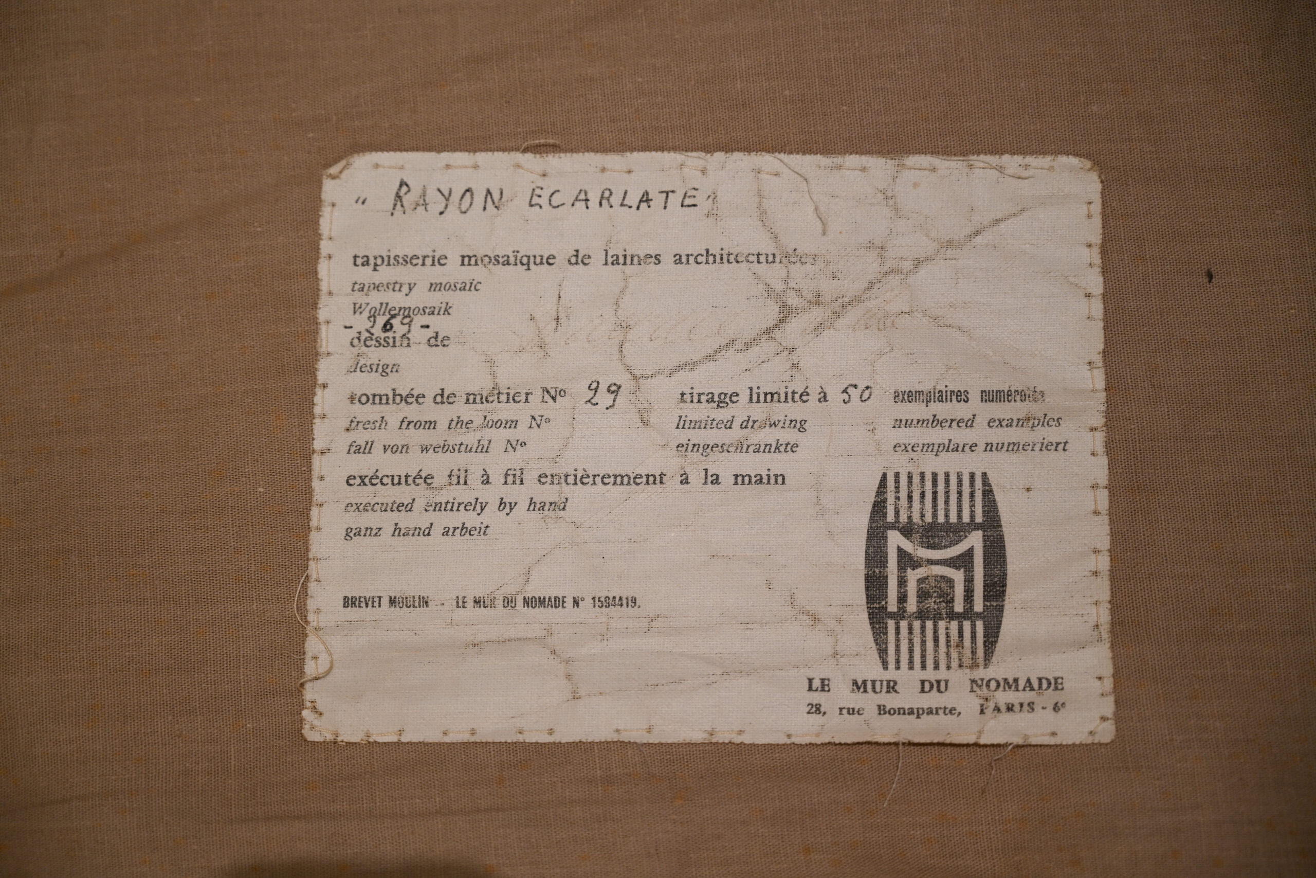 Designed by Maurice André and produced by the Paris studio Le Mur du Nomade, Rayon Écarlate is a striking example of post-war French abstract tapestry. Executed entirely by hand using architectured wool mosaics, the composition combines bold geometry, rhythmic line work and a powerful, radiating structure characteristic of modernist interior commissions of the period. Retaining its original studio label and patent reference, this limited-edition work exemplifies the renewed role of tapestry in mid-century French design.