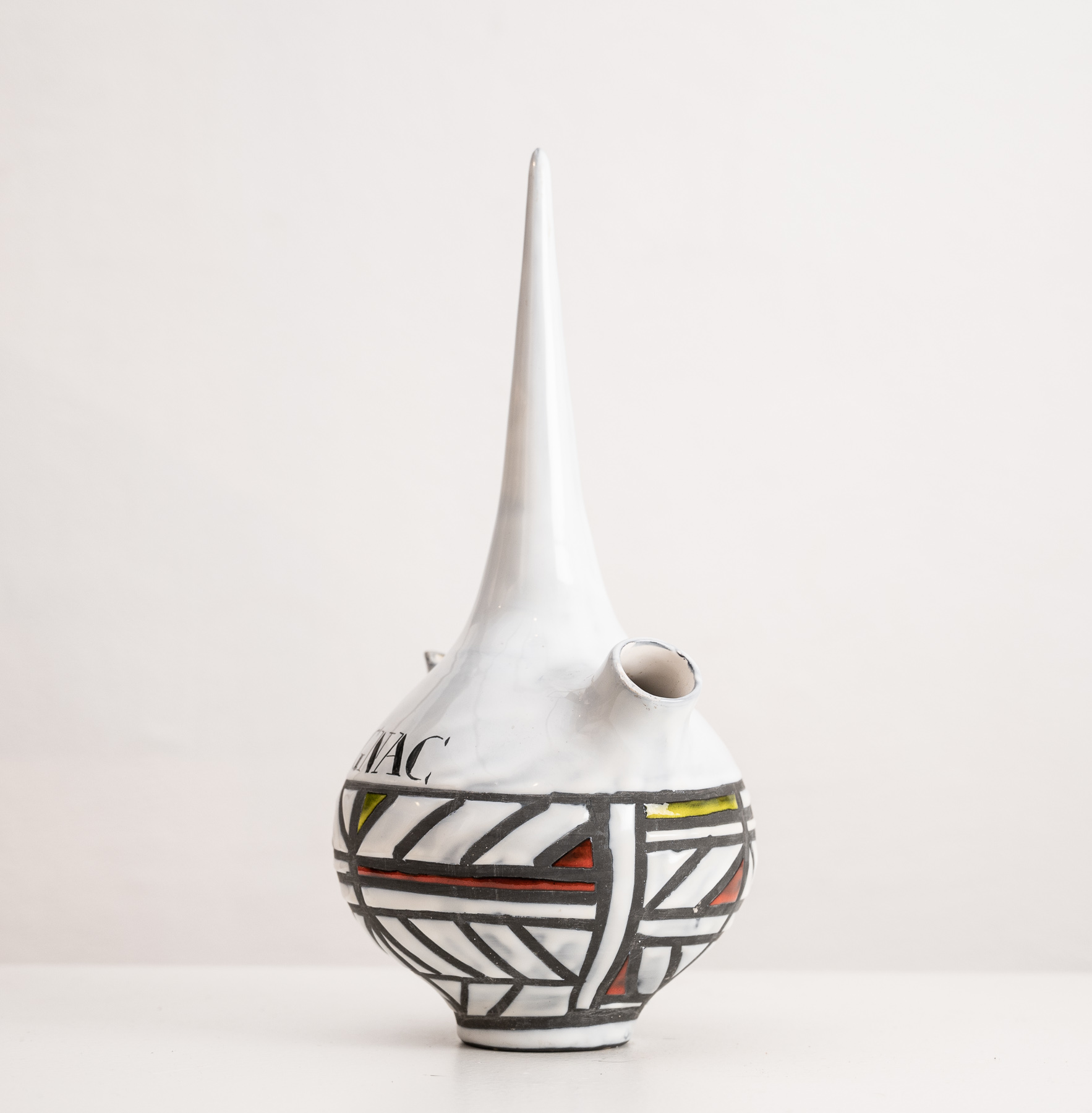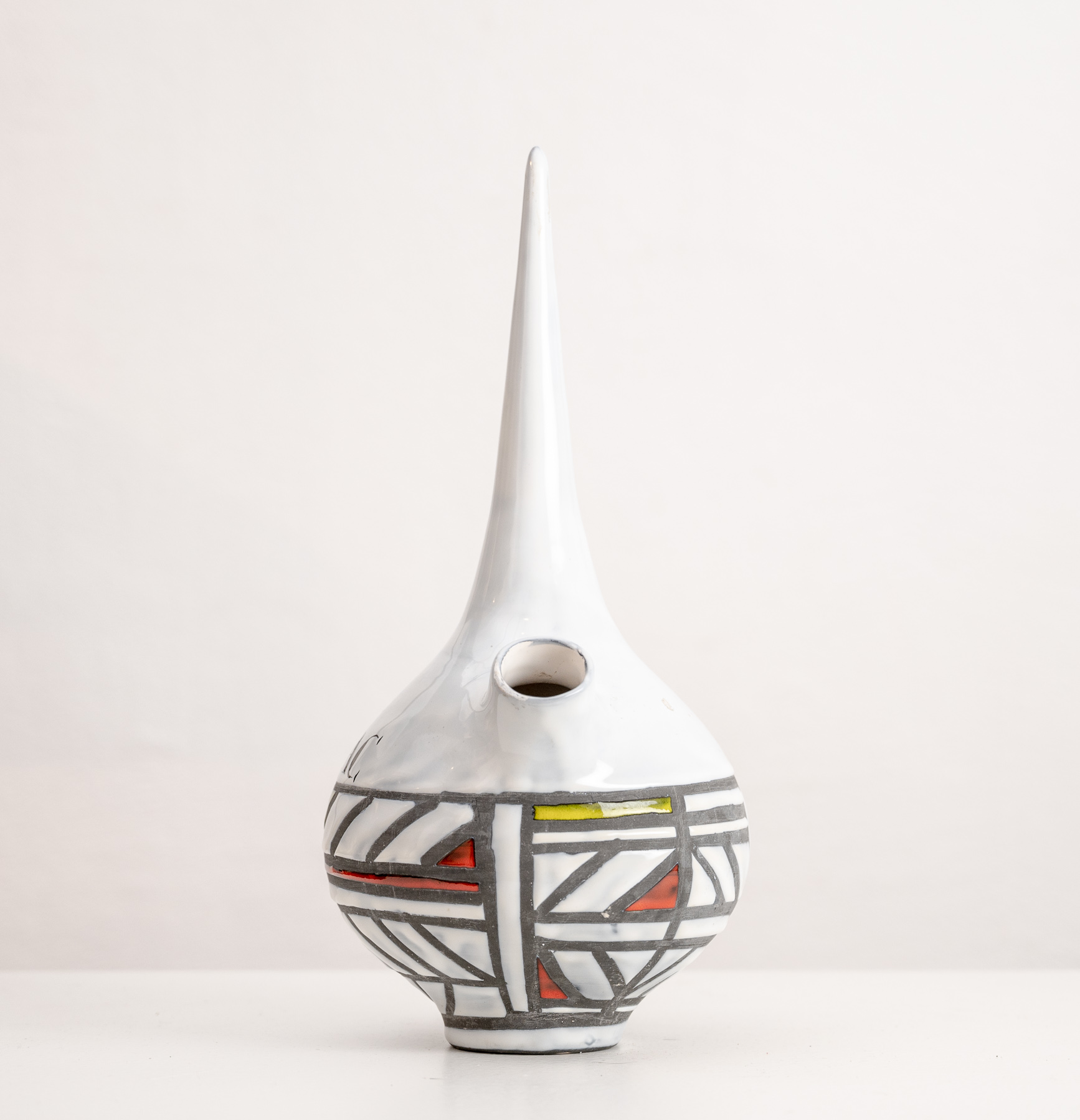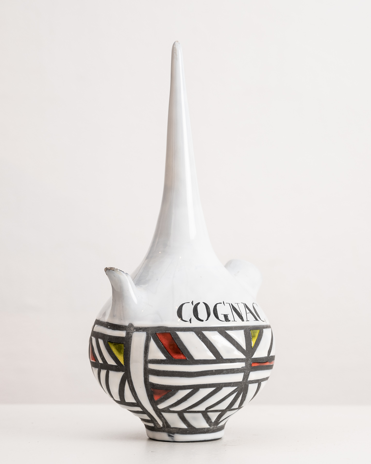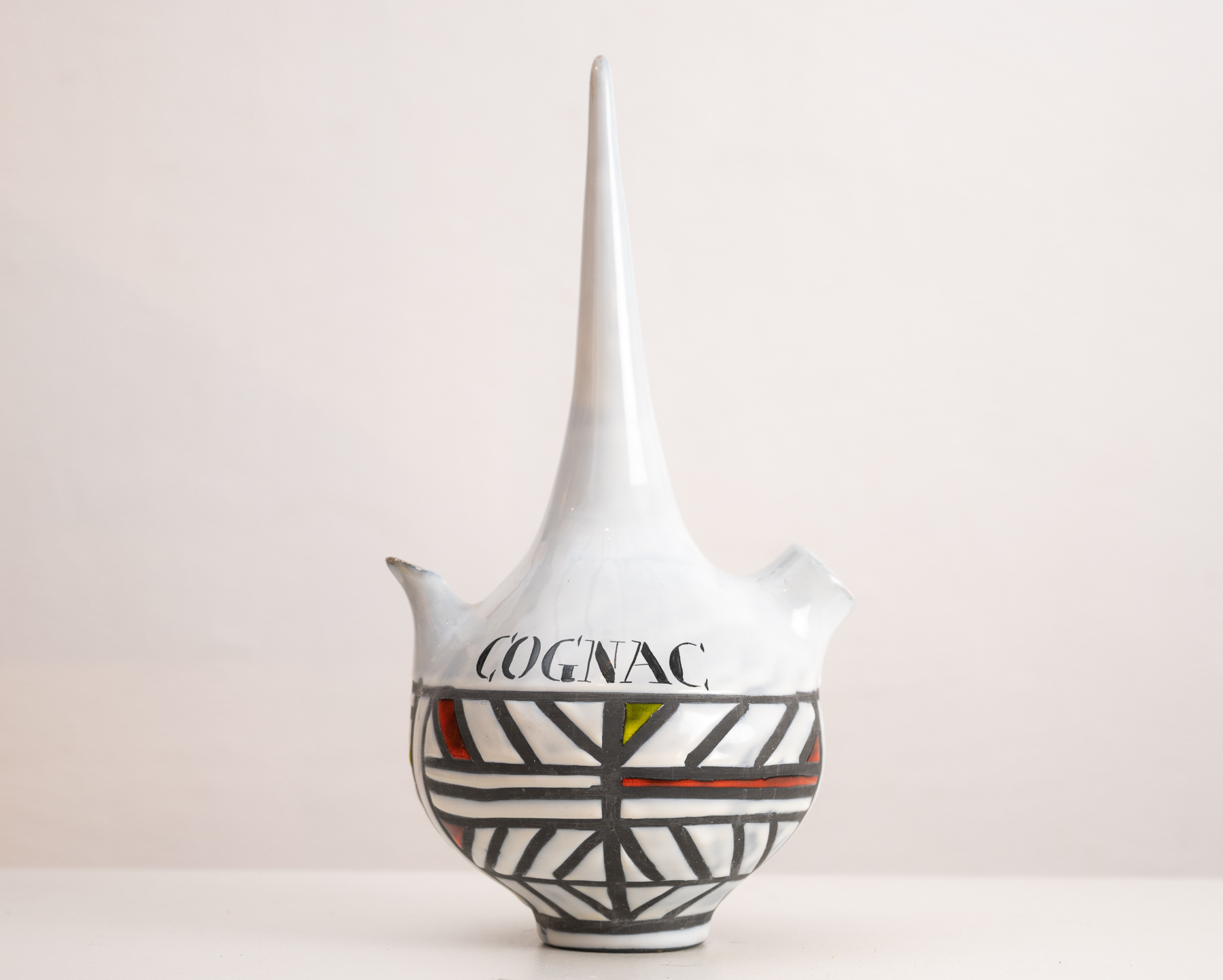 Cognac flask by Roger Capron with gray and colour geometric decoration raised on a round base