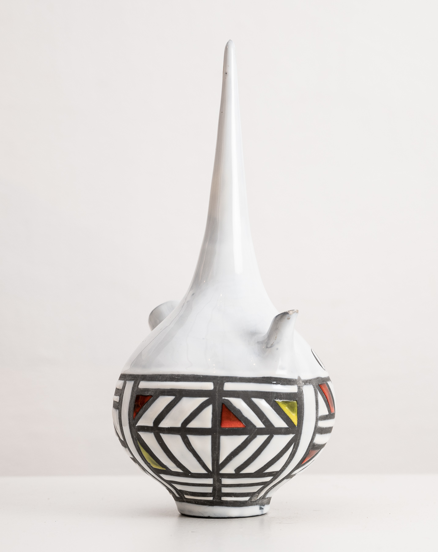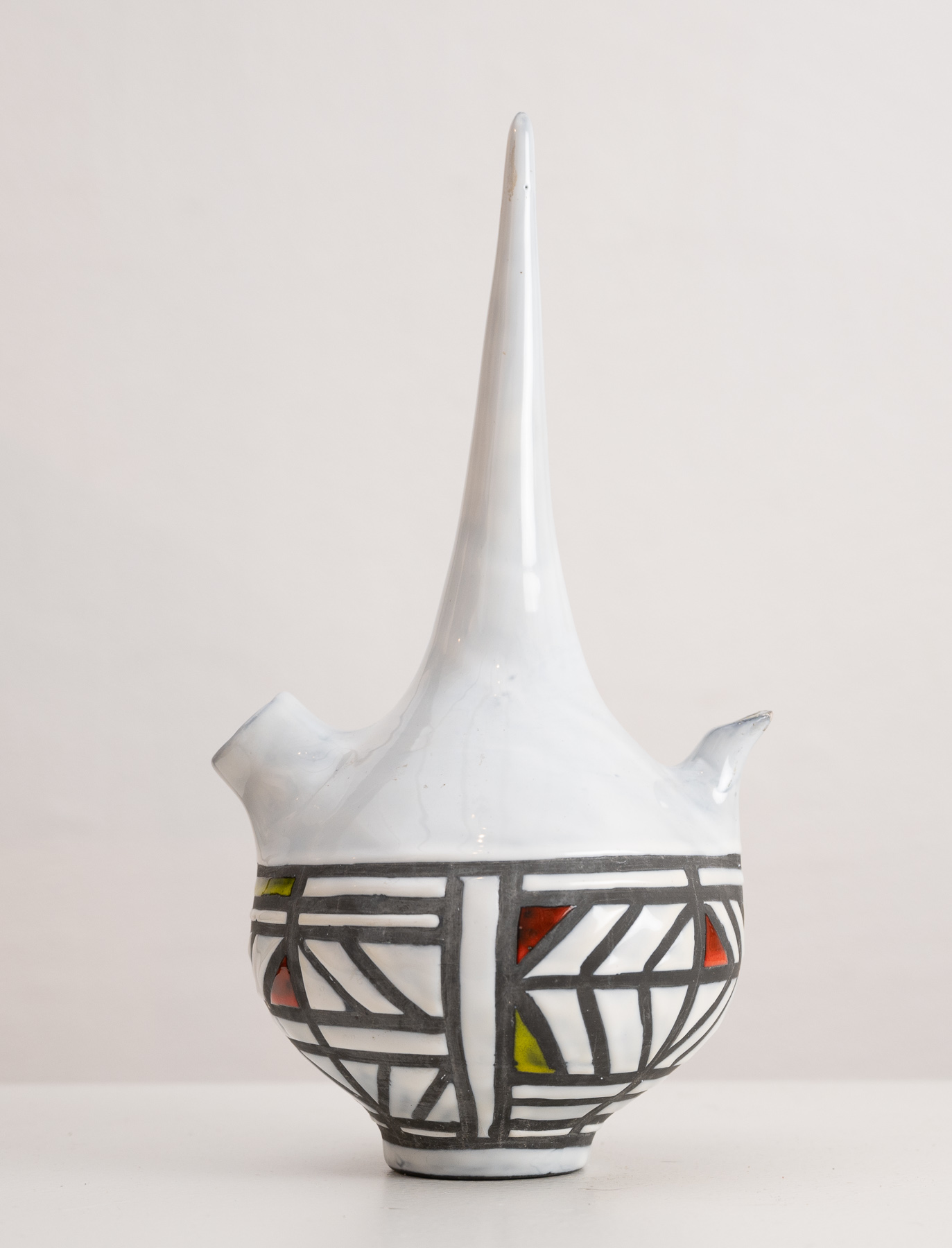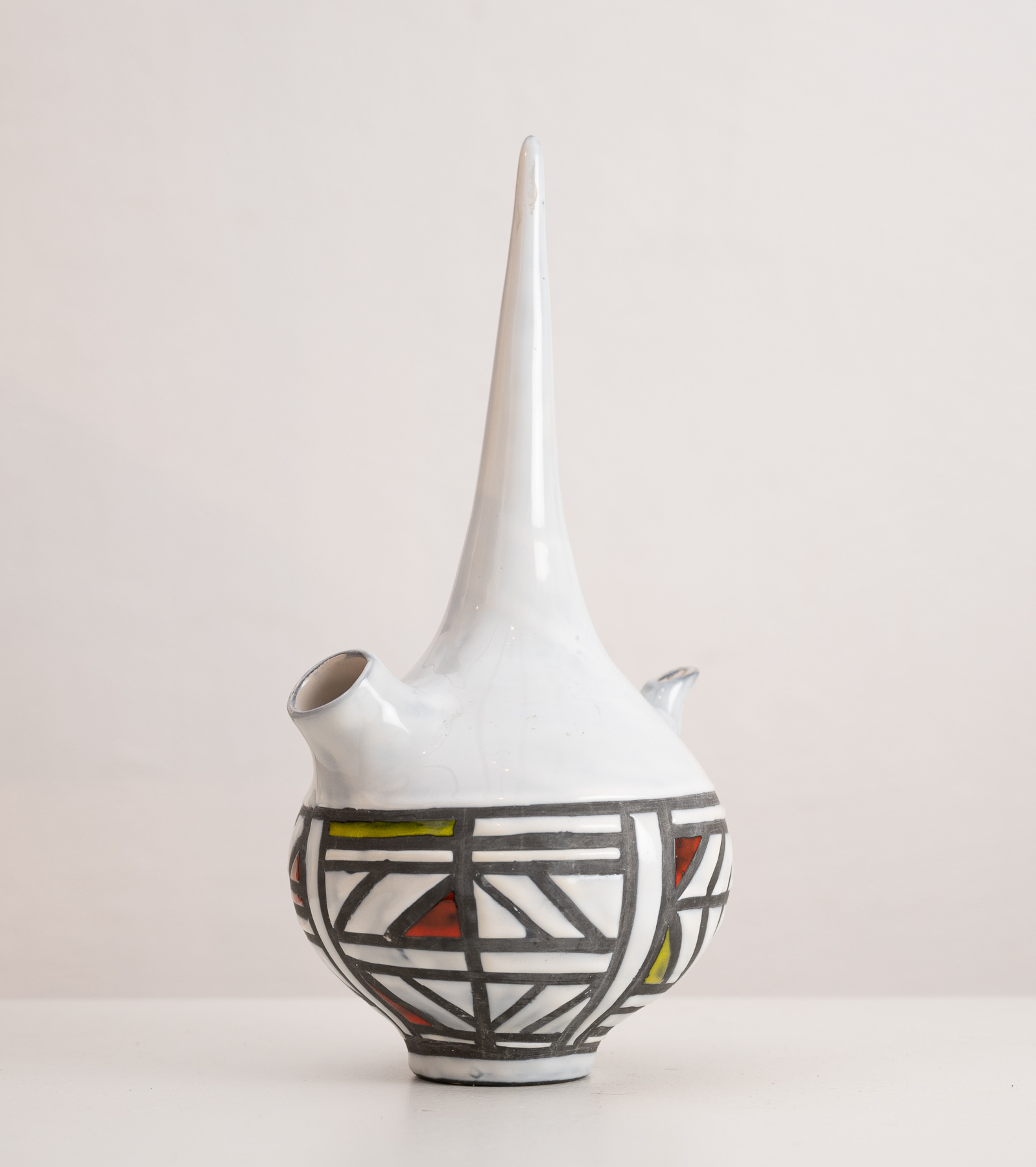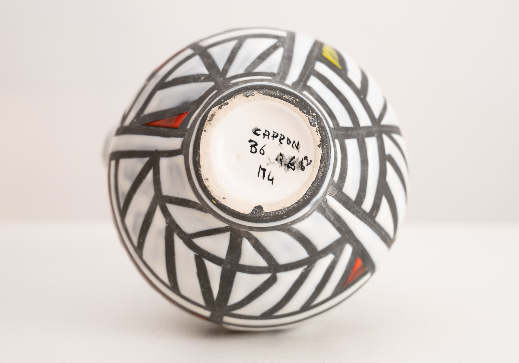 Cognac flask by Roger Capron with gray and colour geometric decoration raised on a round base