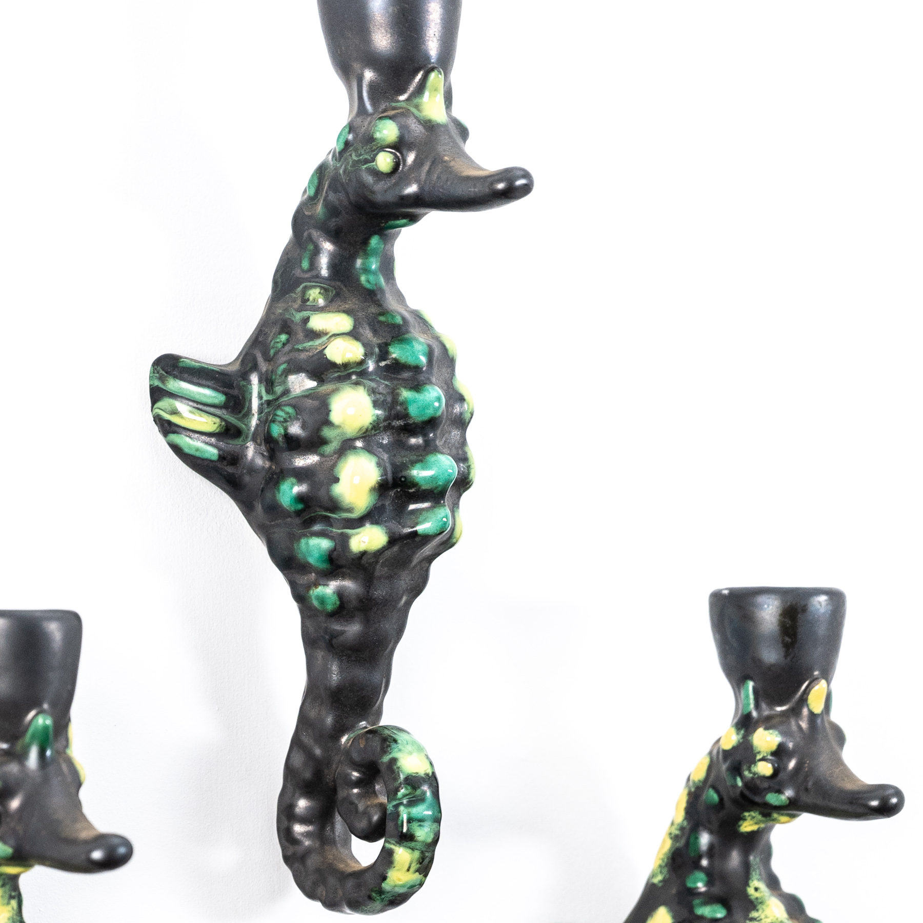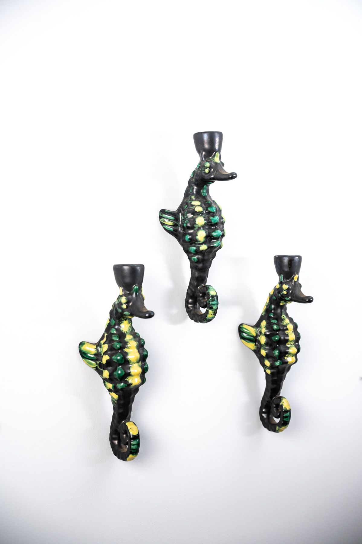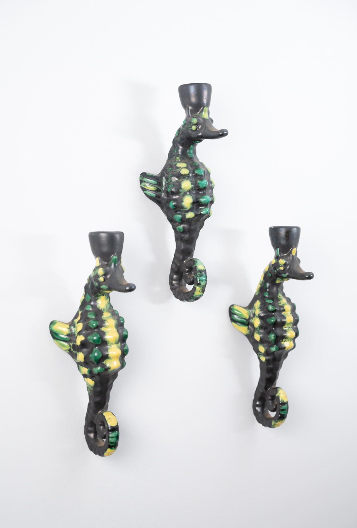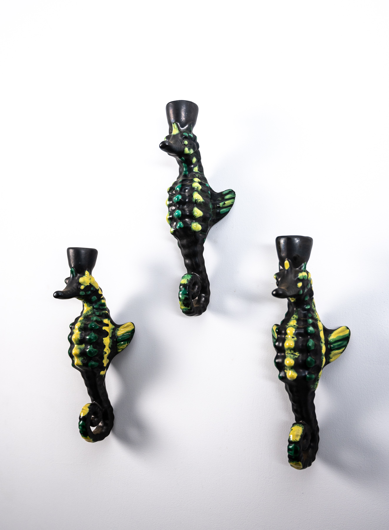 set of three mid century Vallauris ceramic seahorse wall lights by Albert Ferlay