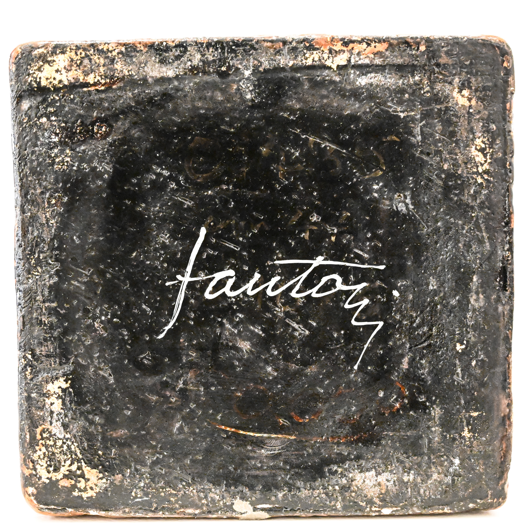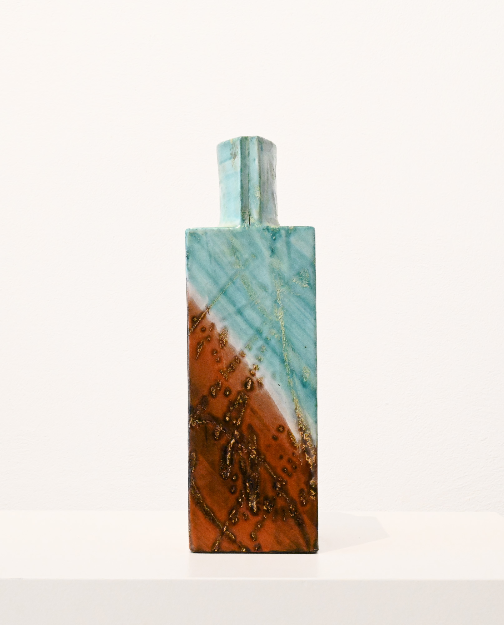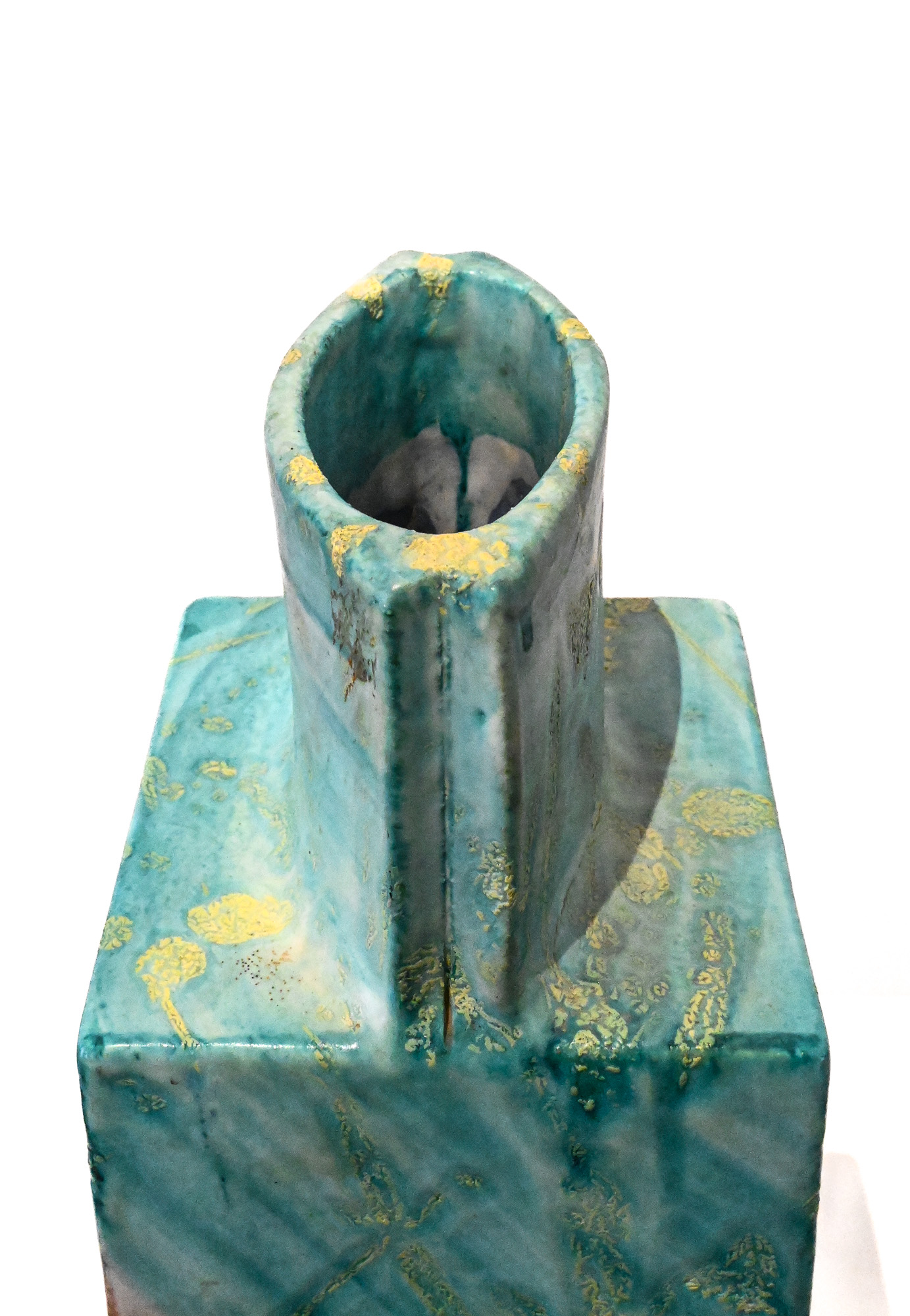 Square aqua and brown square slab vase by Marcello Fantoni (1915-2011) – Florence, Italy Signed to the base Fantoni.