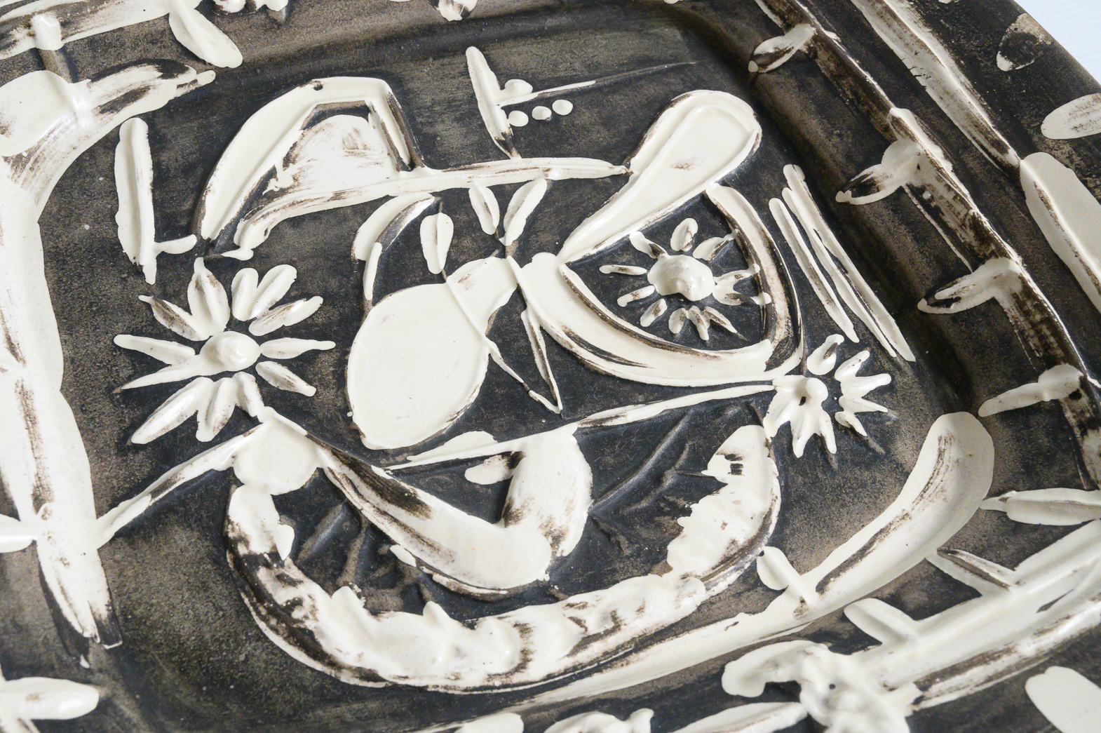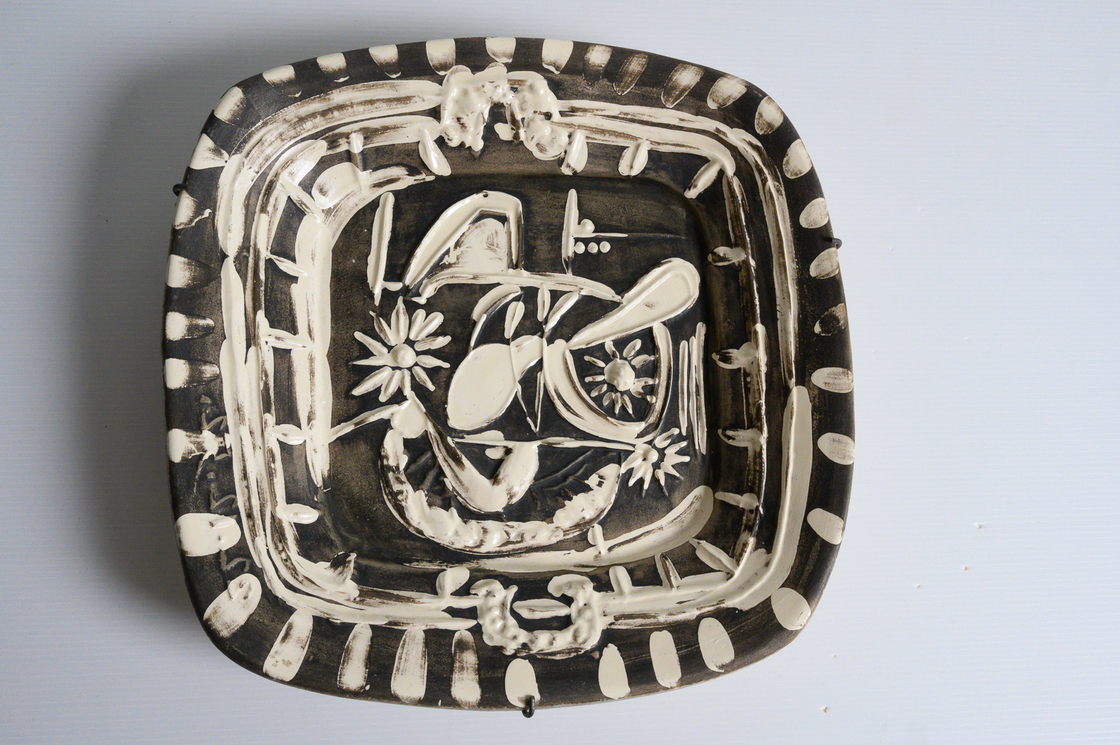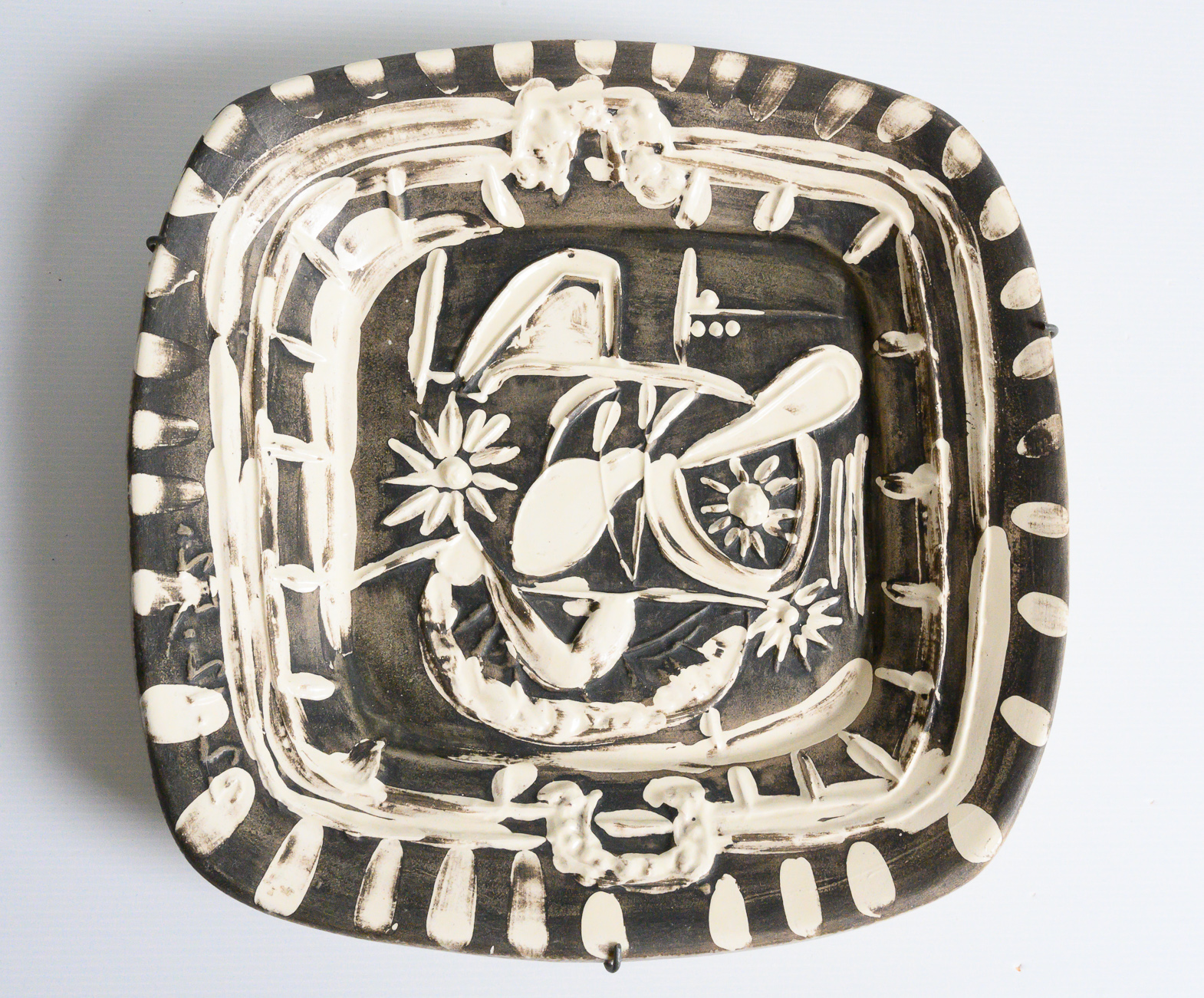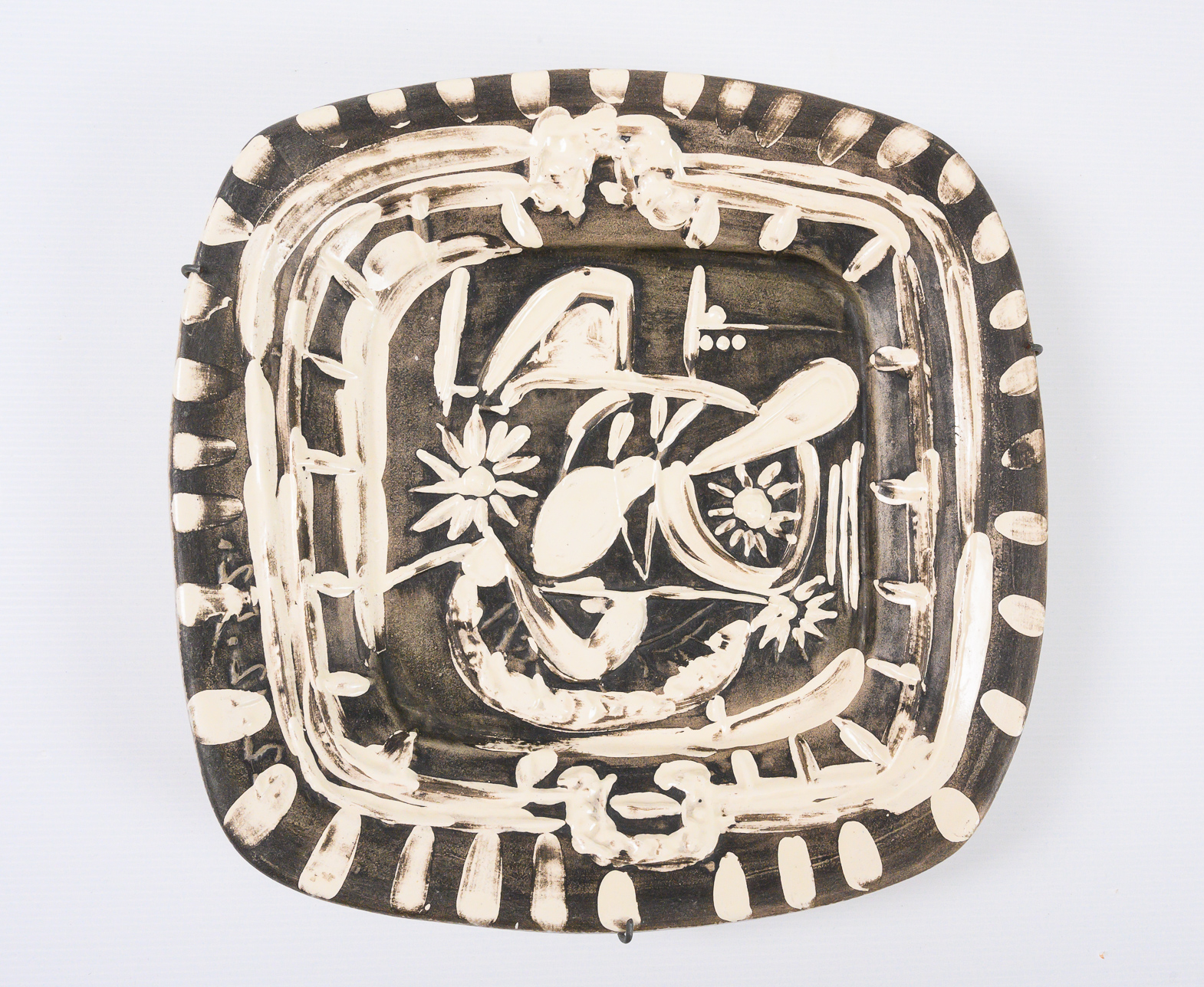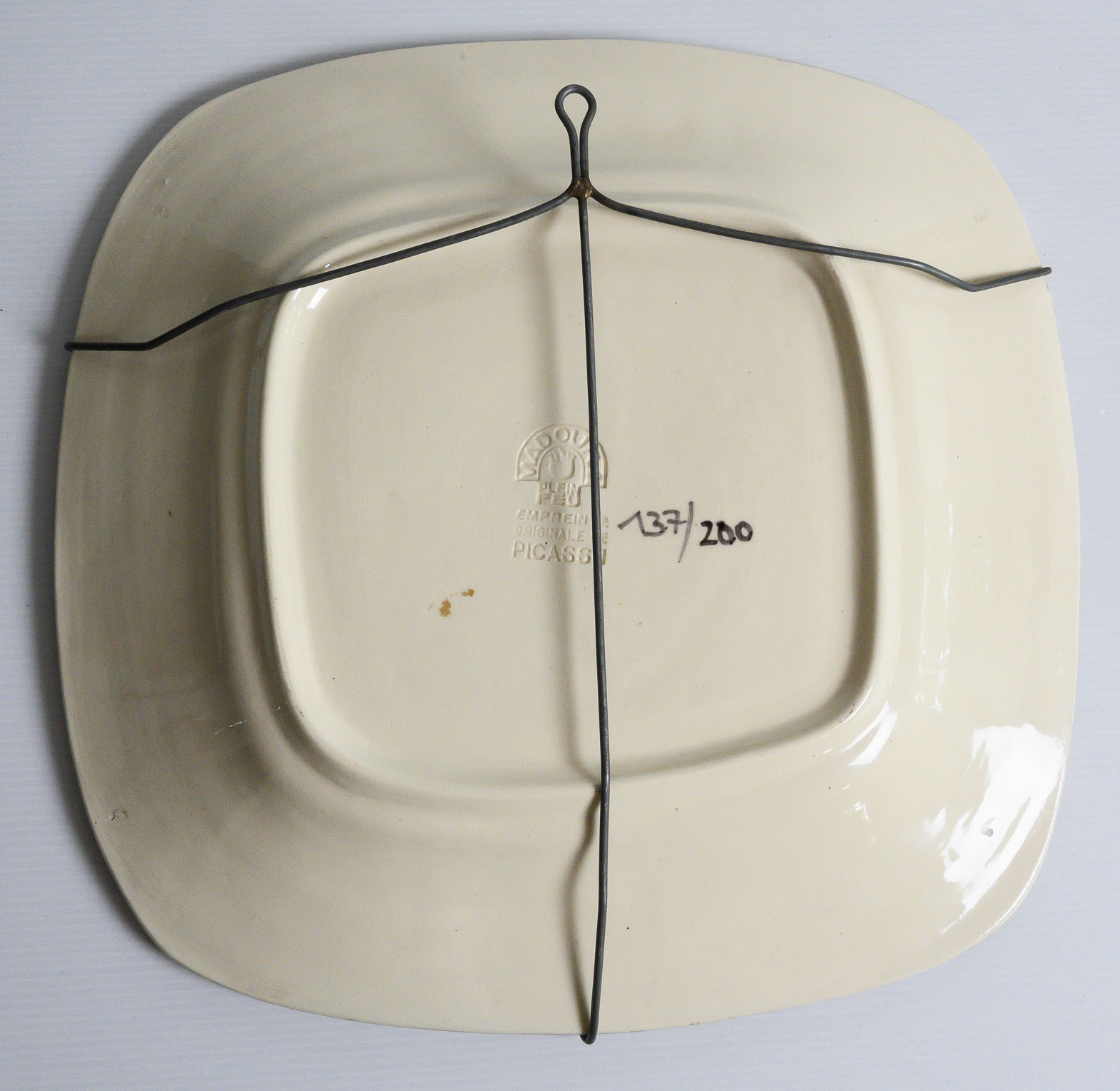 partially glazed white earthenware dish painted in grey and white, numbered 137/200, with the ‘MADOURA PLEIN FEU’ and ‘EMPREINTE ORIGINALE DE PICASSO’ pottery stamps on the underside, Alain Ramié N°165.