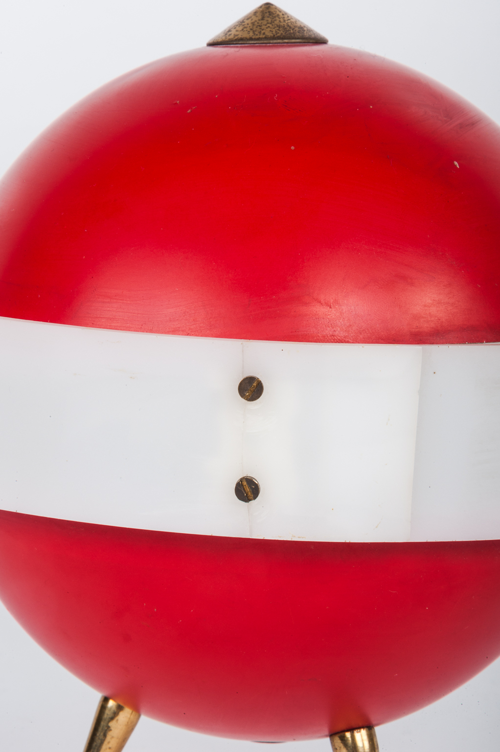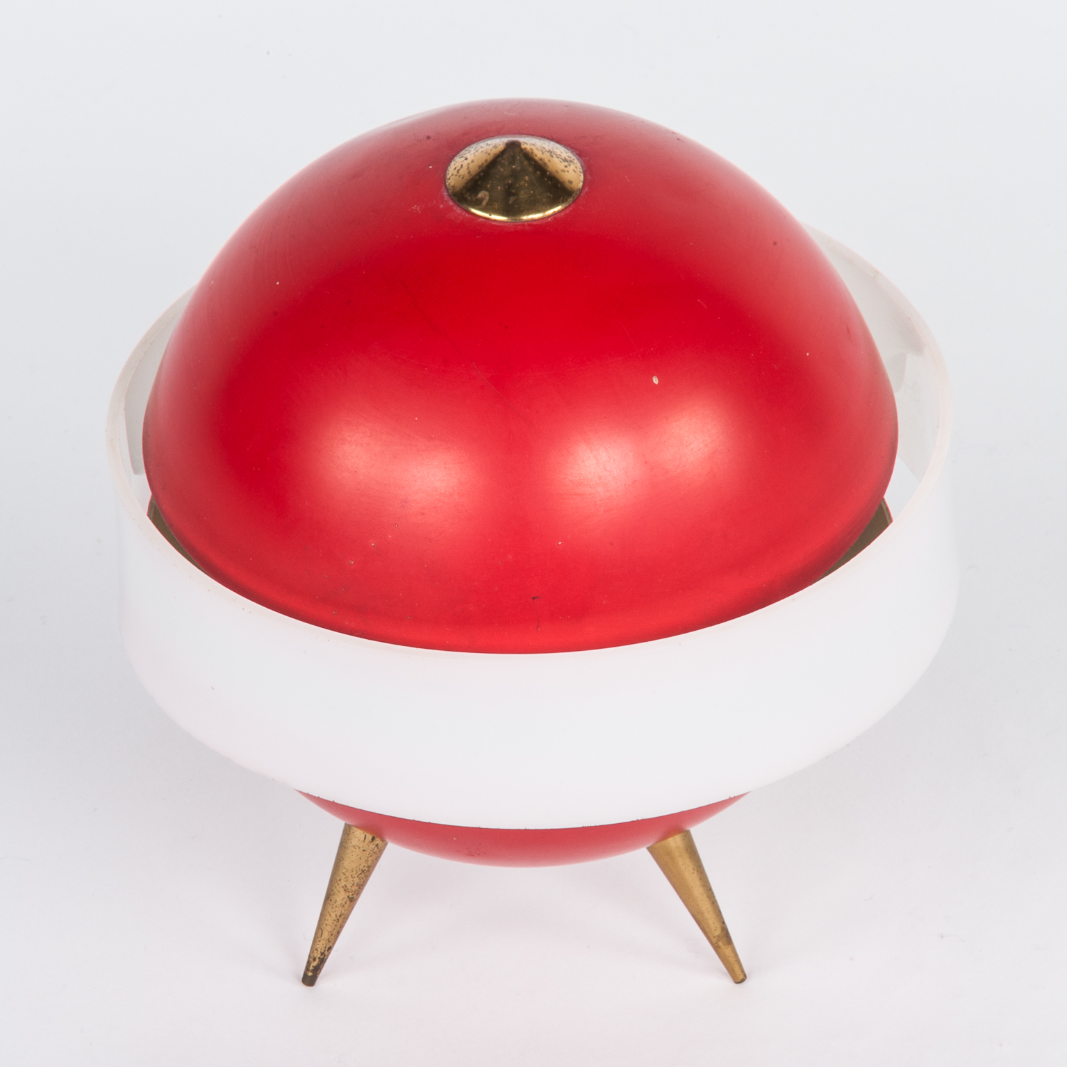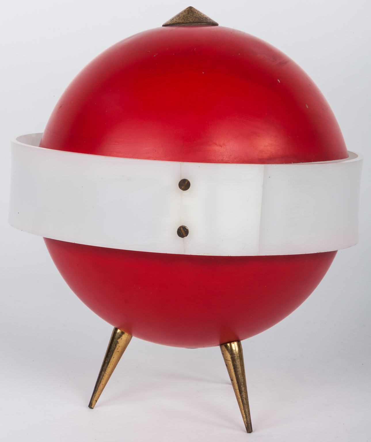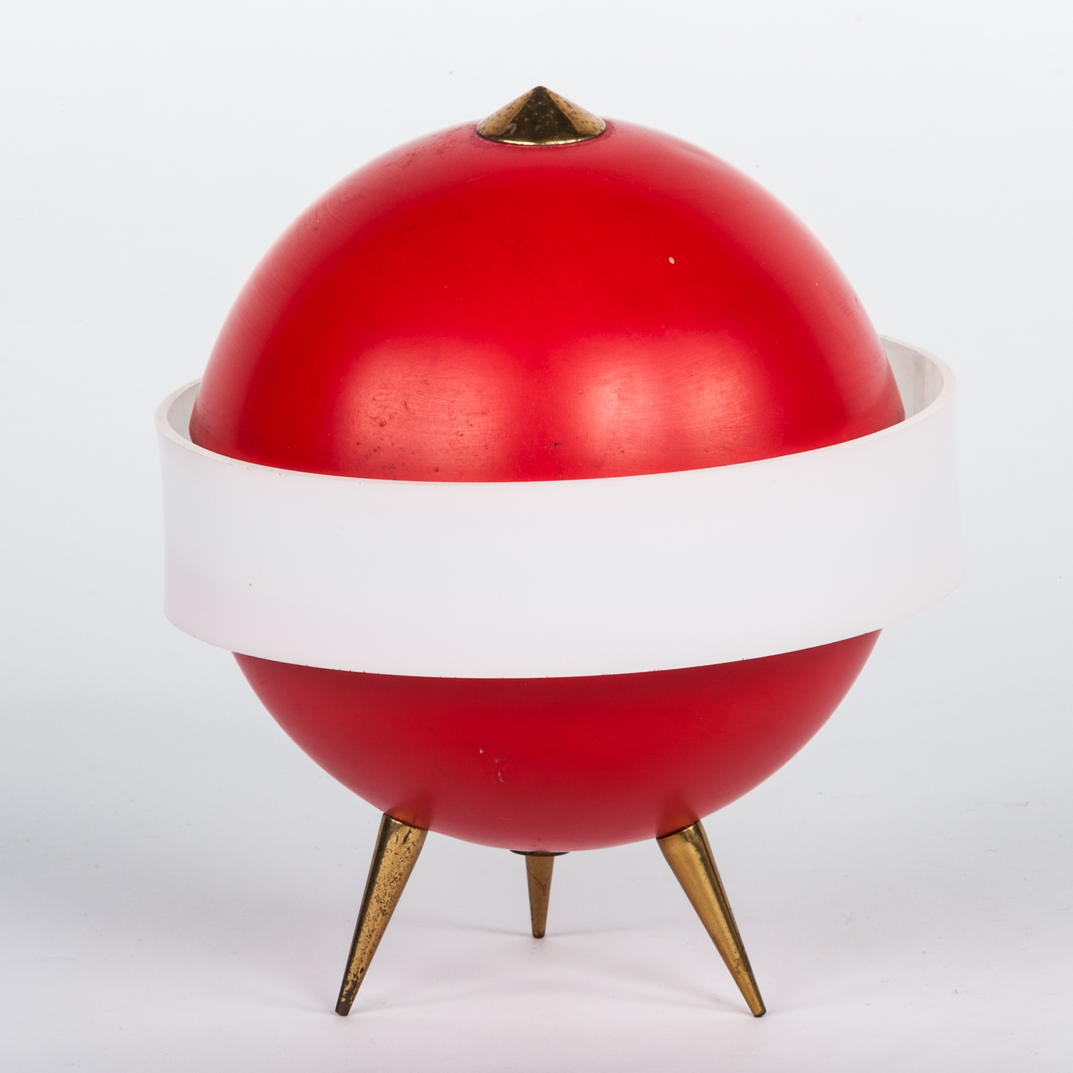 Red enamelled orb Standing on a Brass Tripod Base.