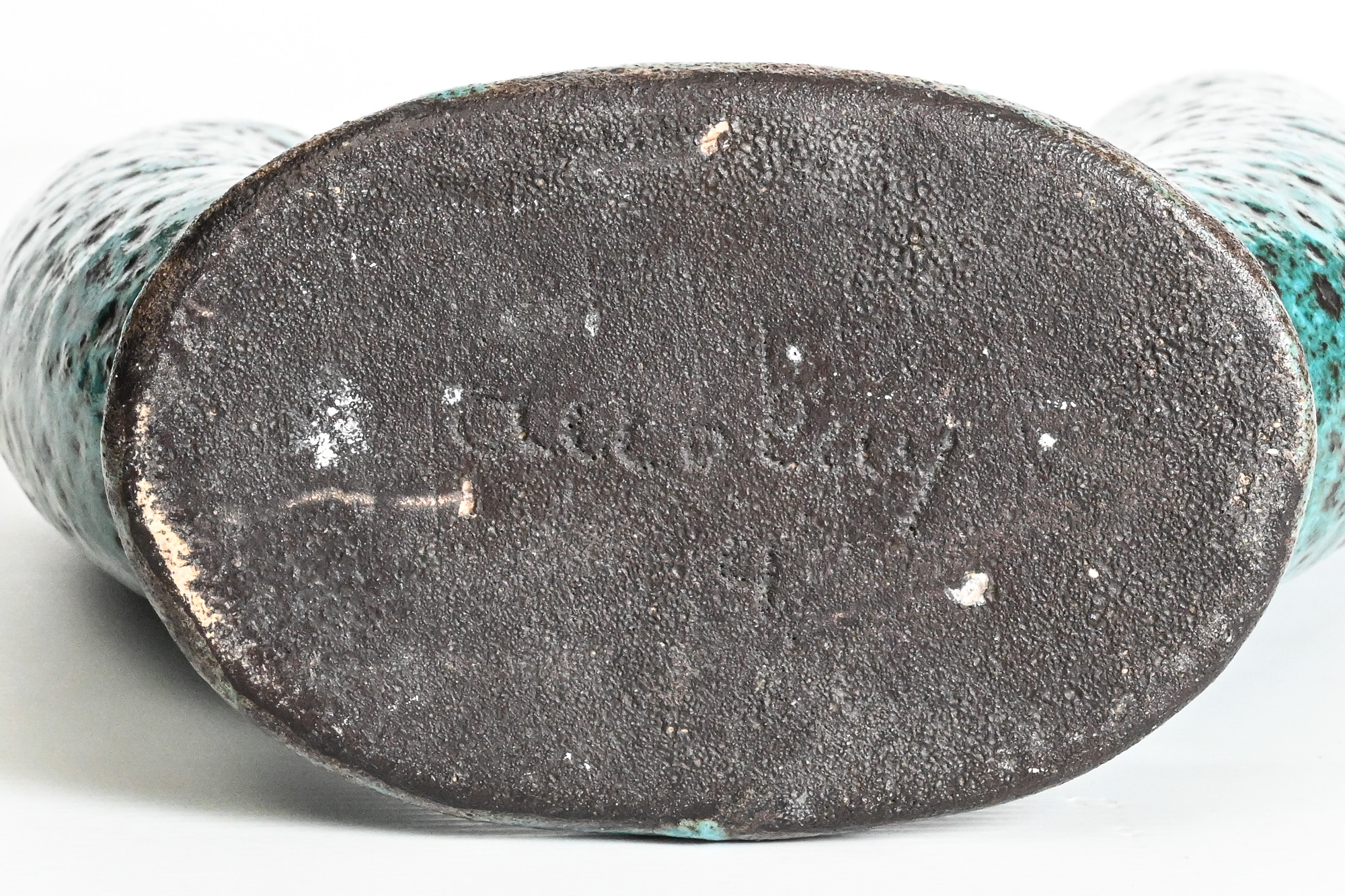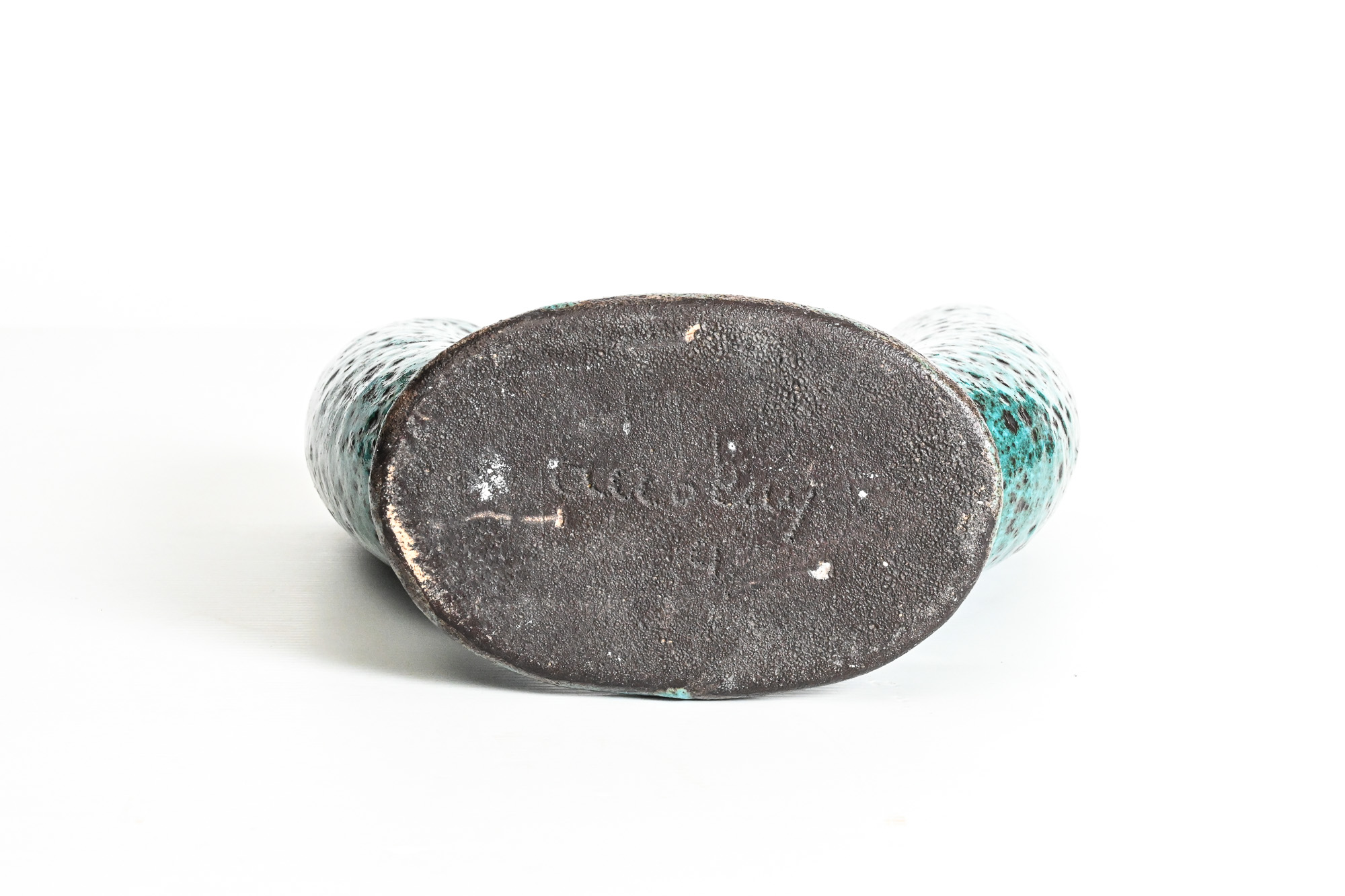 double neck U shaped ceramic vase in turquoise organic glaze signed to the underside by Accolay potteries France, circa 1950